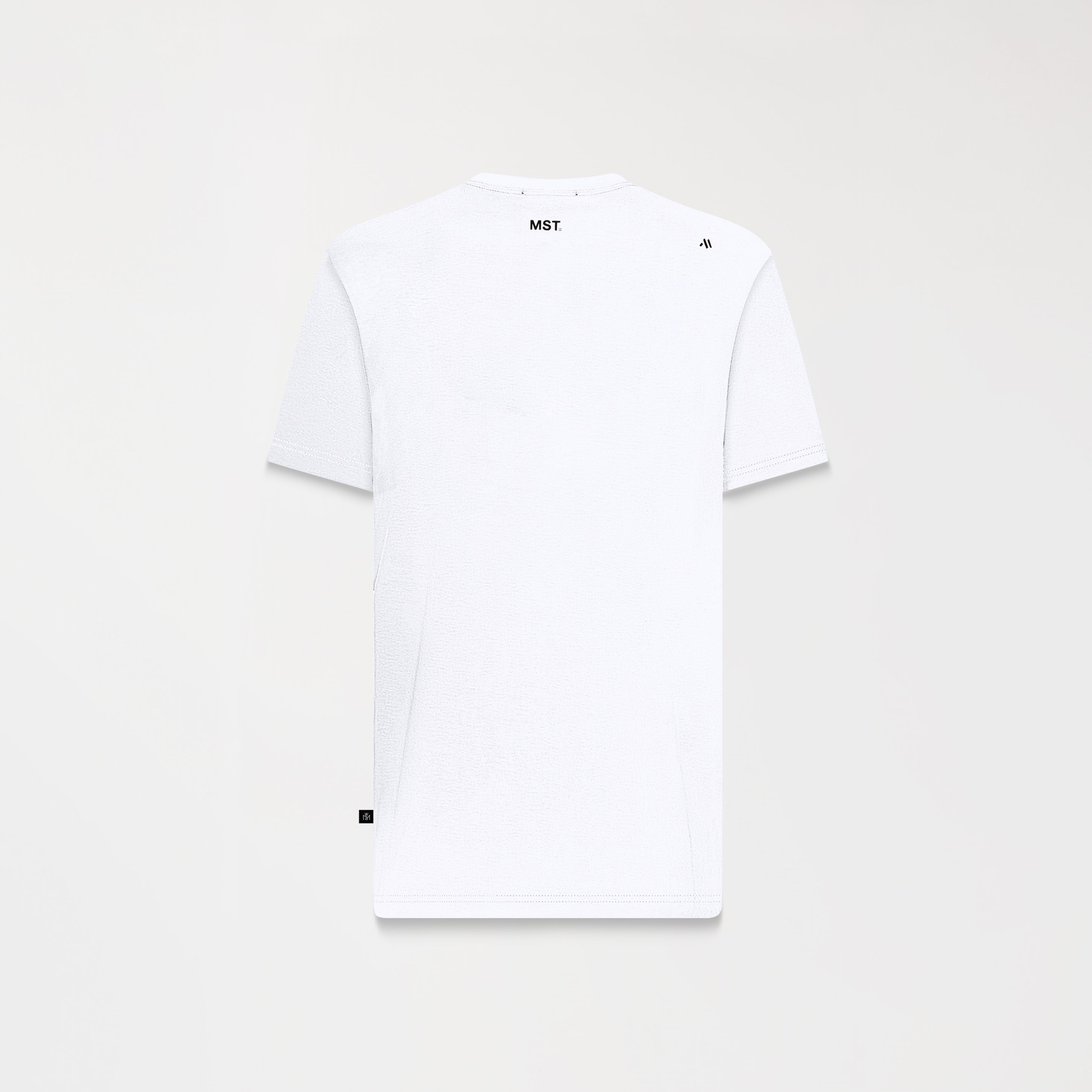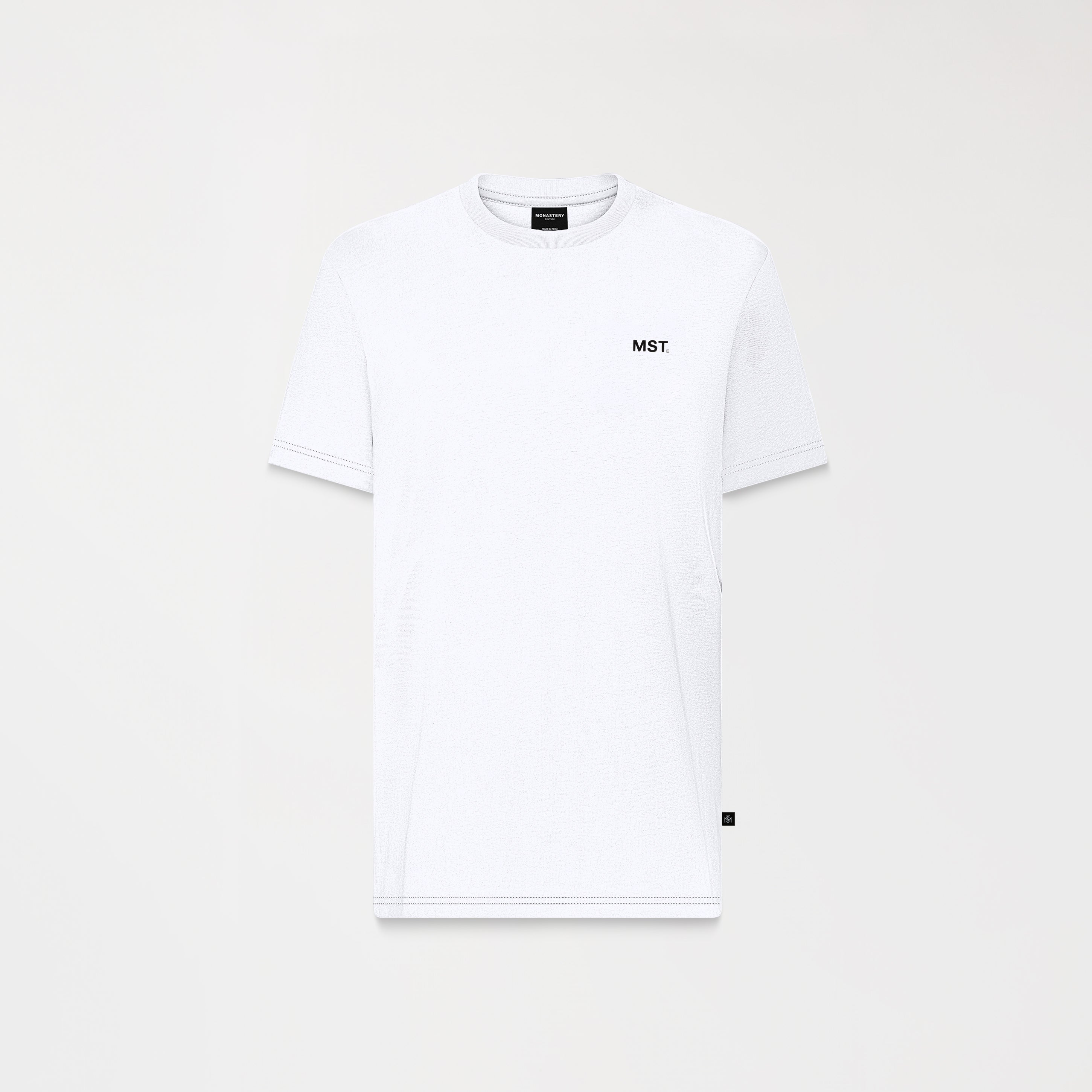 Atwood is a men's t-shirt made from 100% high-quality, ultra-silicone-coated cotton, treated to provide a soft-touch surface. The MST logo is applied using the flock technique at the heart, achieving a high-relief velvety finish. The back features a composition of the brand's traditional logos, also developed using the flock technique, which unifies the texture and provides visual coherence to the design.