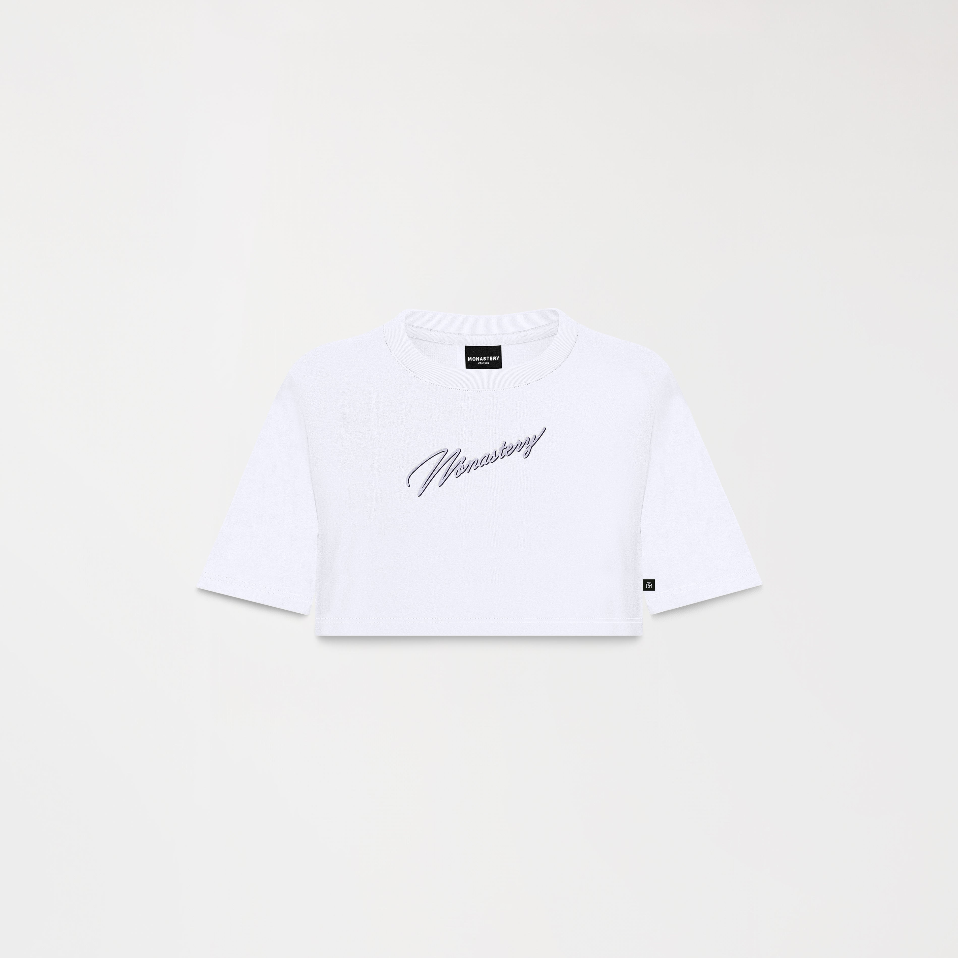 Small Silhouette Crop Top with Monastery logo on the front, made using a flat print technique for a clean and defined finish. The back features traditional logos printed using a high-density technique, providing texture and durability. Bret is made of high-quality Peruvian cotton, ensuring softness, durability, and comfort.