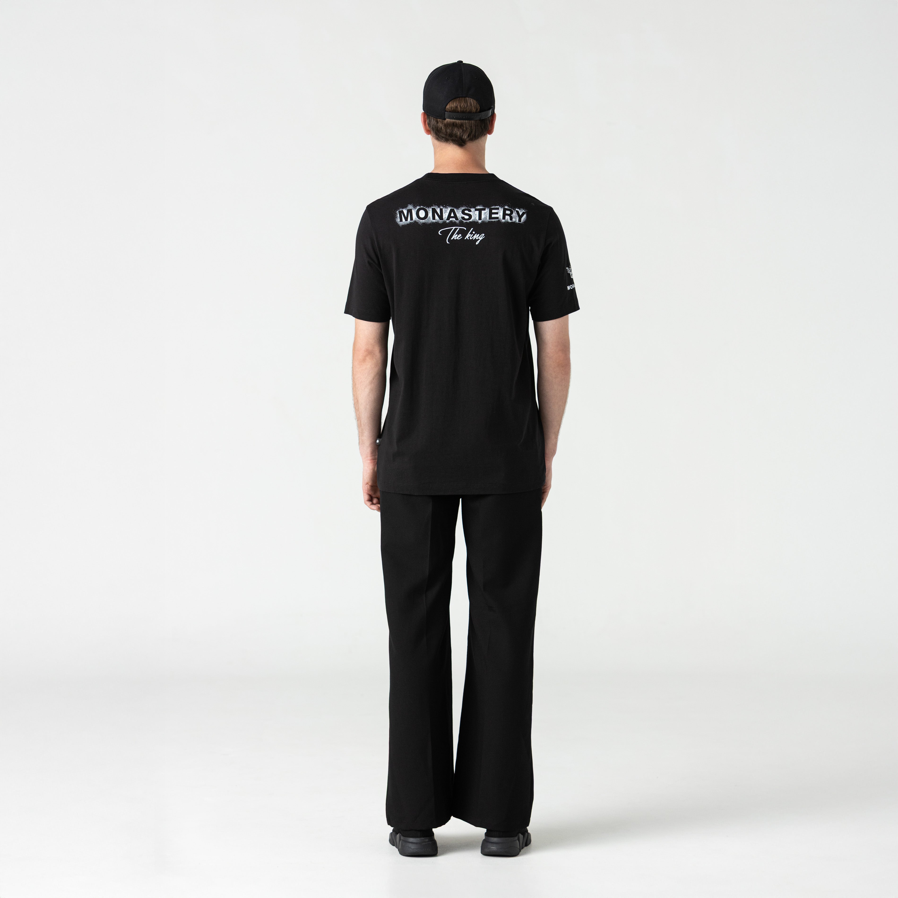 Brunar is a men's regular-fit t-shirt with a 2.5 cm collar, crafted from 100% Peruvian Pima cotton exclusively for Monastery. The right sleeve features a flat embroidery technique, creating a subtle and elegant effect, adding texture without being overly heavy, highlighting the design and adding a unique touch to the garment. On the back, two techniques are combined: plastisol and flat embroidery, complementing the design with a touch of texture and volume, creating an interesting contrast with the plastisol and lending a dynamic and contemporary style to the t-shirt. This multi-technique design allows for a versatile, modern, and high-quality garment, with carefully crafted details that make it stand out without losing the comfort and simplicity of a classic t-shirt.