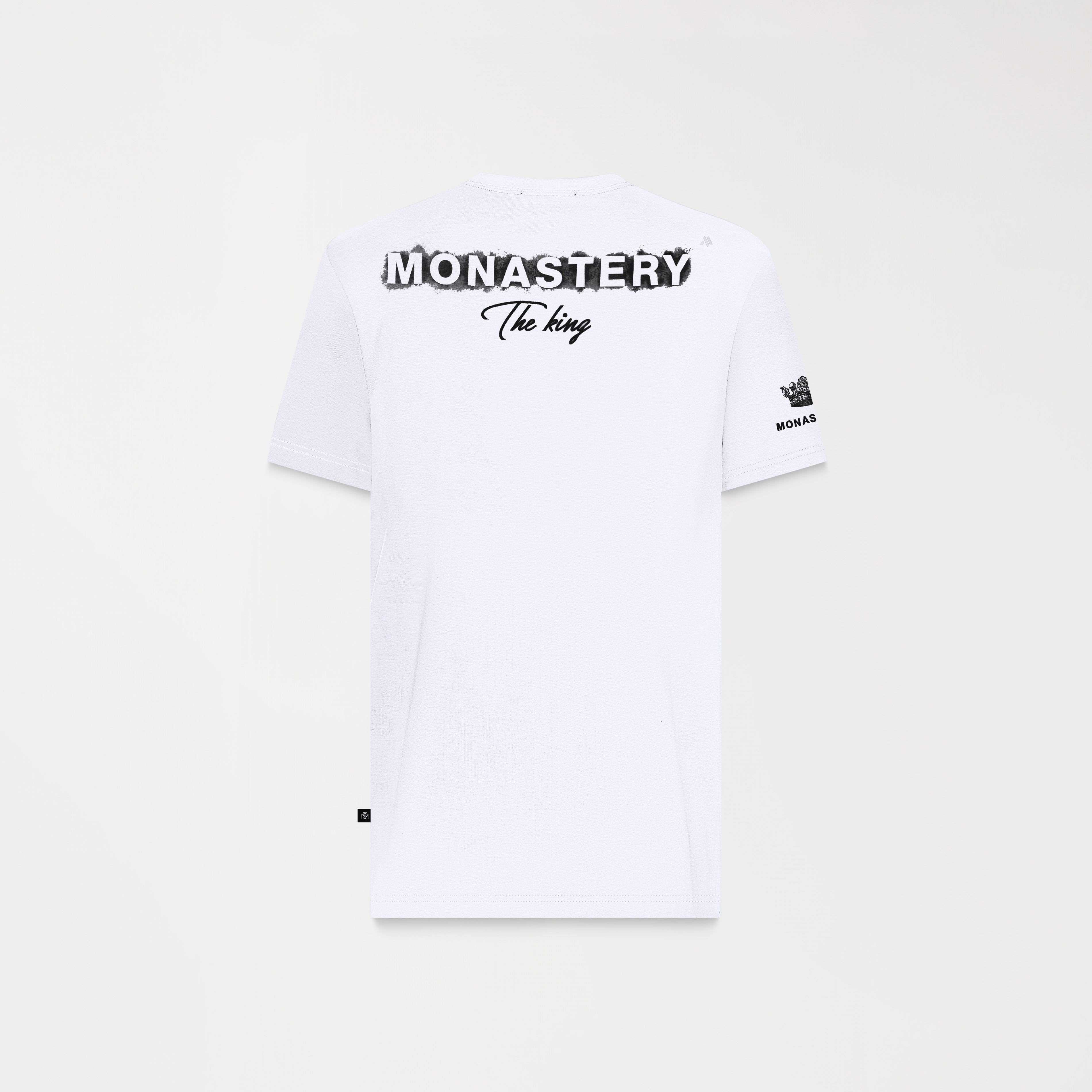 Brunar is a men's regular-fit t-shirt with a 2.5 cm collar, crafted from 100% Peruvian Pima cotton exclusively for Monastery. The right sleeve features a flat embroidery technique, creating a subtle and elegant effect, adding texture without being overly heavy, highlighting the design and adding a unique touch to the garment. On the back, two techniques are combined: plastisol and flat embroidery, complementing the design with a touch of texture and volume, creating an interesting contrast with the plastisol and lending a dynamic and contemporary style to the t-shirt. This multi-technique design allows for a versatile, modern, and high-quality garment, with carefully crafted details that make it stand out without losing the comfort and simplicity of a classic t-shirt.