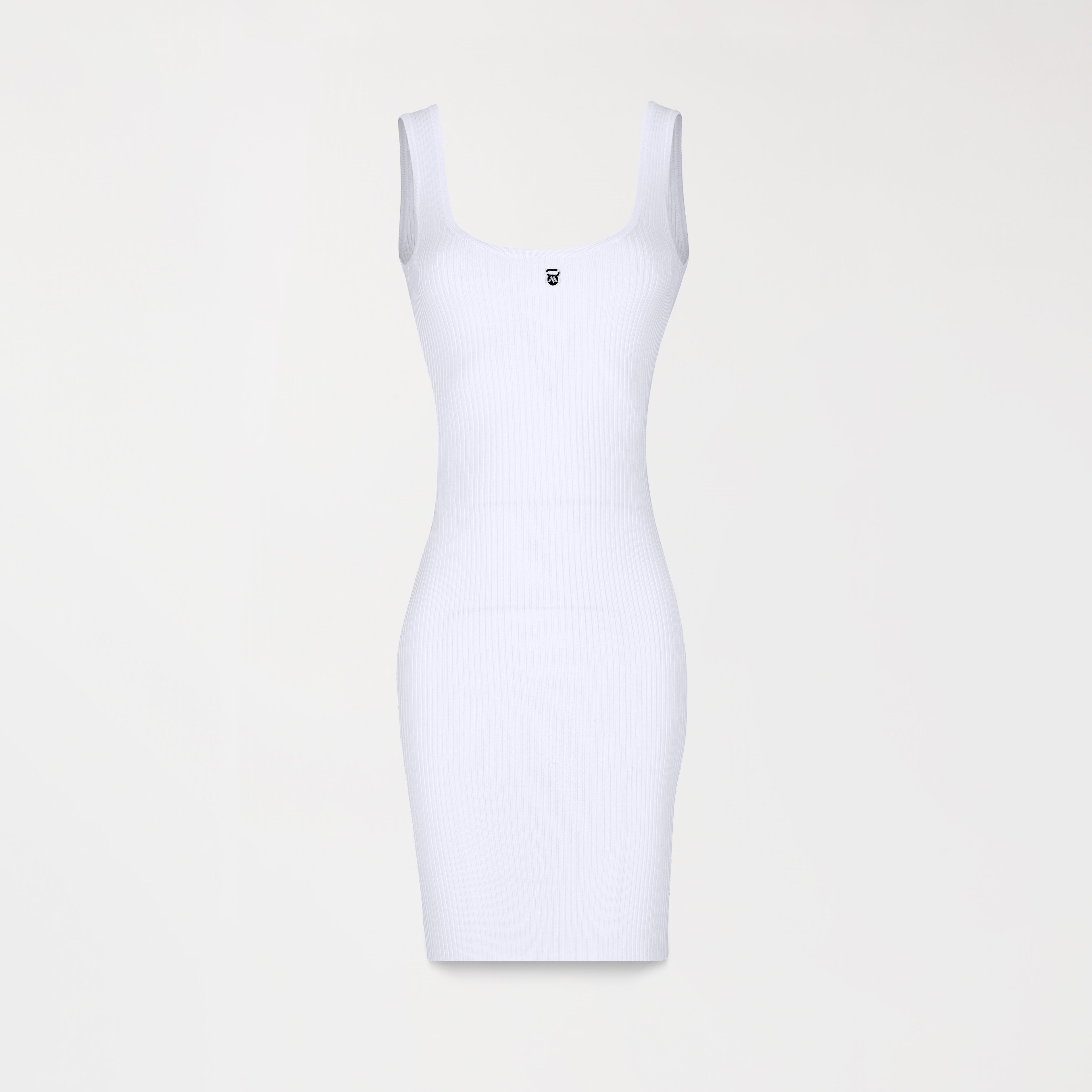 Knitted dress crafted in a basic silhouette with a ribbed textile base that allows it to fit your body, providing comfort, elegance, and versatility. Carla features a thin metallic plaque countermarked with the iconic logo on the front and classic embroidery on the back, ideal for a casual look or various occasions.