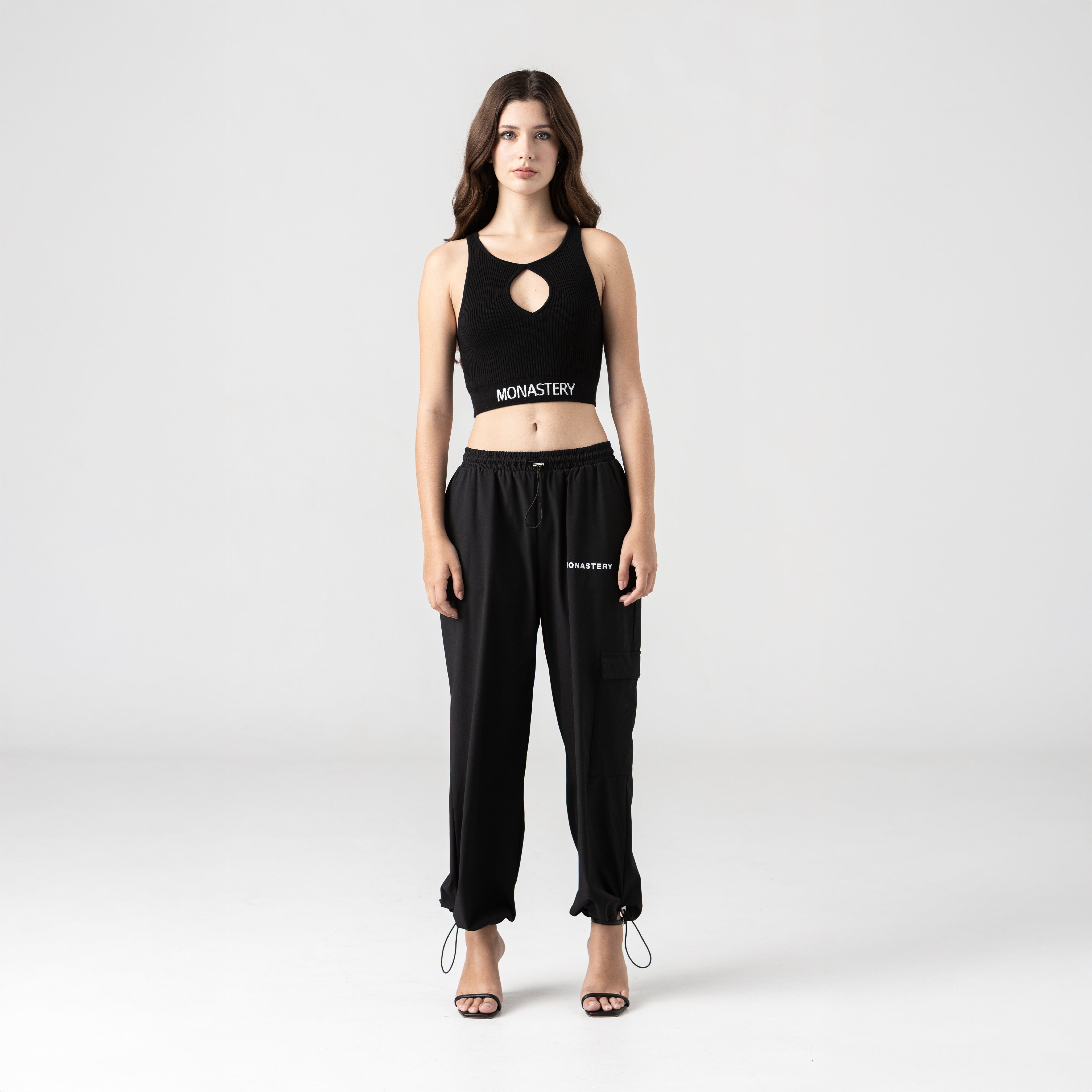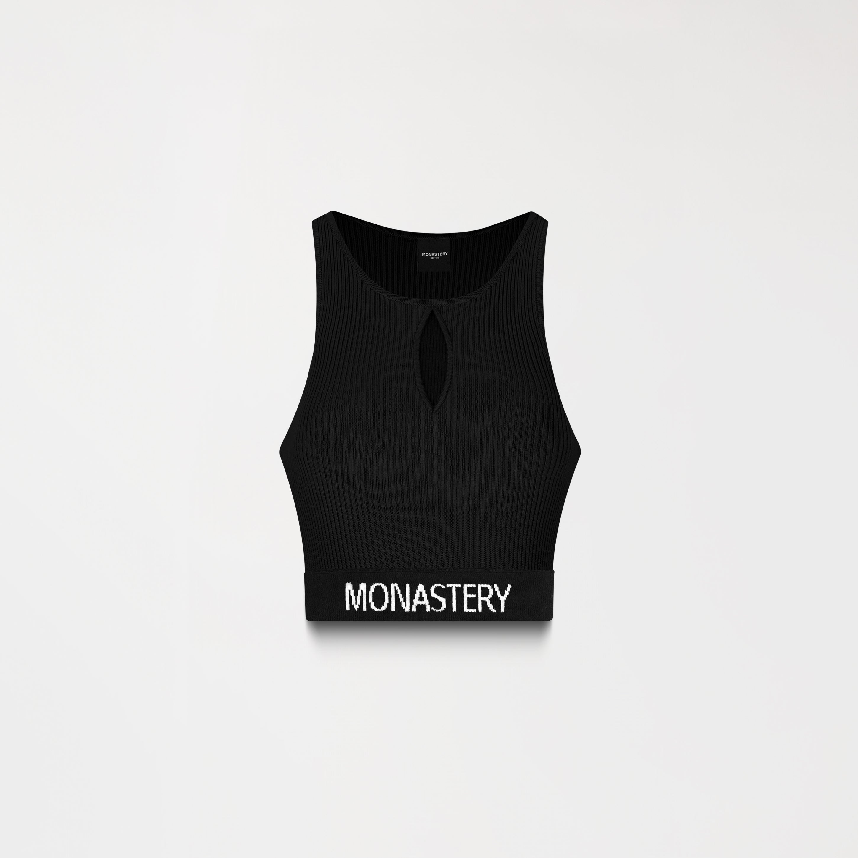 A feminine top crafted in an exclusive Monastery fabric, designed to stand out, combining a woven structure with a figure-flattering front neckline. The elastic waistband, visible on both sides of the garment, incorporates the Monastery logo as a distinctive seal of identity. On the back, the signature logo is embroidered using a flat technique, providing contrast and character. This garment is designed for those seeking a balance between shape, presence, and subtle design.