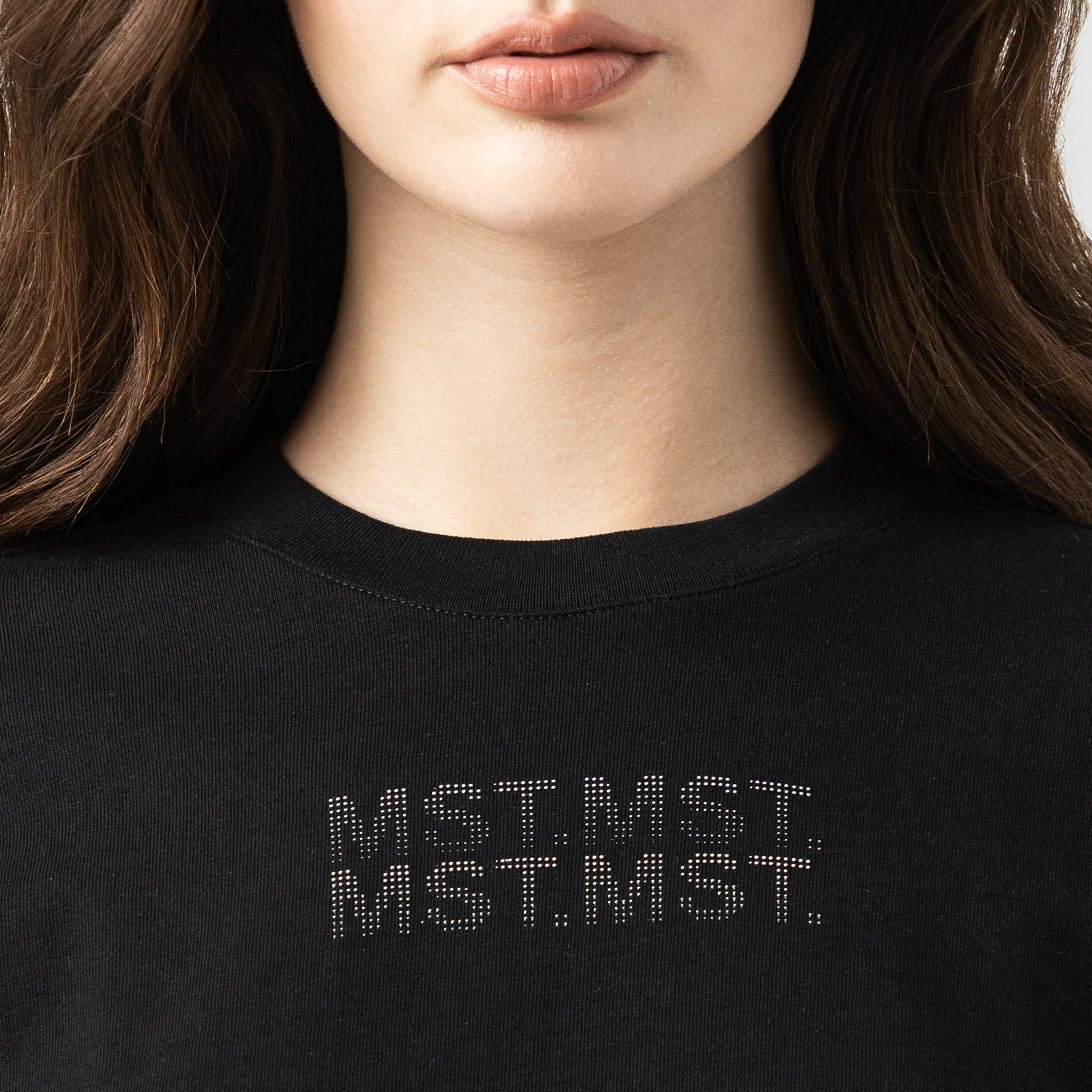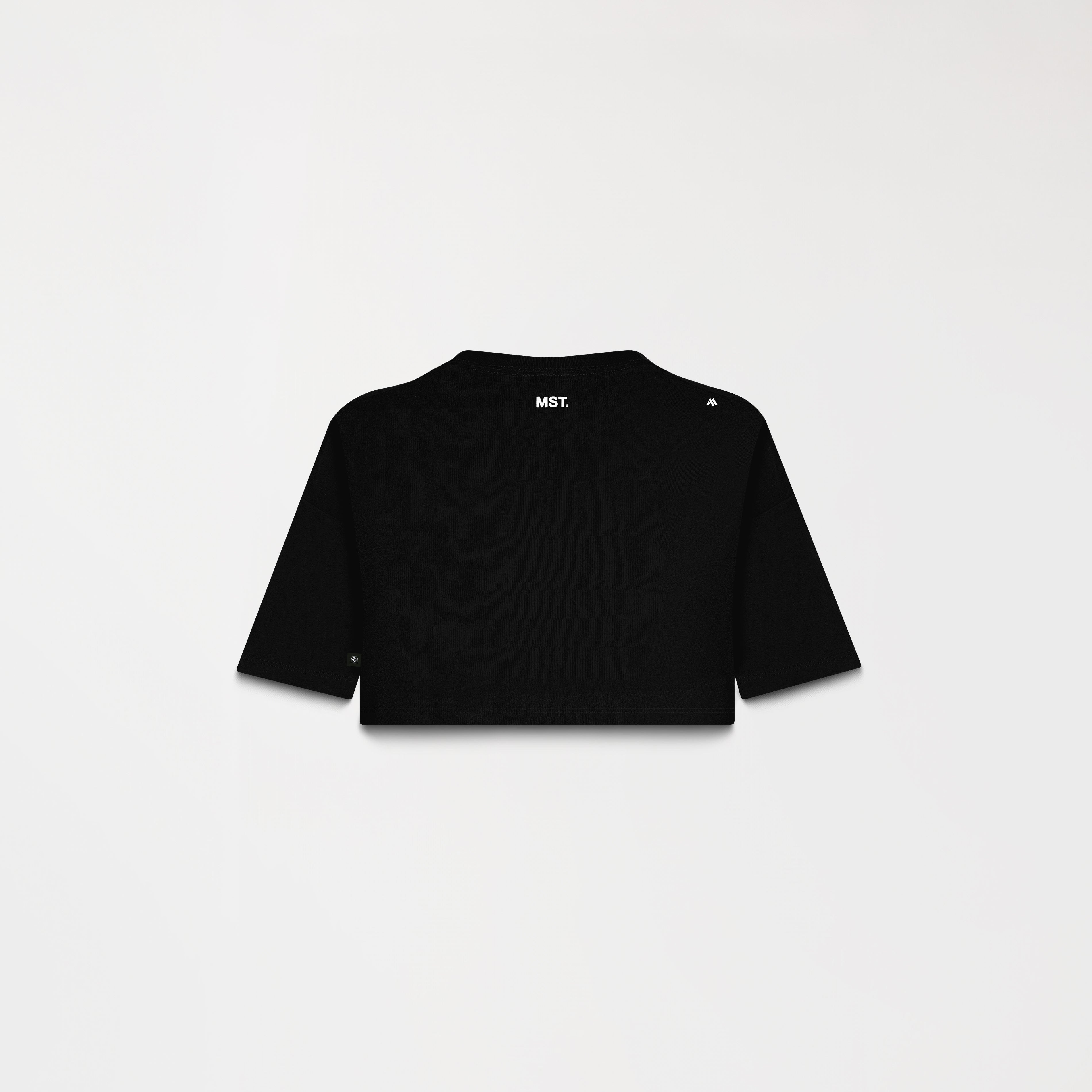 A crop top with a small silhouette featuring MST artwork on the front using a high-density brush technique, a design that adds texture and relief. The back features traditional logos in flat plastisol, achieving a balance between originality and classic style. River is a design made from high-quality Peruvian cotton, ideal for an urban look with personality.