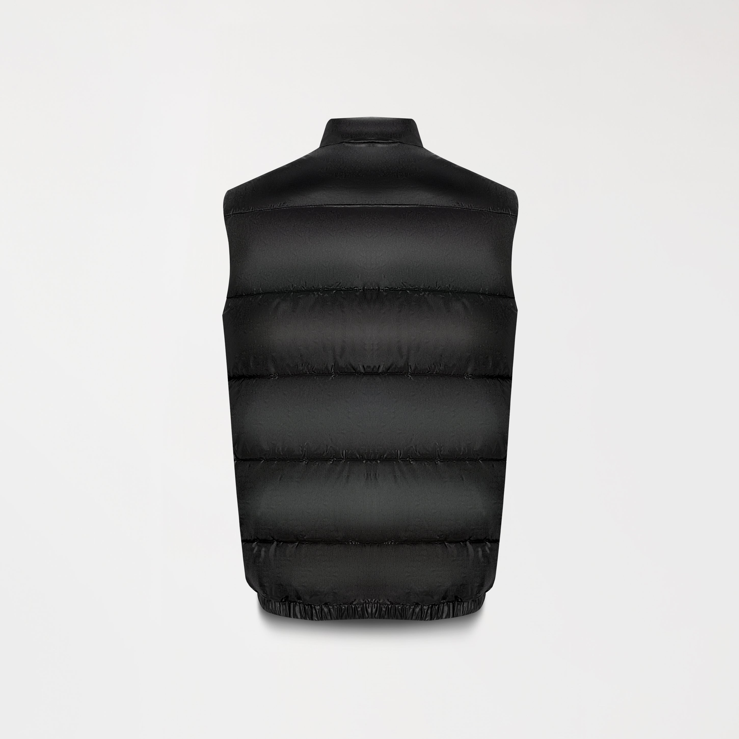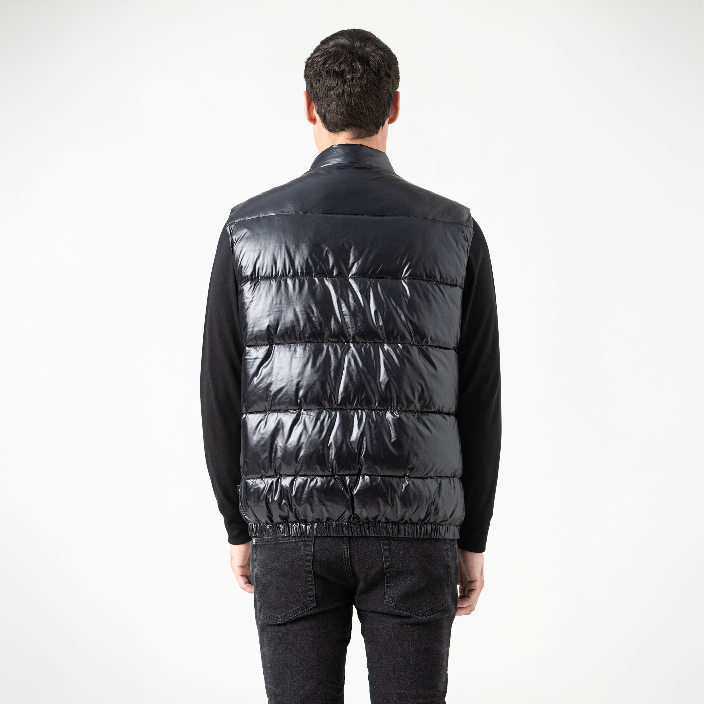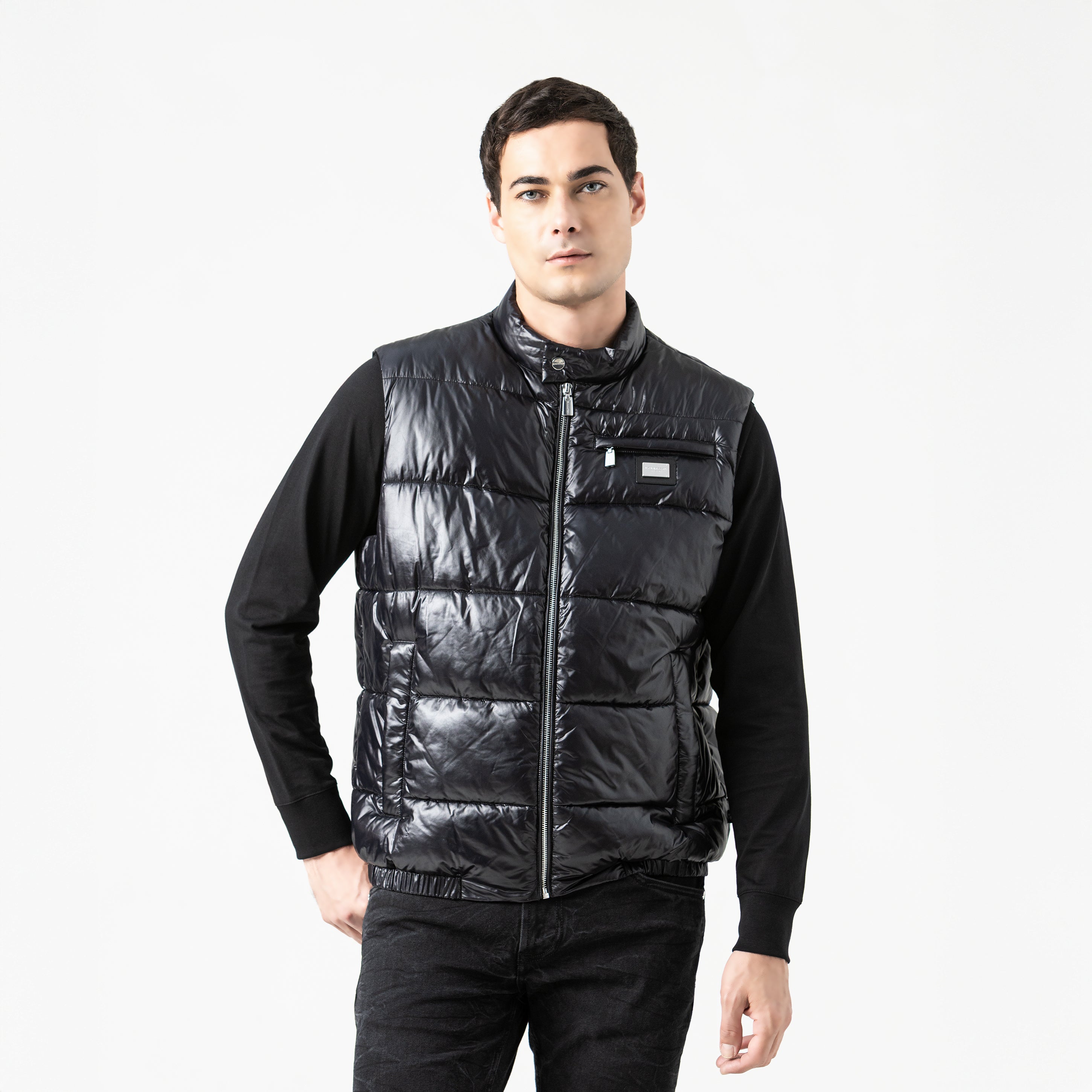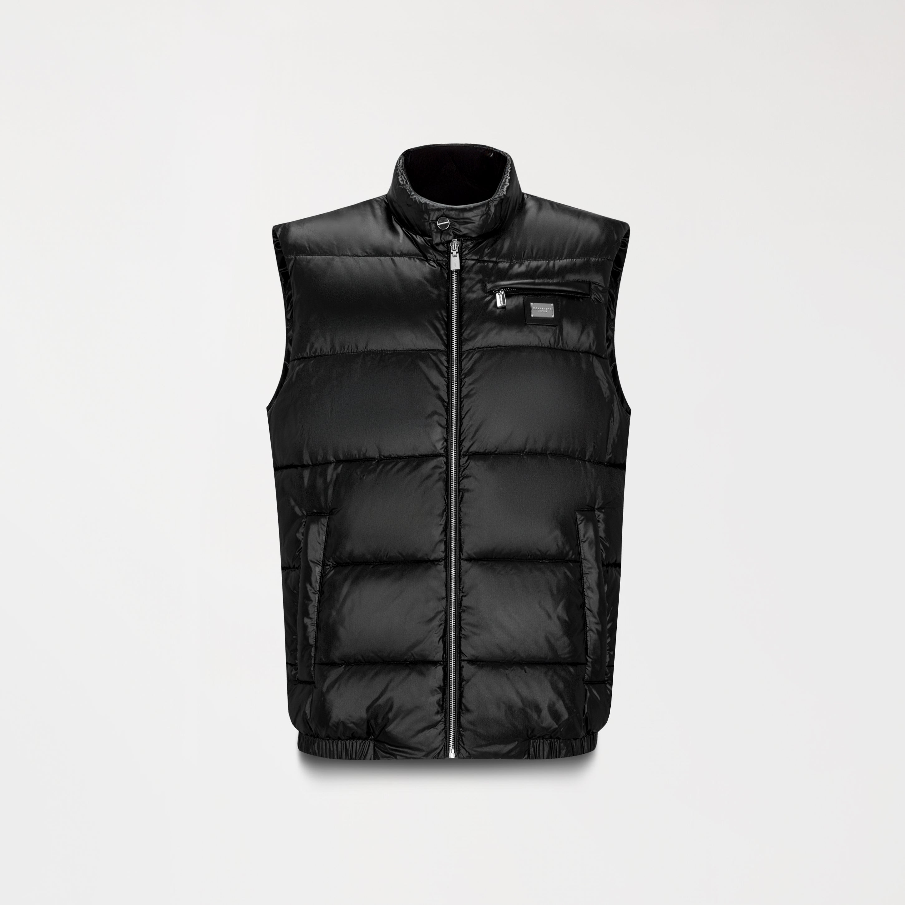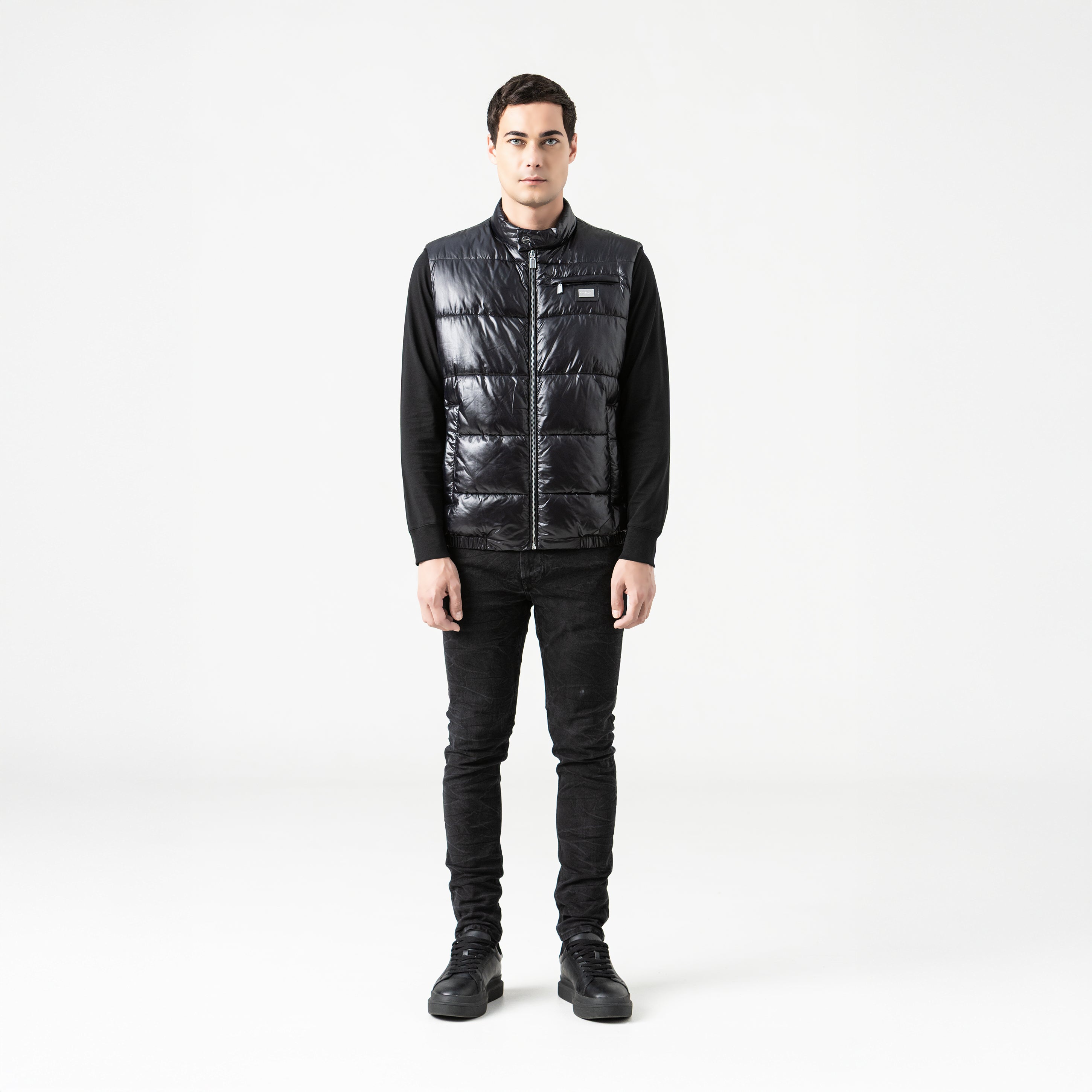 Black puffed vest, ideal for complementing urban looks with style and functionality. It features a metallic appliqué on the front and exposed zippers, giving it a modern and industrial feel. The design includes a high collar for added coverage and a side zipper on the left side, adding a distinctive asymmetrical detail. Made of high-quality MST polyamide.