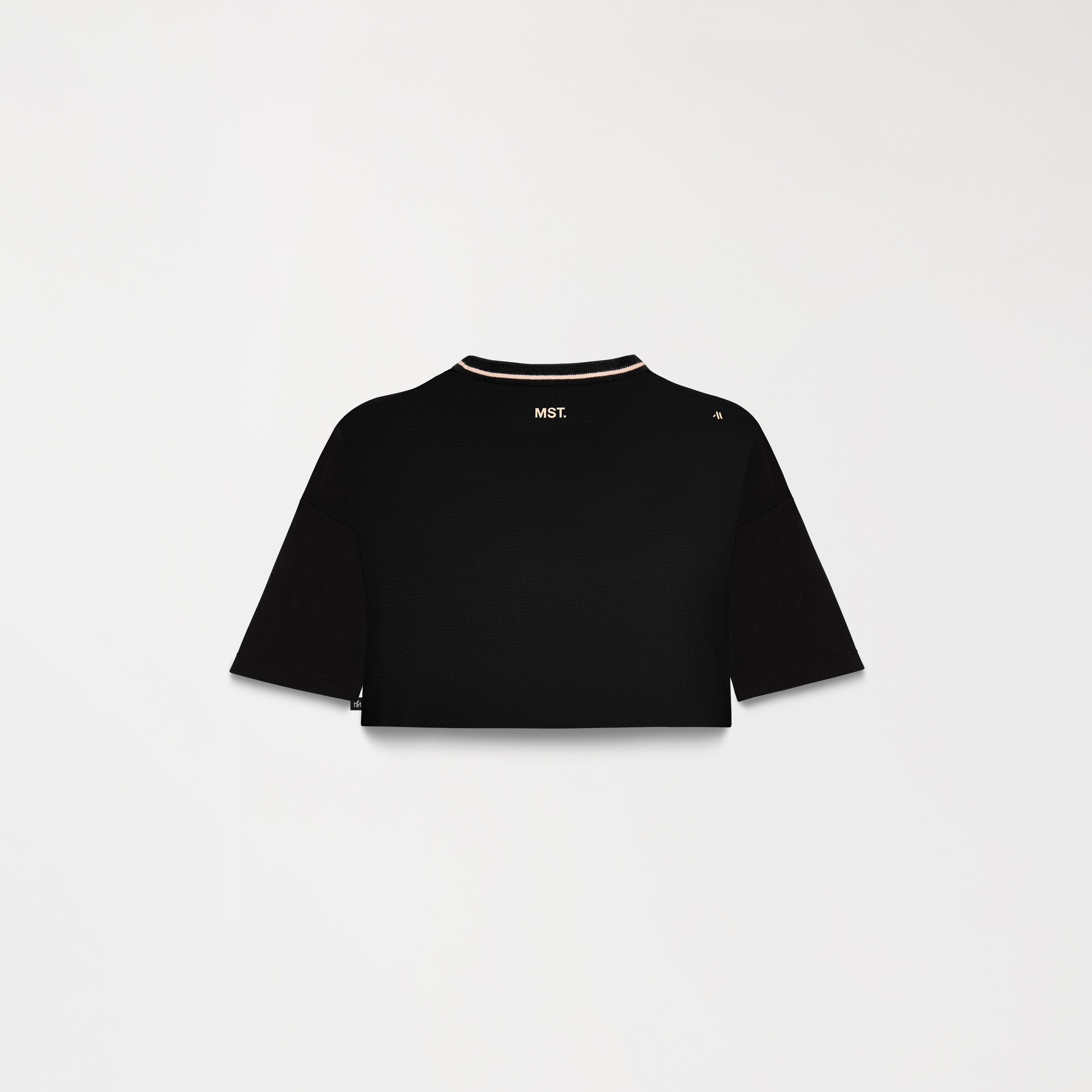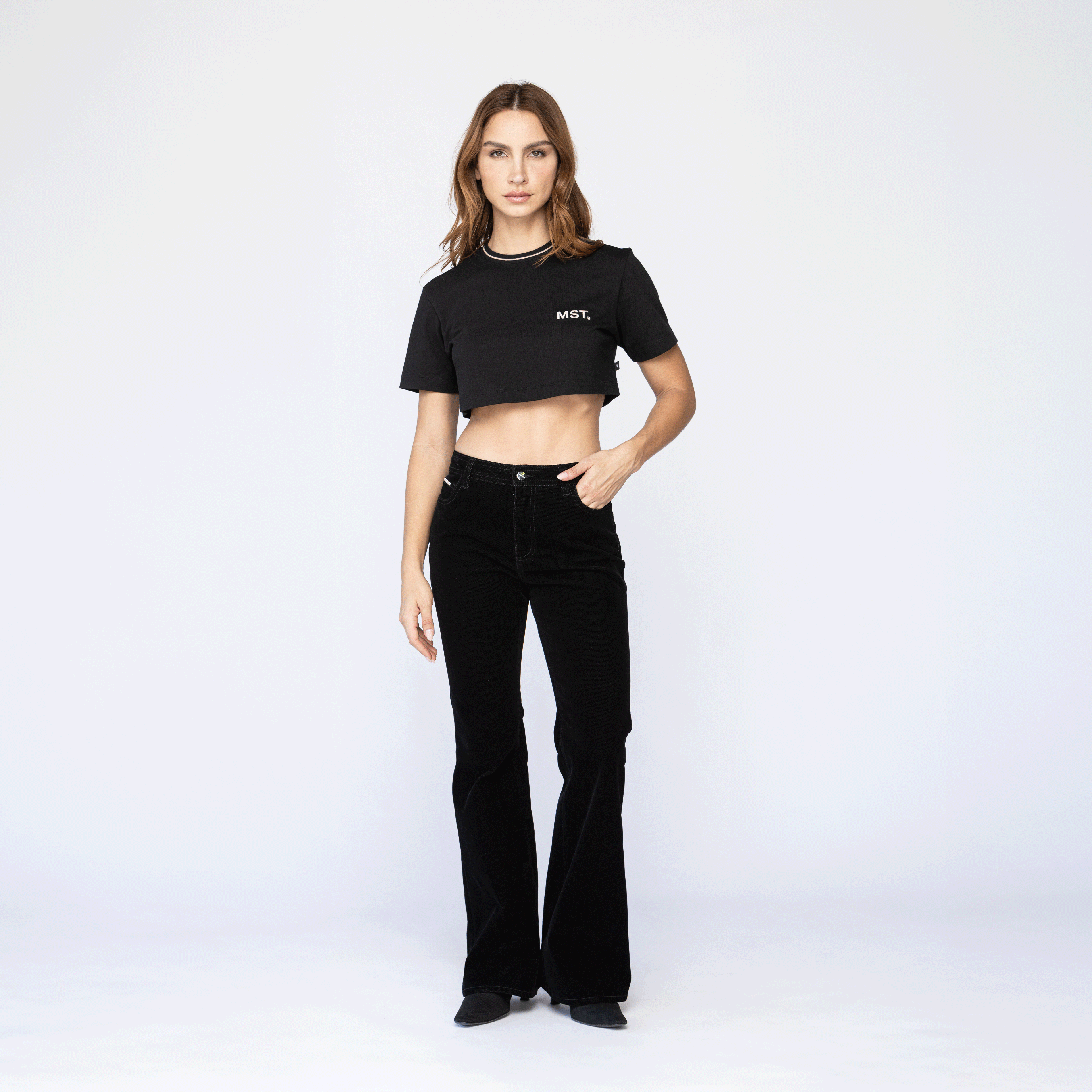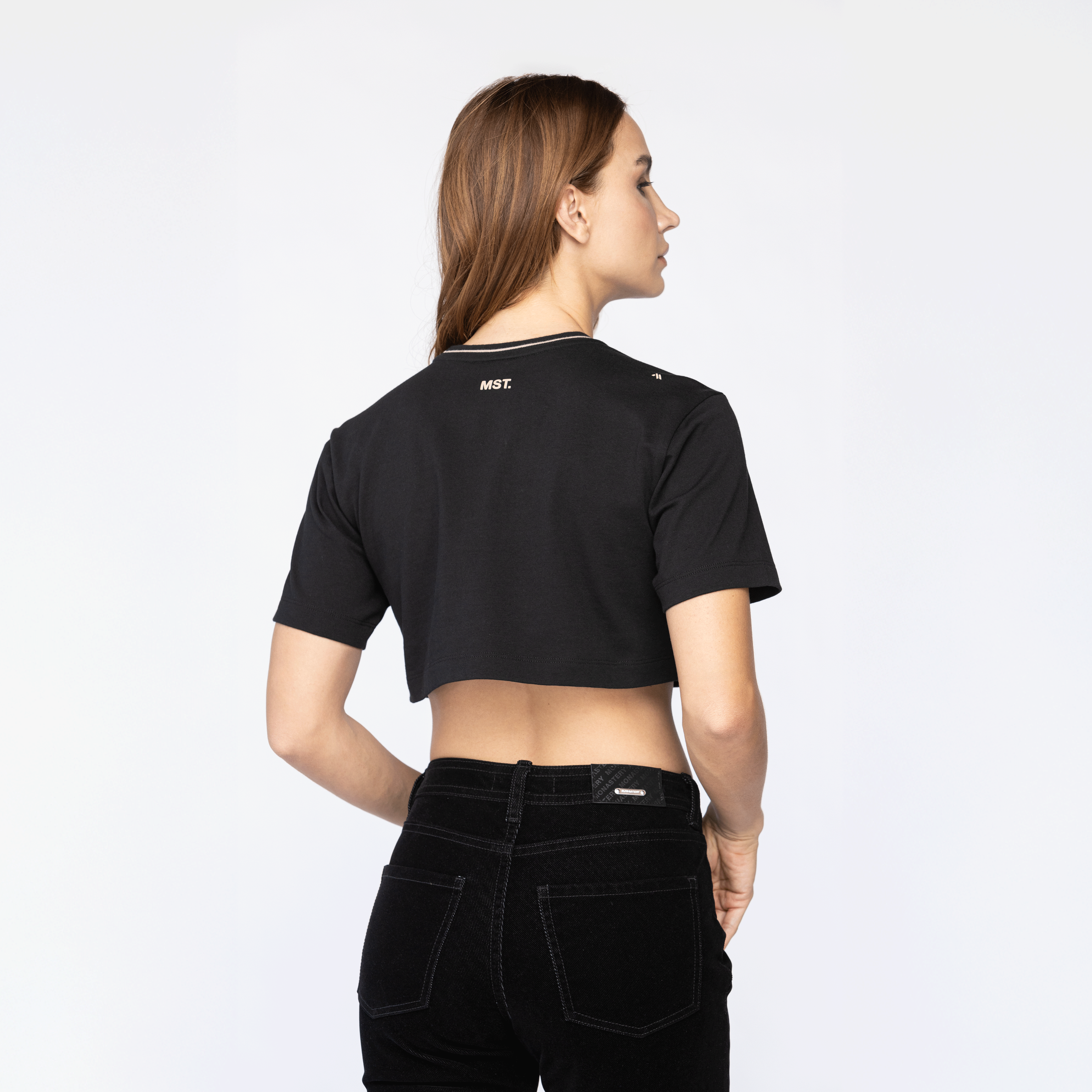 Women's 100% cotton crop top exclusive to Monastery, made in a petite silhouette, Elden features a heart stitch embroidery of the iconic MST logo, which adds a relevant touch of the brand identity, this reference has a straight knit collar which is a versatile option, perfect to combine with a variety of outfits.