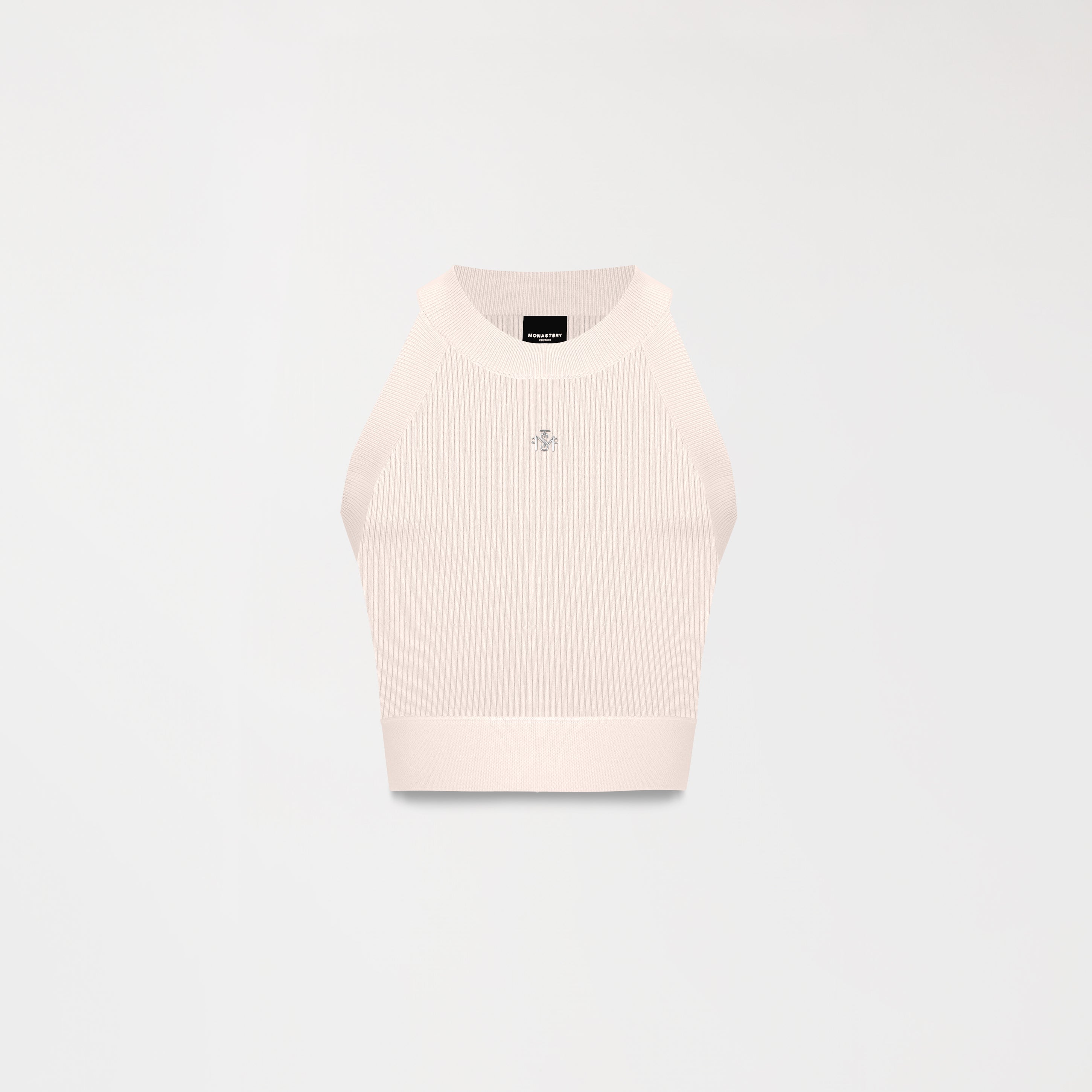 Fairy women's top made from Monastery fabric, an exclusive textile base that offers softness and structure. It features a halterneck silhouette that stylizes the neckline. Both the front and back feature subtle metallic appliqués that, without being overpowering, add a distinctive and sophisticated touch to the design.