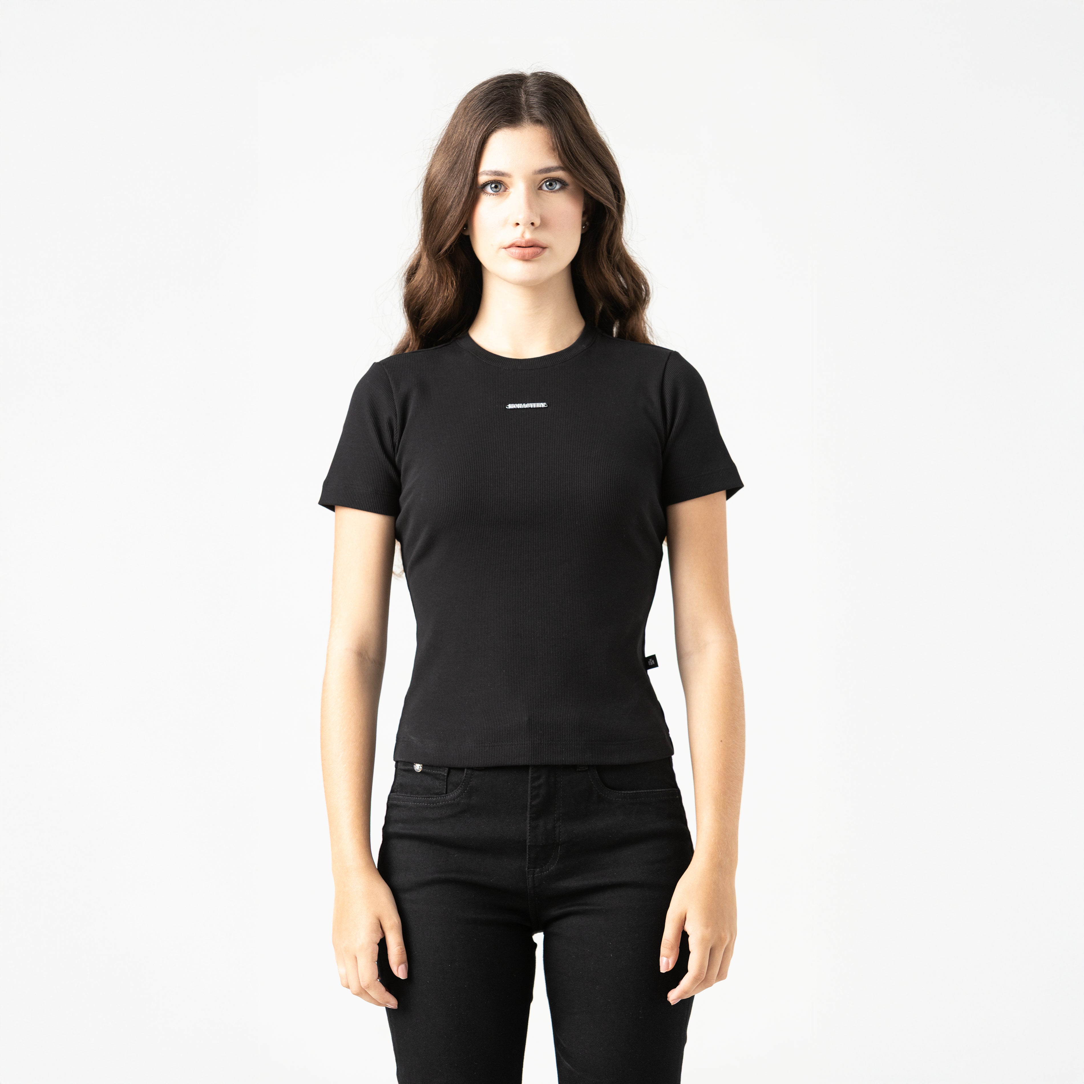 The Faiza women's T-shirt is made from Monastery Rib, a textile base that provides a snug fit and comfortably enhances the feminine silhouette. Designed in a small silhouette, this garment stands out with its Monastery metallic appliqué on both the front and back, giving it a contemporary and elegant look. The high-quality, shiny silver-tone hardware complements its refined aesthetic, making it an ideal choice for those who value design with character and sophistication.