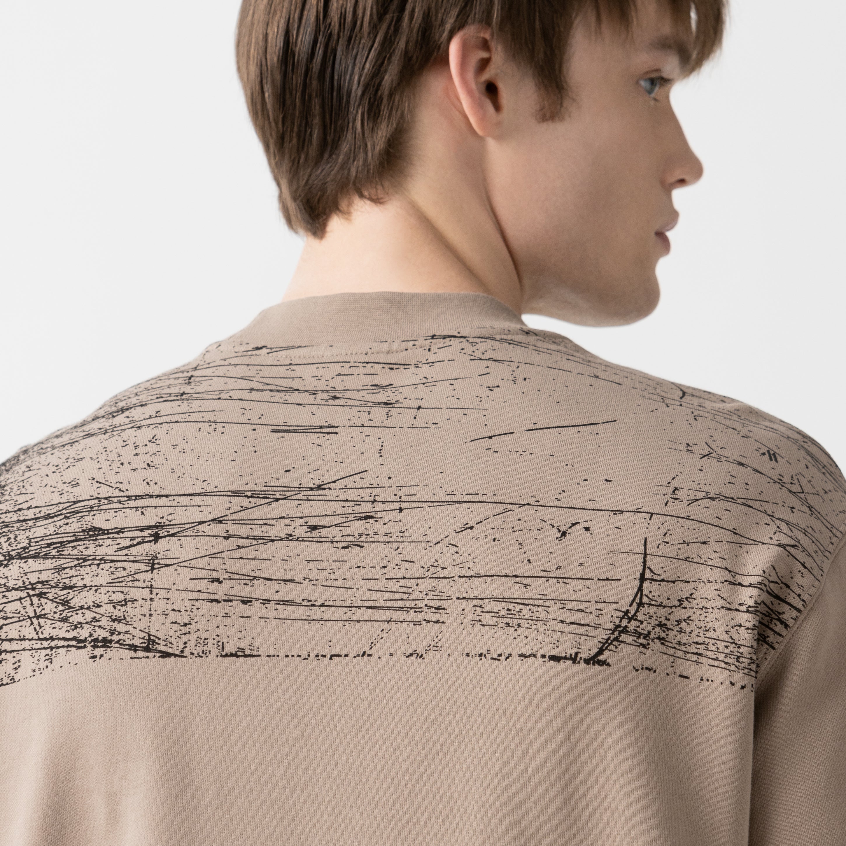 Su diseño incluye un cuello en rib de 2 cm, que aporta carácter y definición. En el frente y la espalda, los estampados en técnica de corrosión crean un contraste visual potente, resaltando la identidad gráfica de la prenda.