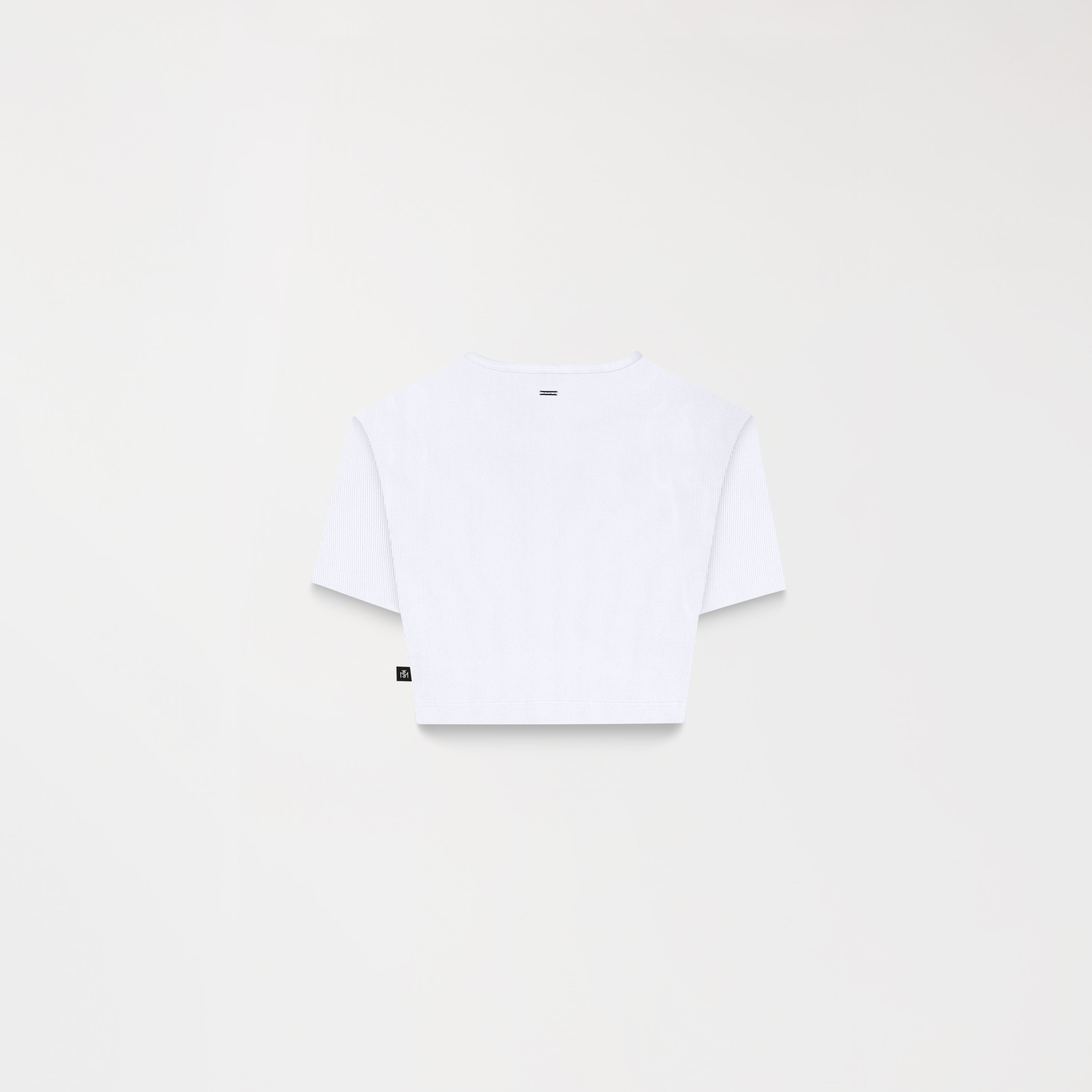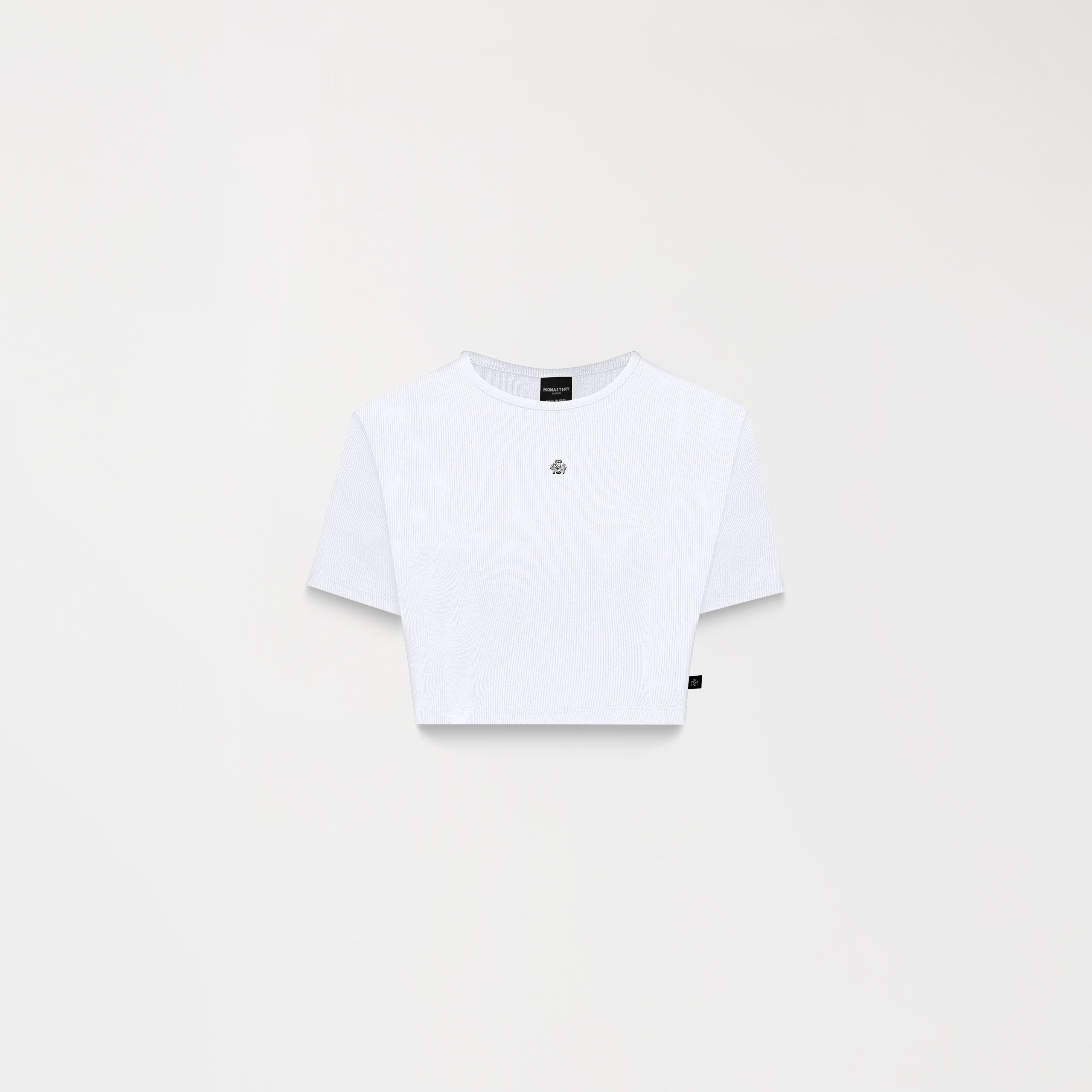 A feminine crop top crafted in a small silhouette designed to highlight the feminine figure, crafted in Monastery Rib for a better fit. Godiva features a metallic TSM appliqué on the front and Monastery logo on the back. It offers an elegant and contemporary look thanks to its high-quality, shiny silver fabric.