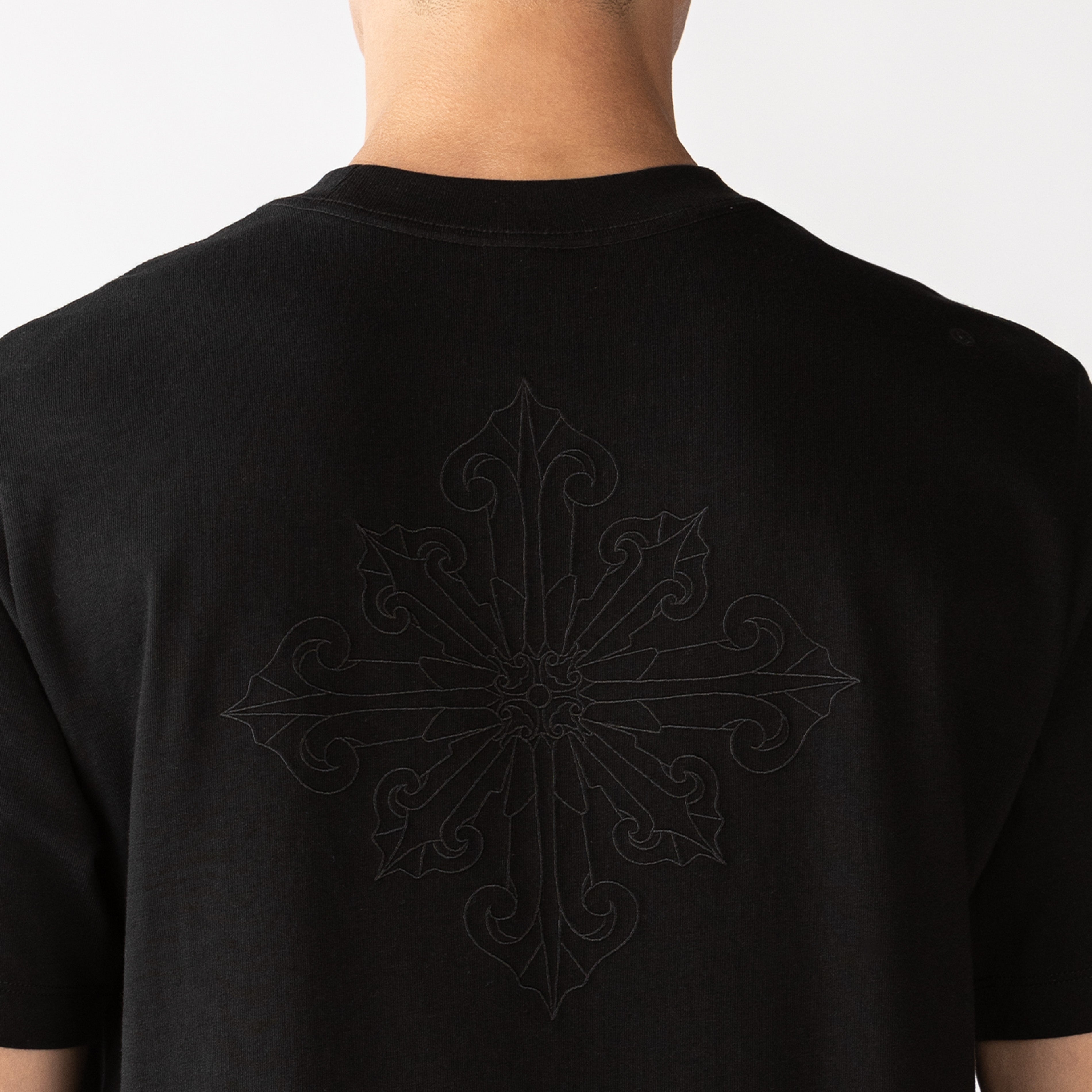 Back technique: Classic logo badge print and cross in 3D embroidery