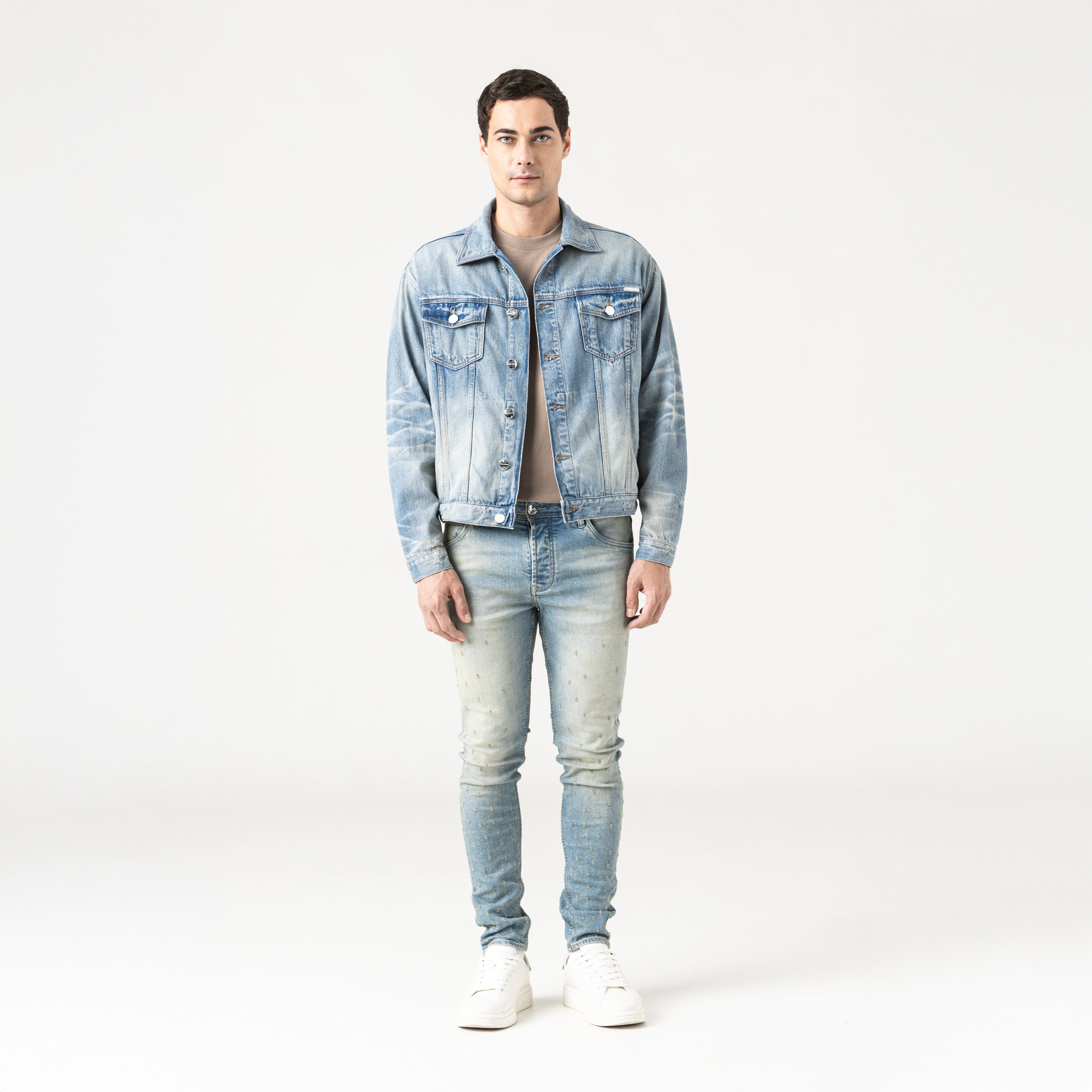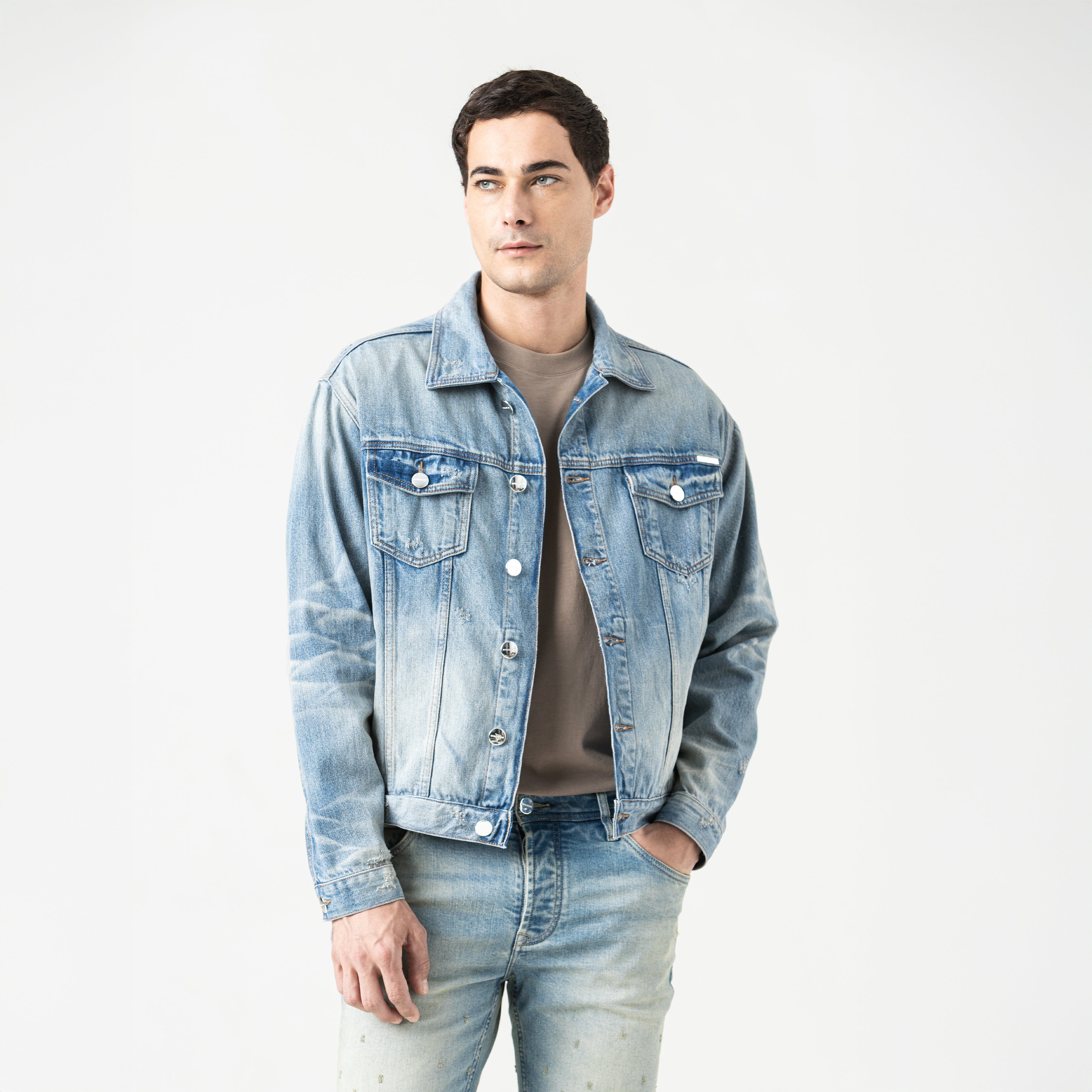 The Izan men's jacket is crafted from high-quality denim, blending structure and style in a contemporary design. Its contrasting metallic details are complemented by a shiny silver finish, adding a bold and sophisticated visual effect. The specialized laundry process highlights the texture of the fabric and adds unique nuances, lending it character and authenticity. A piece designed to stand out in urban looks with personality, where every detail communicates strength and distinction.