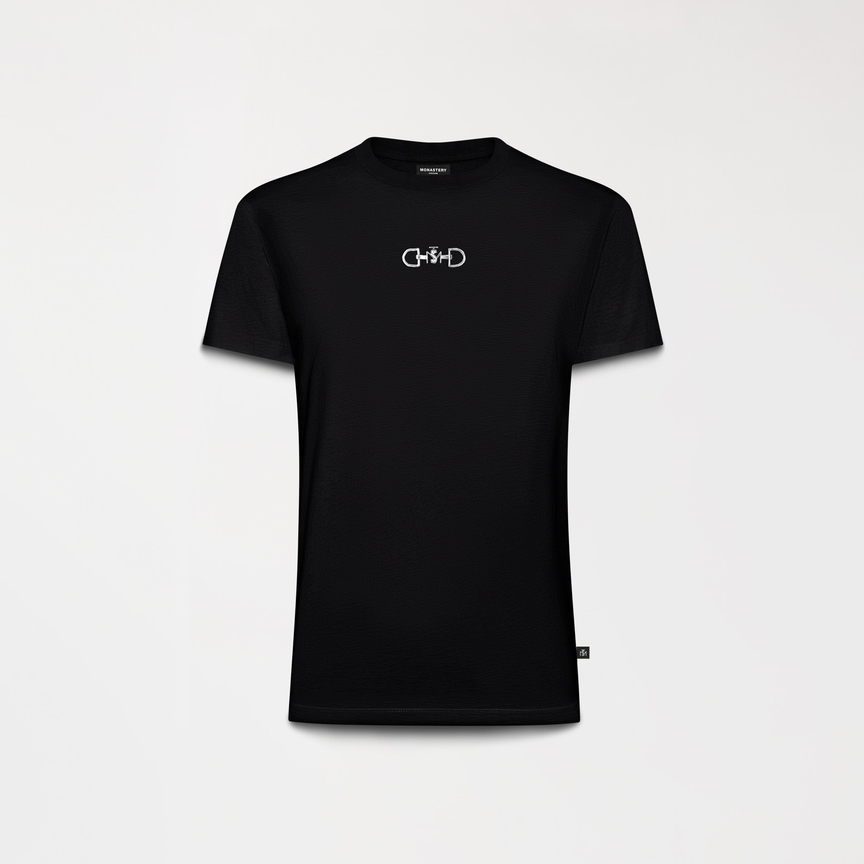 A feminine T-shirt crafted in a small silhouette designed to highlight the feminine figure through its fresh, fitted textile base. Jane is a garment with a high-quality, shiny silver Monastery metallic appliqué on the front and flat-printed insignia logos on the back. Ideal for those looking for a unique and comfortable garment, this T-shirt easily adapts to any casual look with details that give it a distinctive and modern touch.