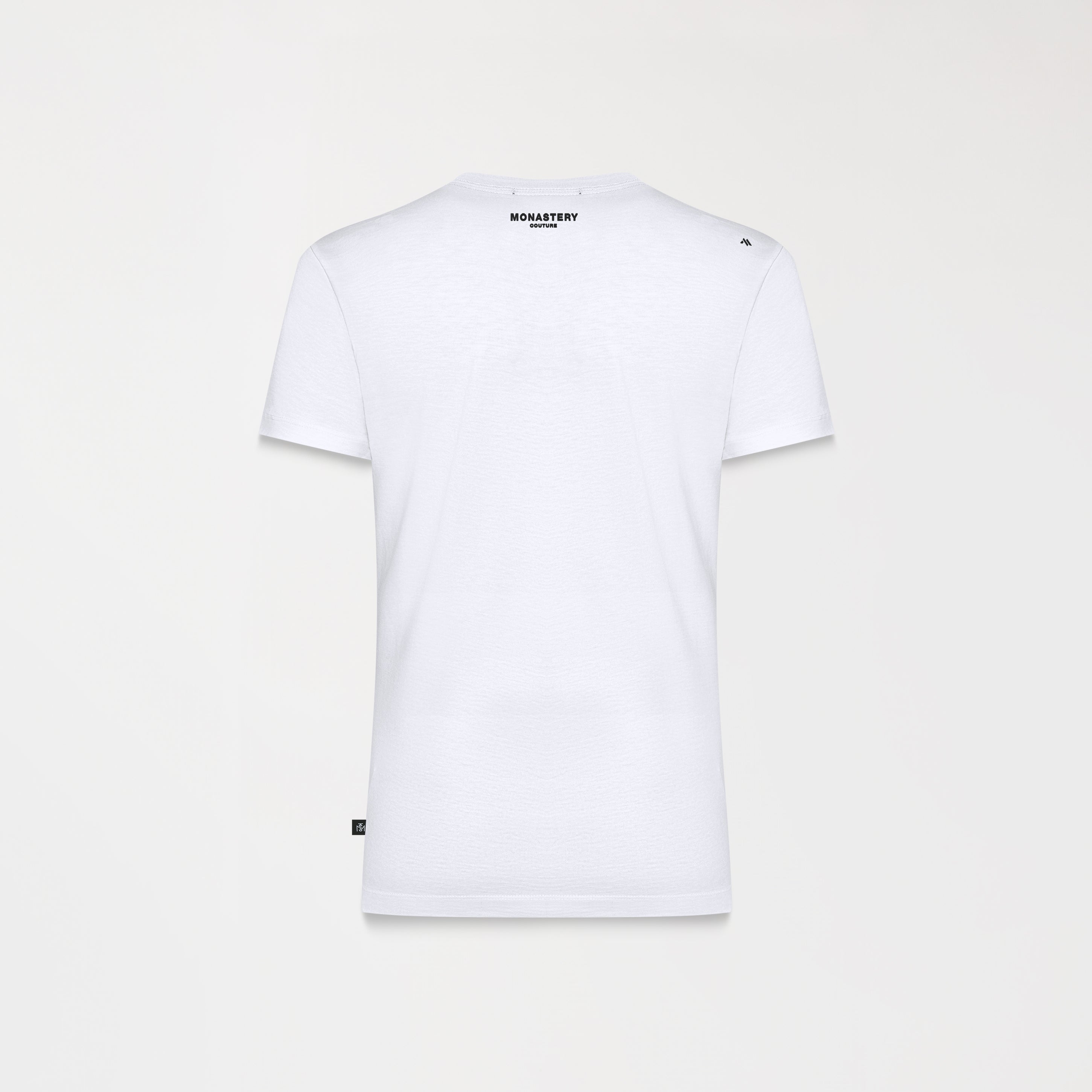 A feminine T-shirt crafted in a small silhouette designed to highlight the feminine figure through its fresh, fitted textile base. Jane is a garment with a high-quality, shiny silver Monastery metallic appliqué on the front and flat-printed insignia logos on the back. Ideal for those looking for a unique and comfortable garment, this T-shirt easily adapts to any casual look with details that give it a distinctive and modern touch.