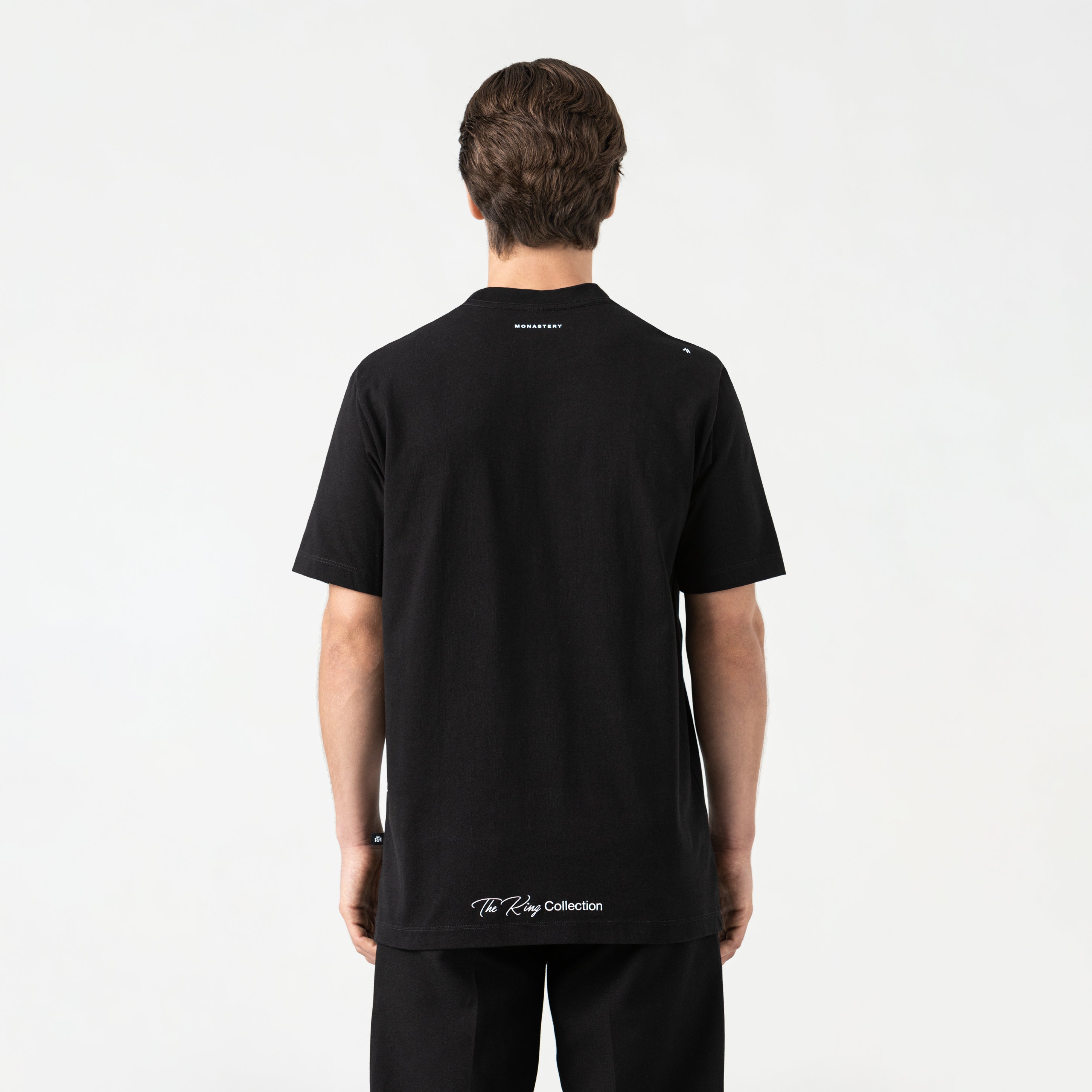 This men's regular-fit T-shirt conveys strength and precision in every detail. Crafted from Monastery tee, it offers a firm structure and a soft feel, ideal for a comfortable and assertive fit. The design includes a 2.5cm ribbed collar that reinforces its character. The front and back feature plastisol prints with a matte transfer finish, providing a subtle texture and a low-sheen aesthetic, ideal for those who prefer sophisticated graphics without excessive shine. A garment that combines technique and style for a look that effortlessly commands respect.