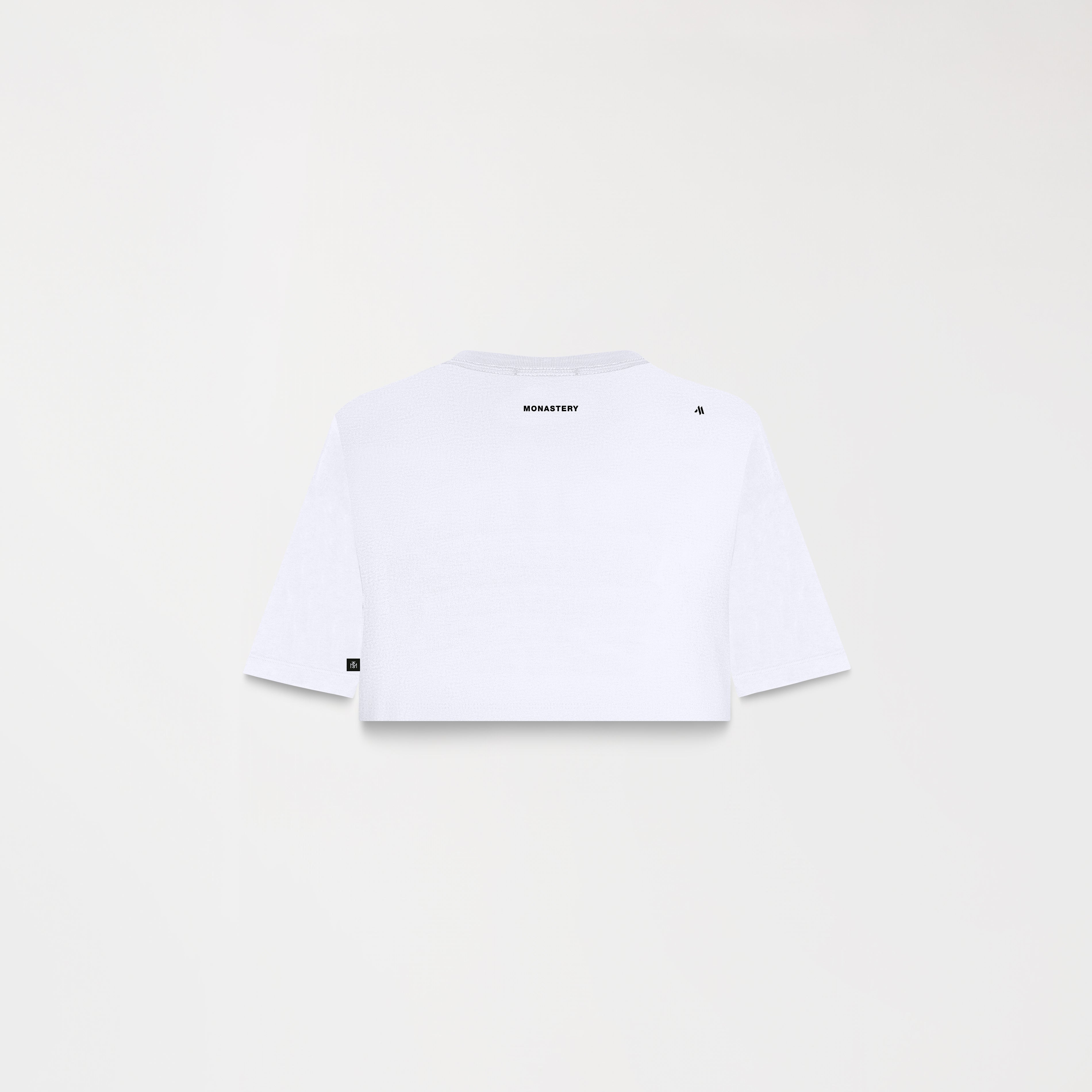 Women's crop top in Peruvian cotton exclusively for Monastery, crafted in a petite silhouette. This crop top stands out for its minimalist and modern design with a sophisticated touch thanks to its glitter print on the front, accompanied by our iconic Monastery logo in high-density print. The combination of its petite and short cut makes it a versatile and avant-garde garment, ideal for a contemporary look.