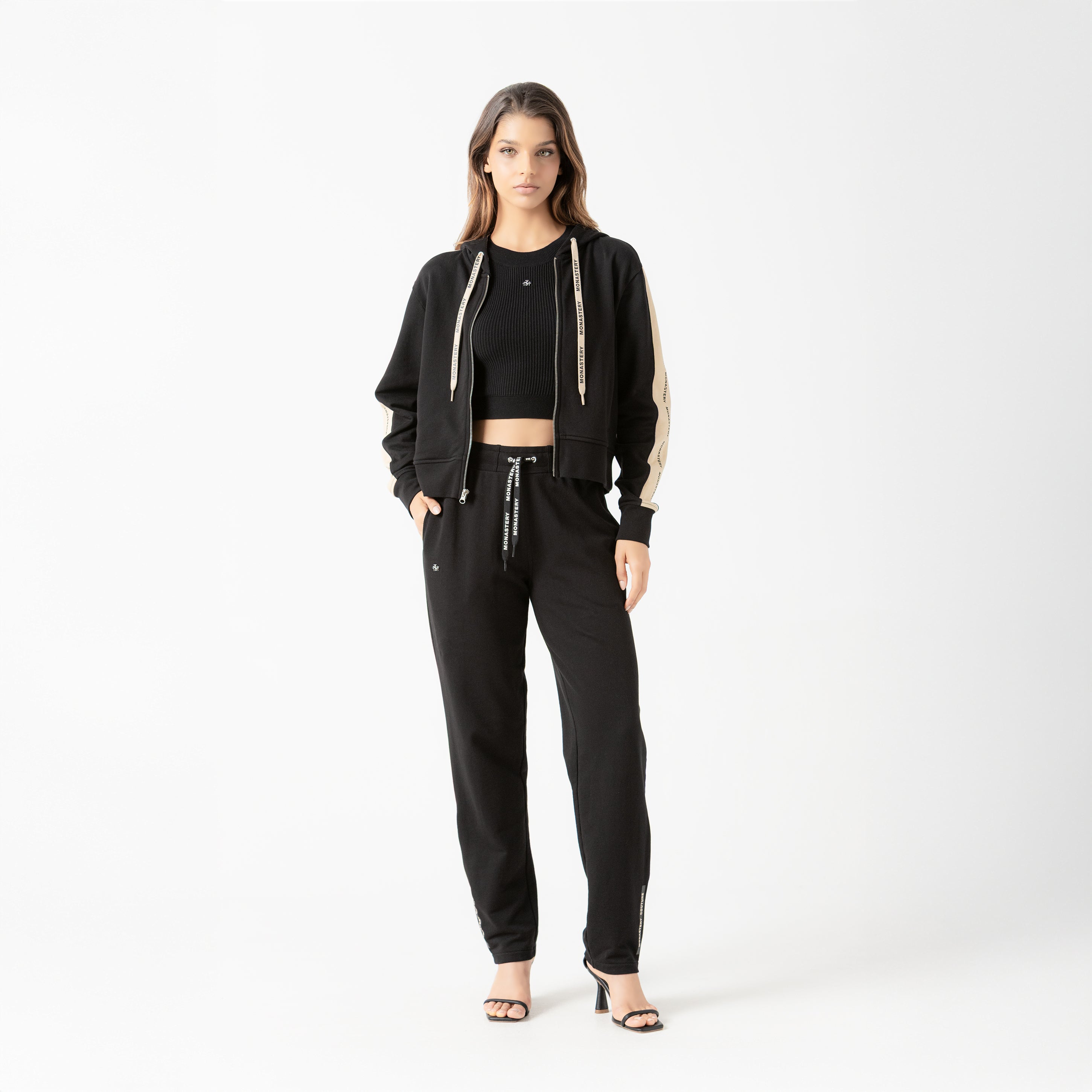 Jogger femenino negro confeccionado en French Terry de algodón peruano de alta calidad, que garantiza suavidad, confort y durabilidad.