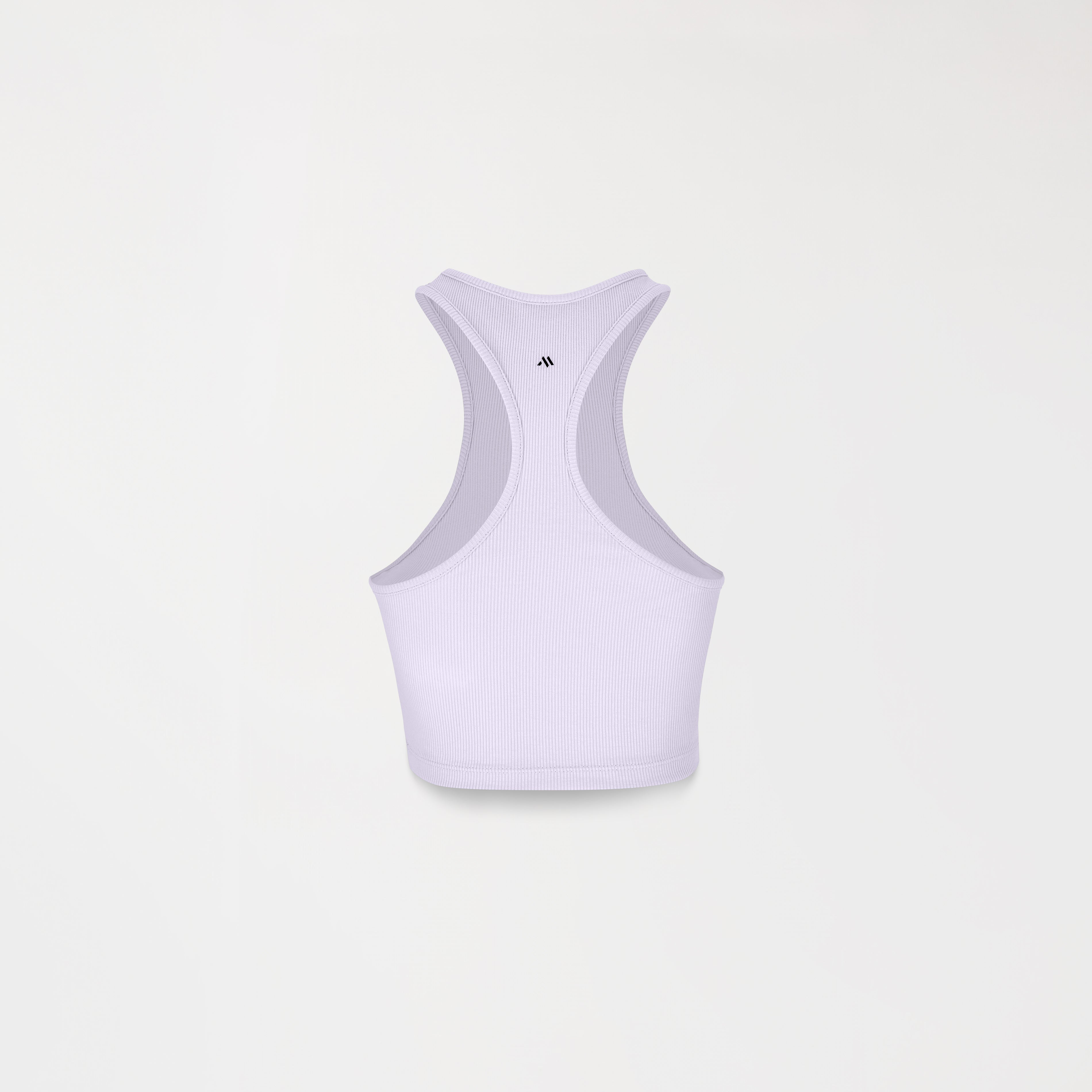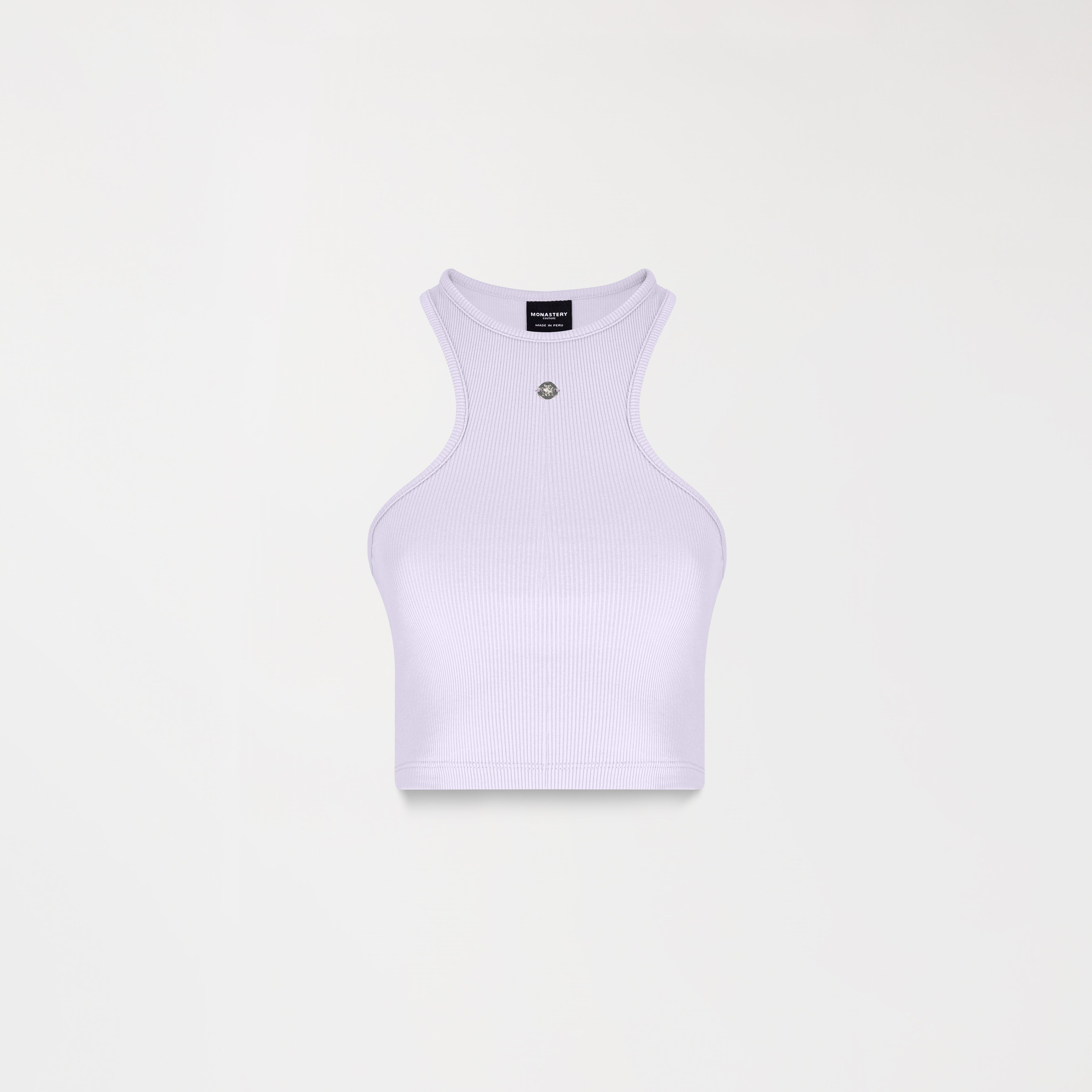 Lirio top, crafted in a basic silhouette with a ribbed textile base exclusive to Monastery, providing a better fit and further enhancing the feminine figure. This top features a thin metallic plate countermarked with the TSM logo in shiny silver and a flat-printed Monastery text with details that give it a distinctive and modern touch.