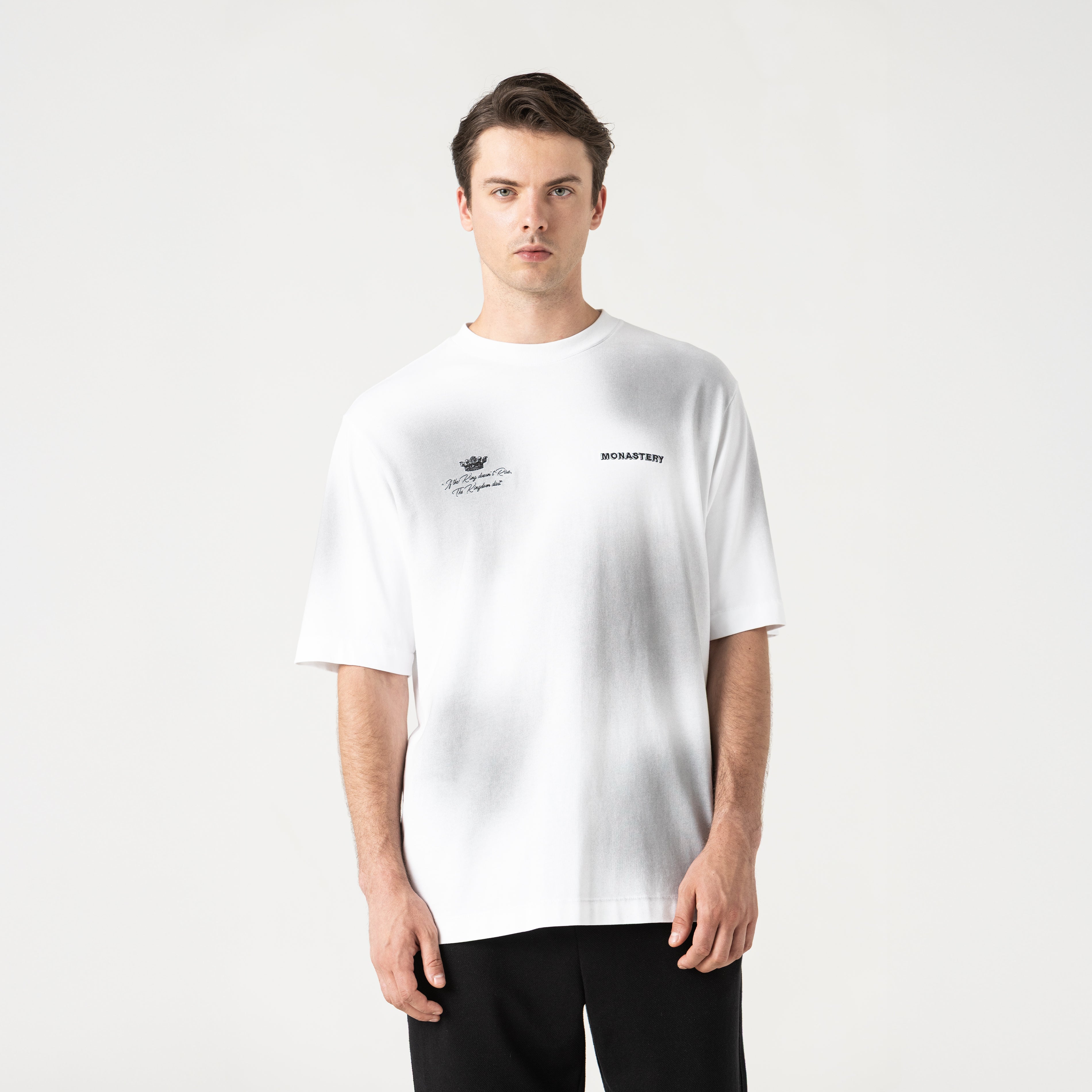 Loan is a men's t-shirt, made from 100% cotton exclusively for Monastery. This garment features exclusive artwork for The King collection on the front and our iconic Monastery logo in flat embroidery technique. The back features a slogan that represents a purpose and life principle. Combining flat, semi-high-density, and high-density embroidery techniques, this is a garment with renewed details, such as its smoky effect, creating an art that stands out.