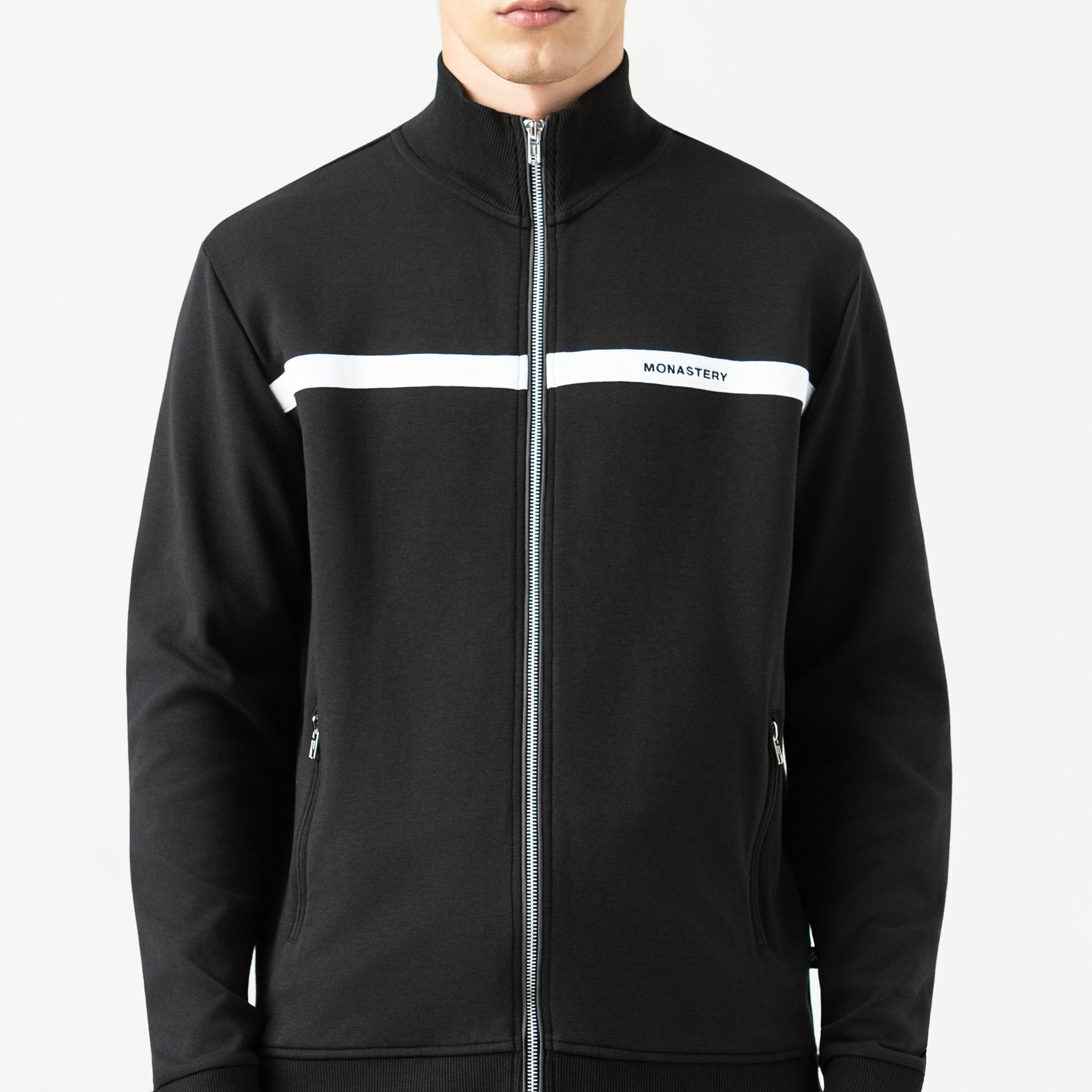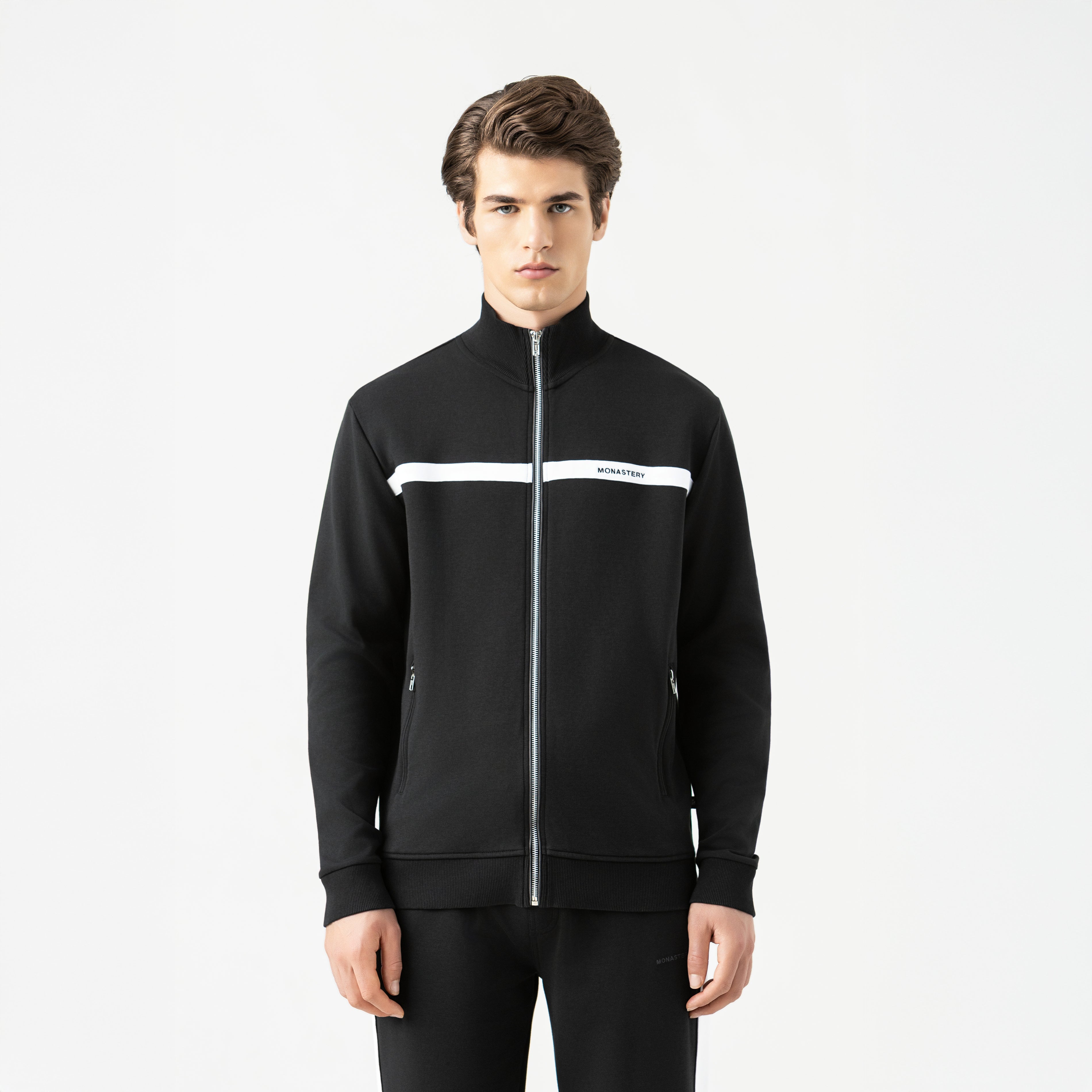 Luminus is a set consisting of a jacket and joggers in double-faced knit fabric, with a regular silhouette that combines comfort and sophistication. The jacket features zippered pockets, a contrasting trim, an embroidered Monastery logo, and a high-density print on the back for added character. The joggers feature a matching drawstring, front and back pockets, and an internal pocket for small items. The contrasting details reflect meticulous attention to detail. An ideal set for an elegant standout in casual settings.