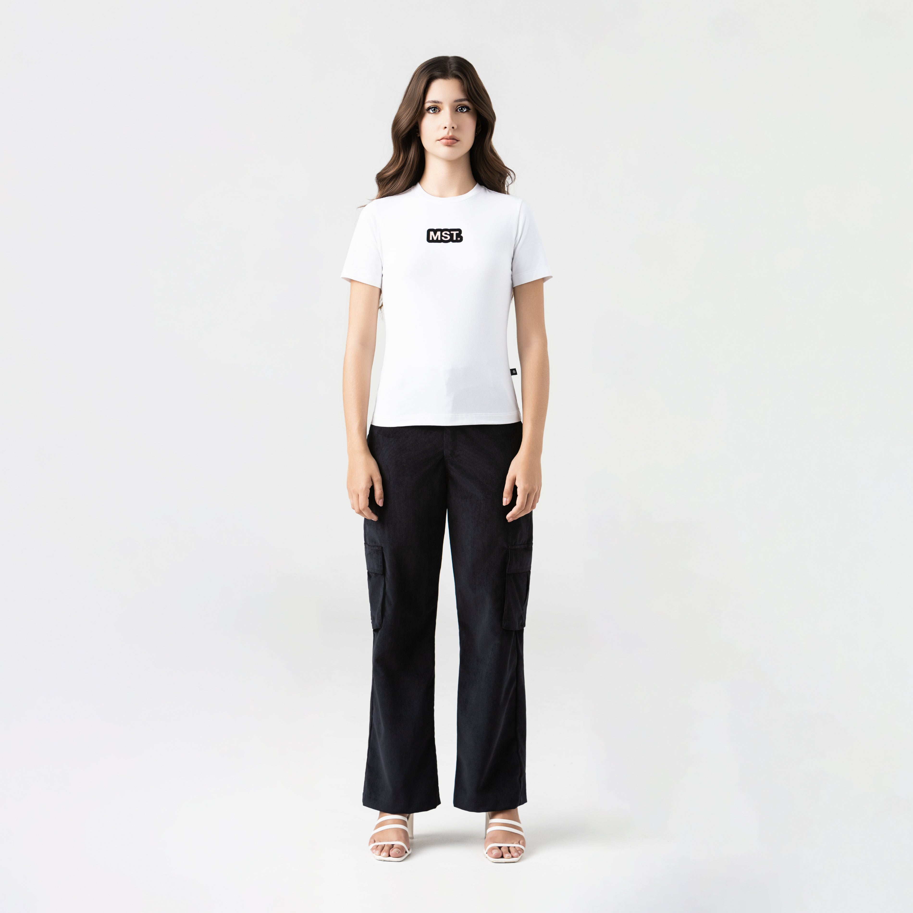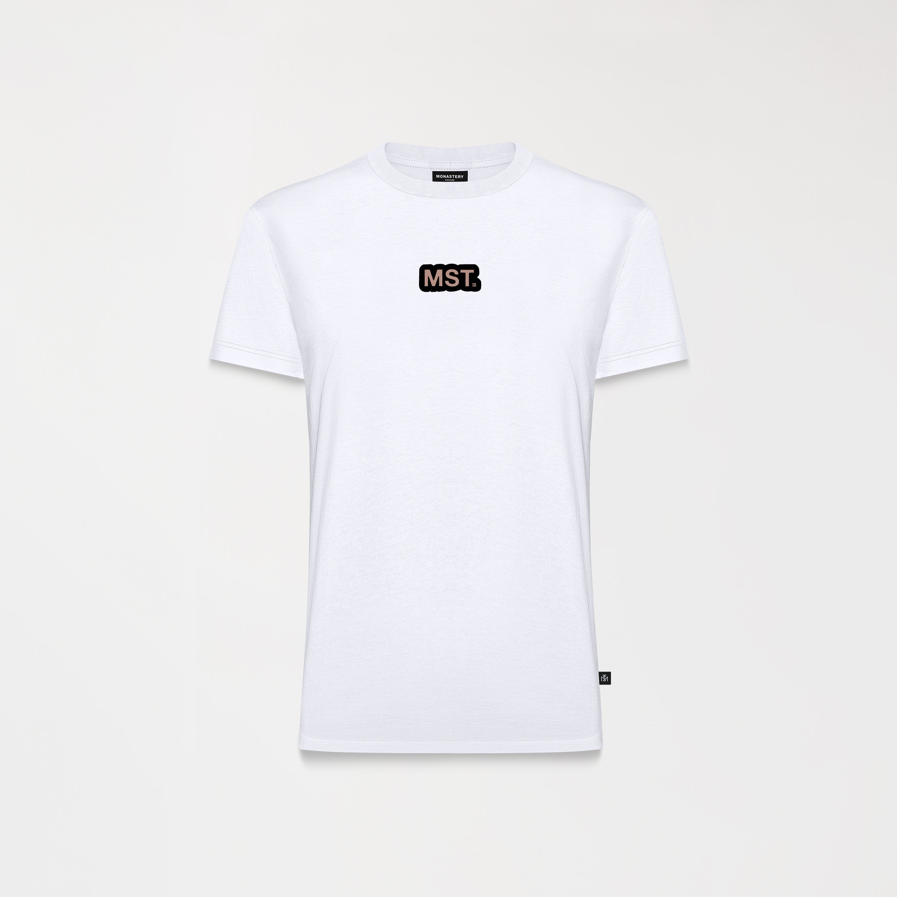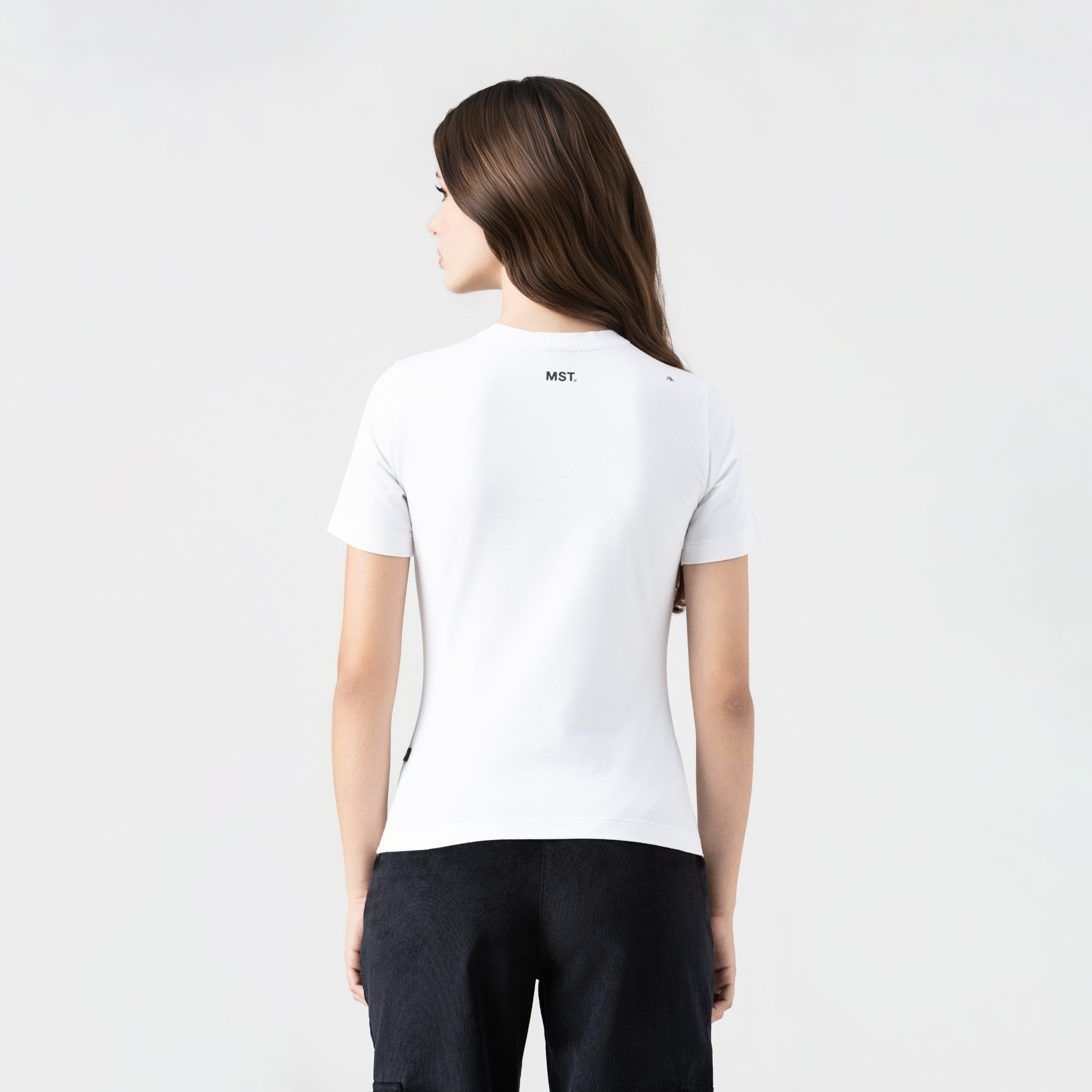 A women's T-shirt crafted in a small silhouette designed to highlight the feminine figure through its fresh, fitted textile base. Marie features MST artwork on the front using a Flock + Plastisol technique. It is a dynamic garment thanks to its textured front and its combination of techniques, accompanied by our signature logos on the back. This garment features details that give it a unique and exclusive touch, while maintaining the comfort and versatility of a basic garment.