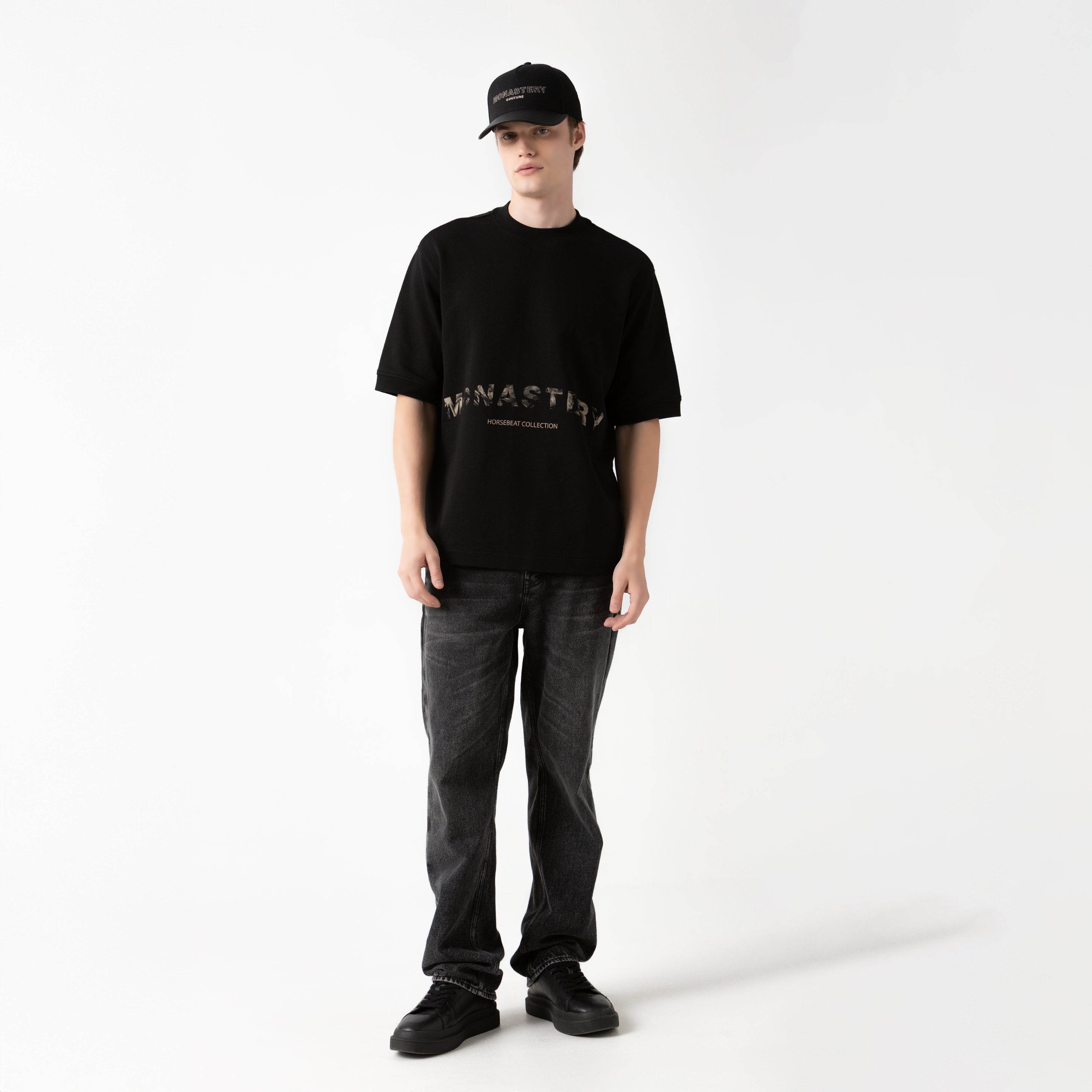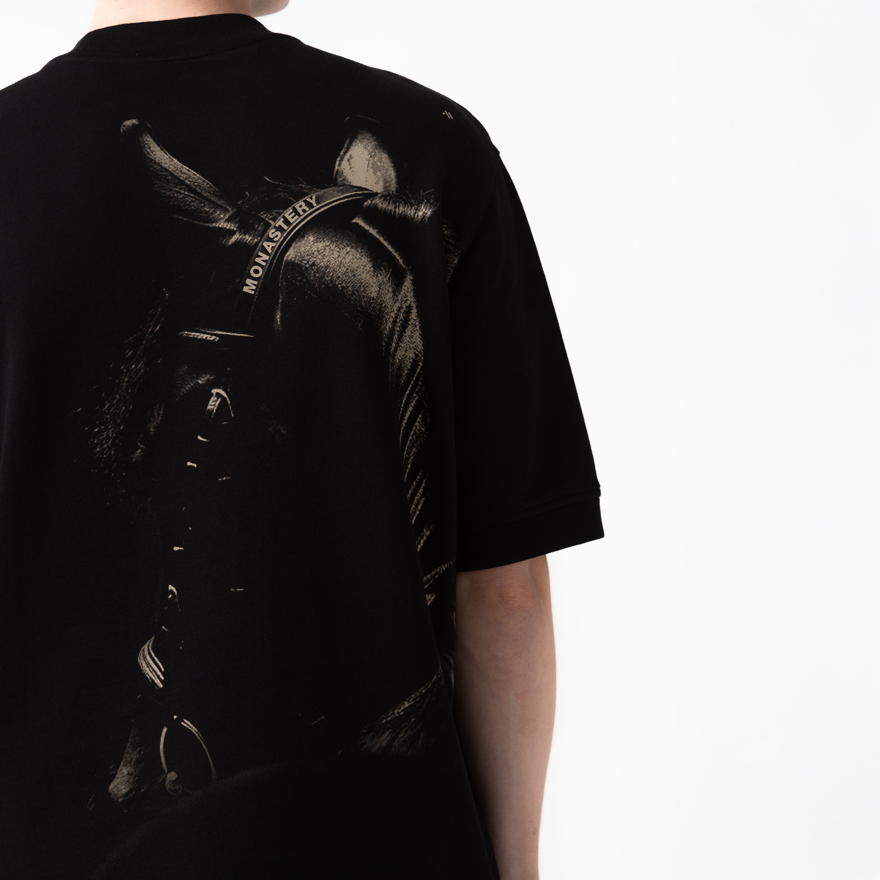 Su diseño integra un cuello en rib y gráficos en el frente y la espalda, donde resalta la figura del caballo, ícono de la colección, trabajada en técnica de estampado en corrosión. El resultado es un contraste visual de gran fuerza y autenticidad.