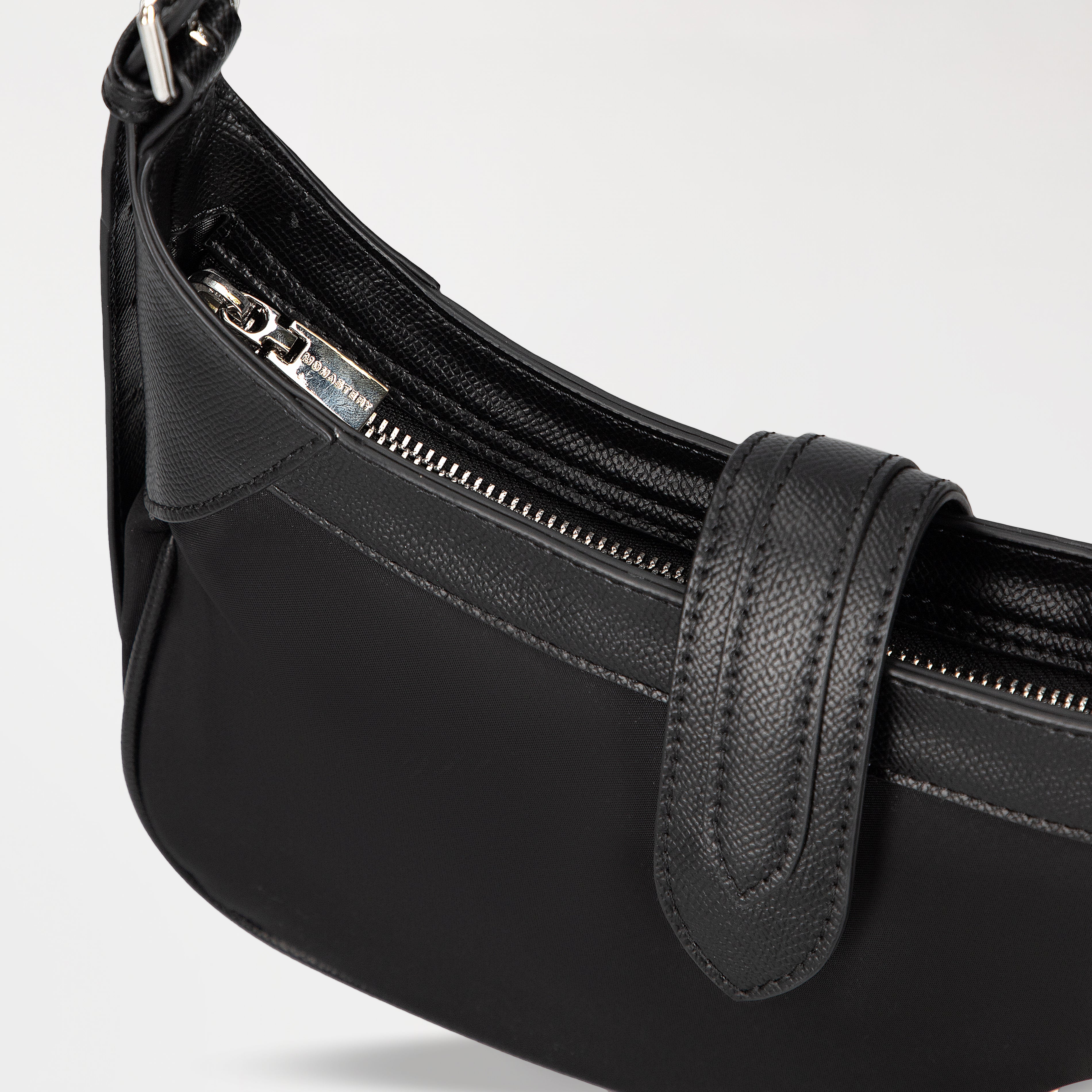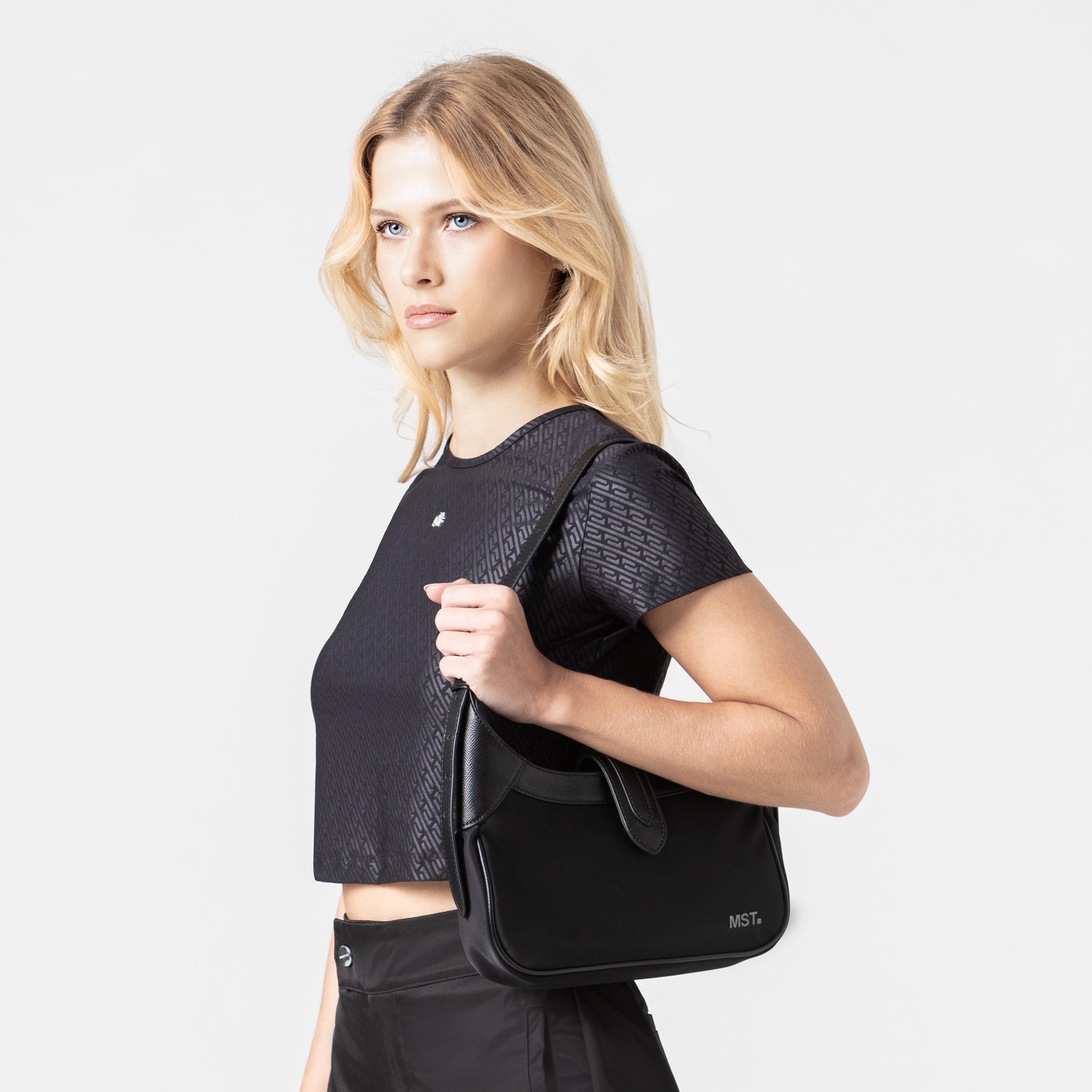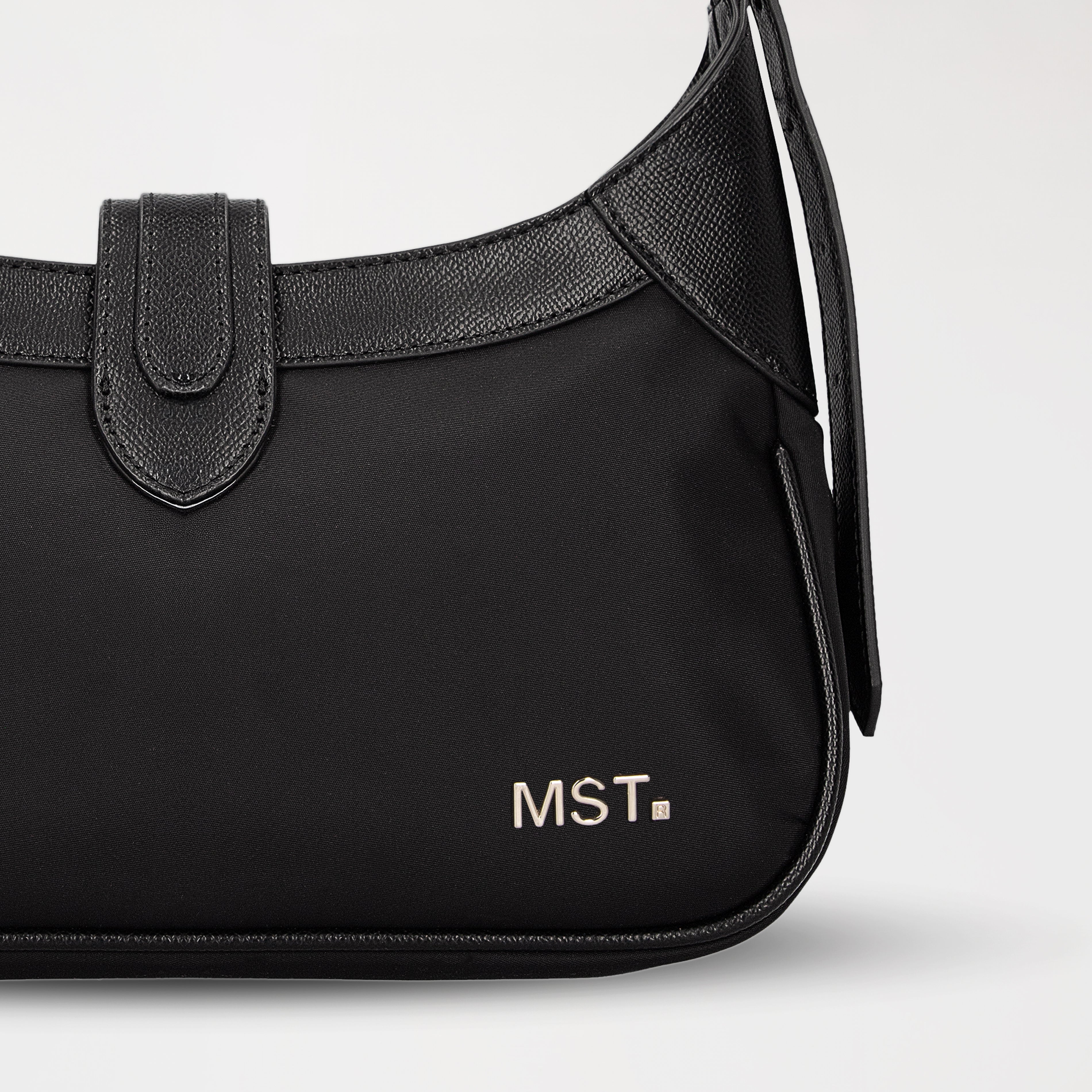 Shoulder bag made of polyamide and polyurethane, with a polyester lining, and an easy-access main compartment with a zipper covered by a decorative flap. It features slim, adjustable handles and silver-tone metal hardware. The MST logo is embellished with a metallic appliqué in the bottom corner. It combines versatility and style, suitable for everyday use or formal events thanks to its timeless and practical design.