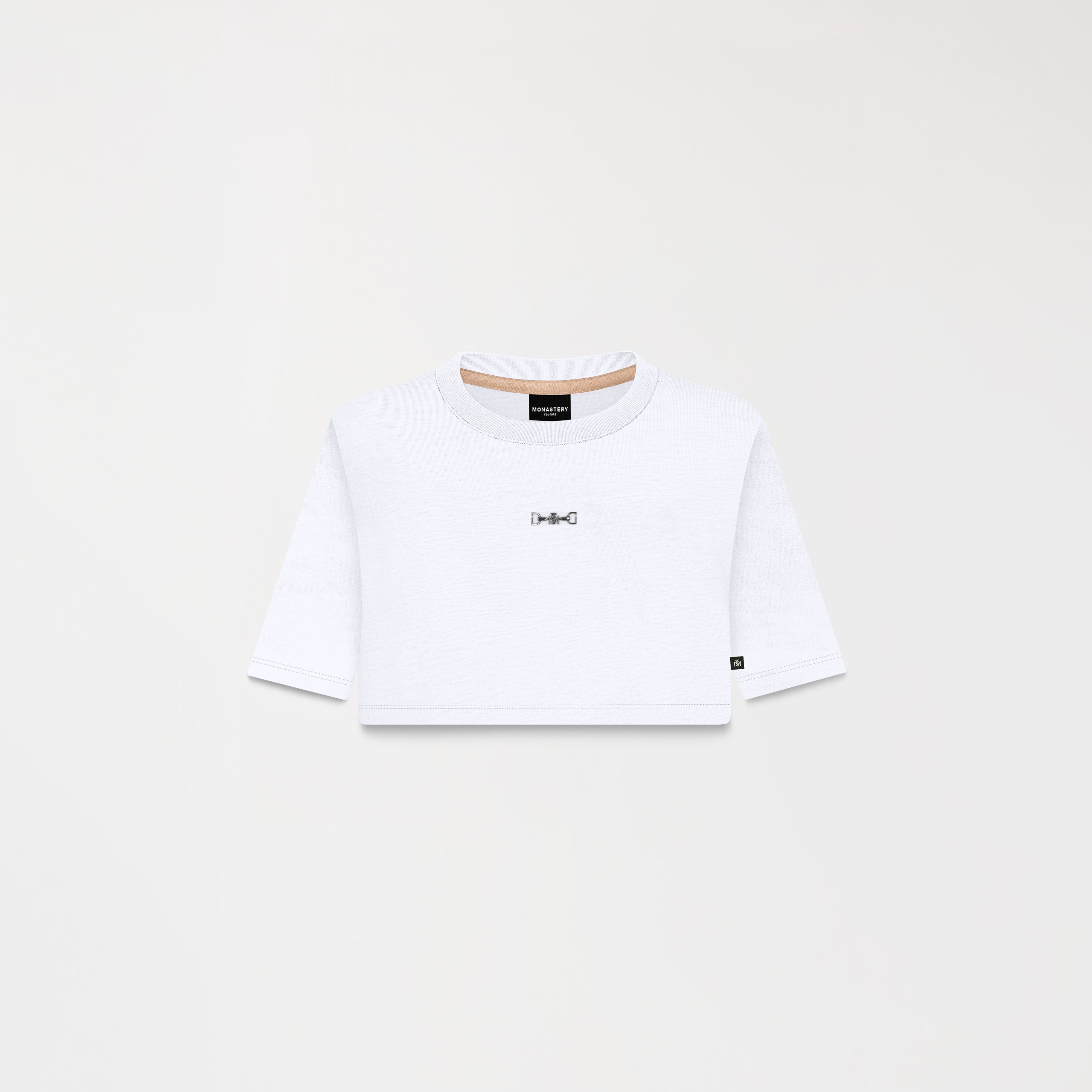 Natasha es un crop top confeccionado en 100% algodón ultra siliconado de alta calidad, que ofrece suavidad, frescura y un ajuste preciso. Su silueta pequeña, disponible en dos colores, resalta la figura con elegancia. En el frente, una placa metálica aporta un acento contemporáneo alineado con el concepto de la colección, mientras que las costuras y la cimbra en tono contraste añaden un detalle visual distintivo. En la parte posterior, un estampado plano completa el diseño con equilibrio y estilo.