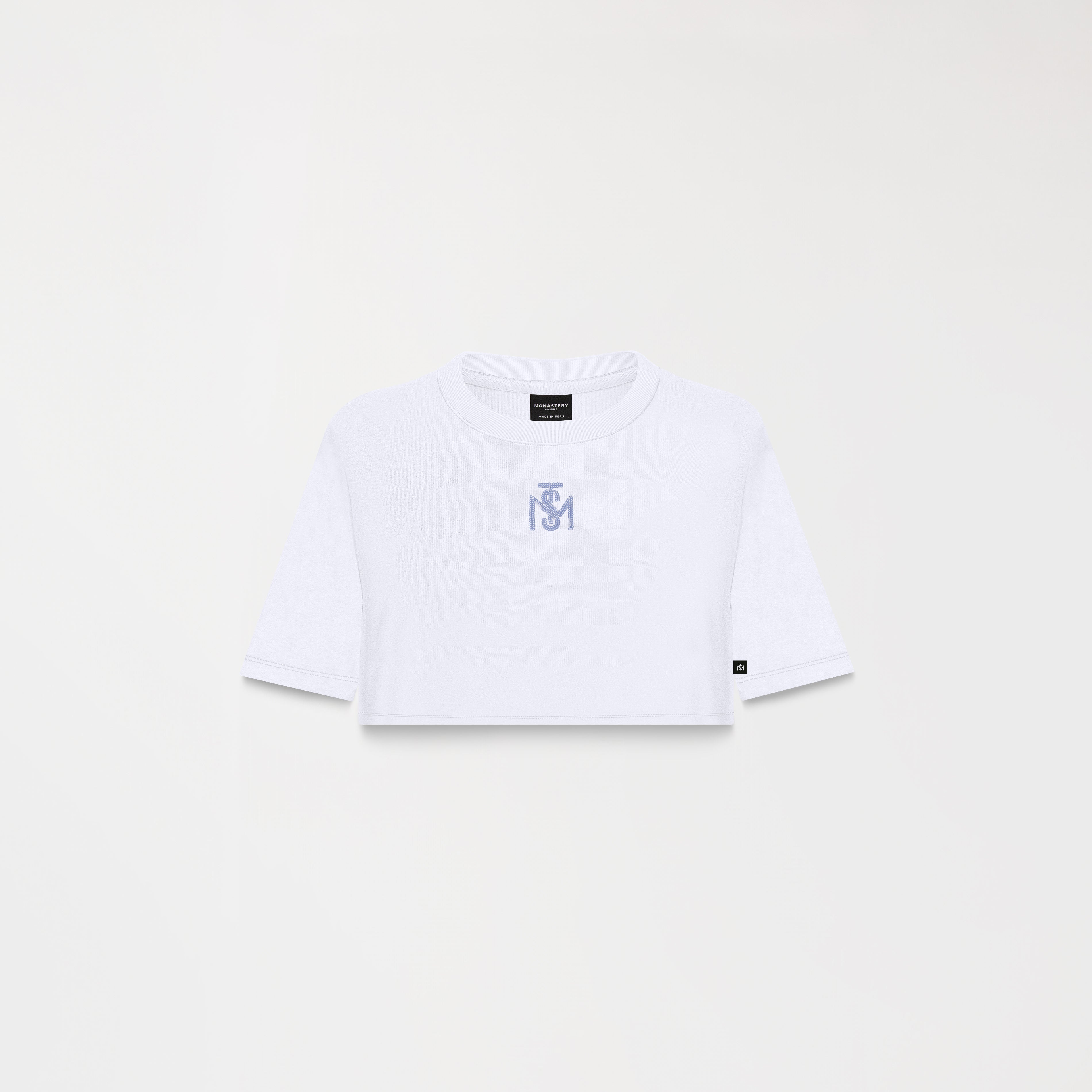Women's crop top in Peruvian cotton exclusively for Monastery. Its small, loose, and short silhouette makes it ideal for a fresh and casual look. Its striking and modern design is crafted with sequins that capture the light and add a unique touch of shine. Contrasting threads on the front and back add dynamism and a structured finish, creating a fusion of elegance and boldness. On the back, the flat print highlights the piece with a subtle yet striking detail. Perfect for those seeking a fun and contemporary style.