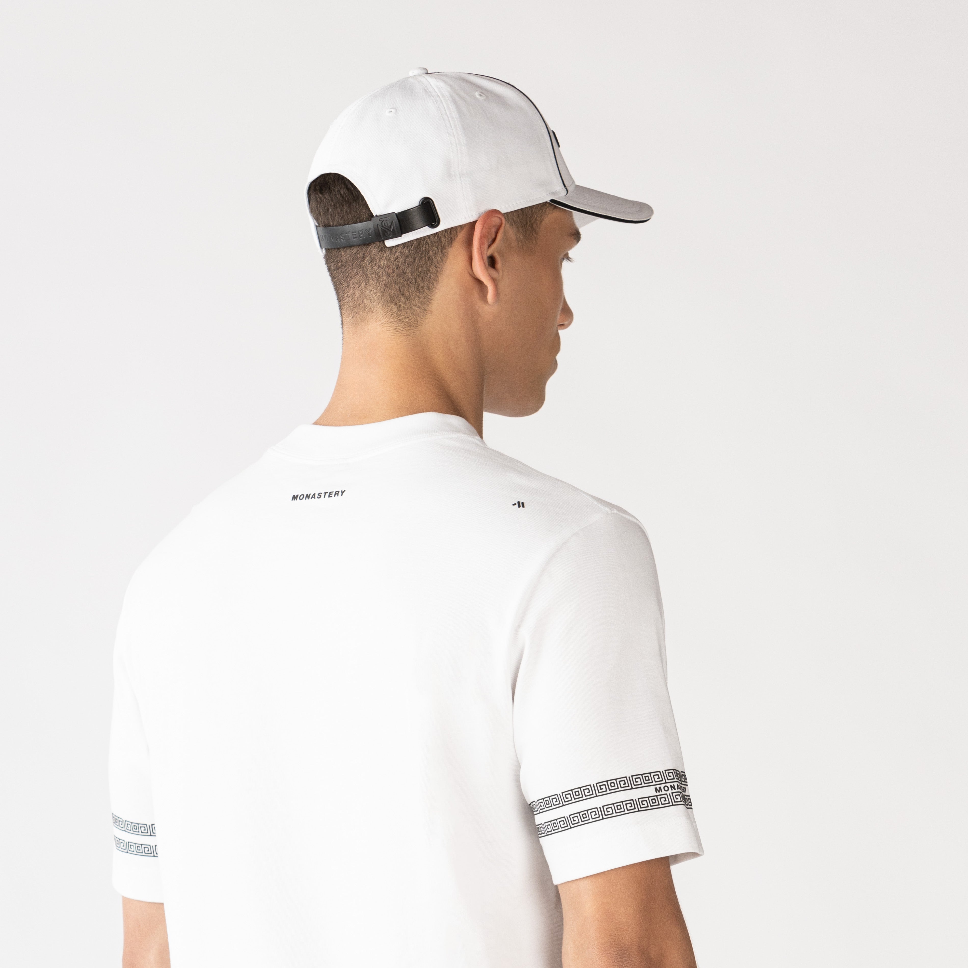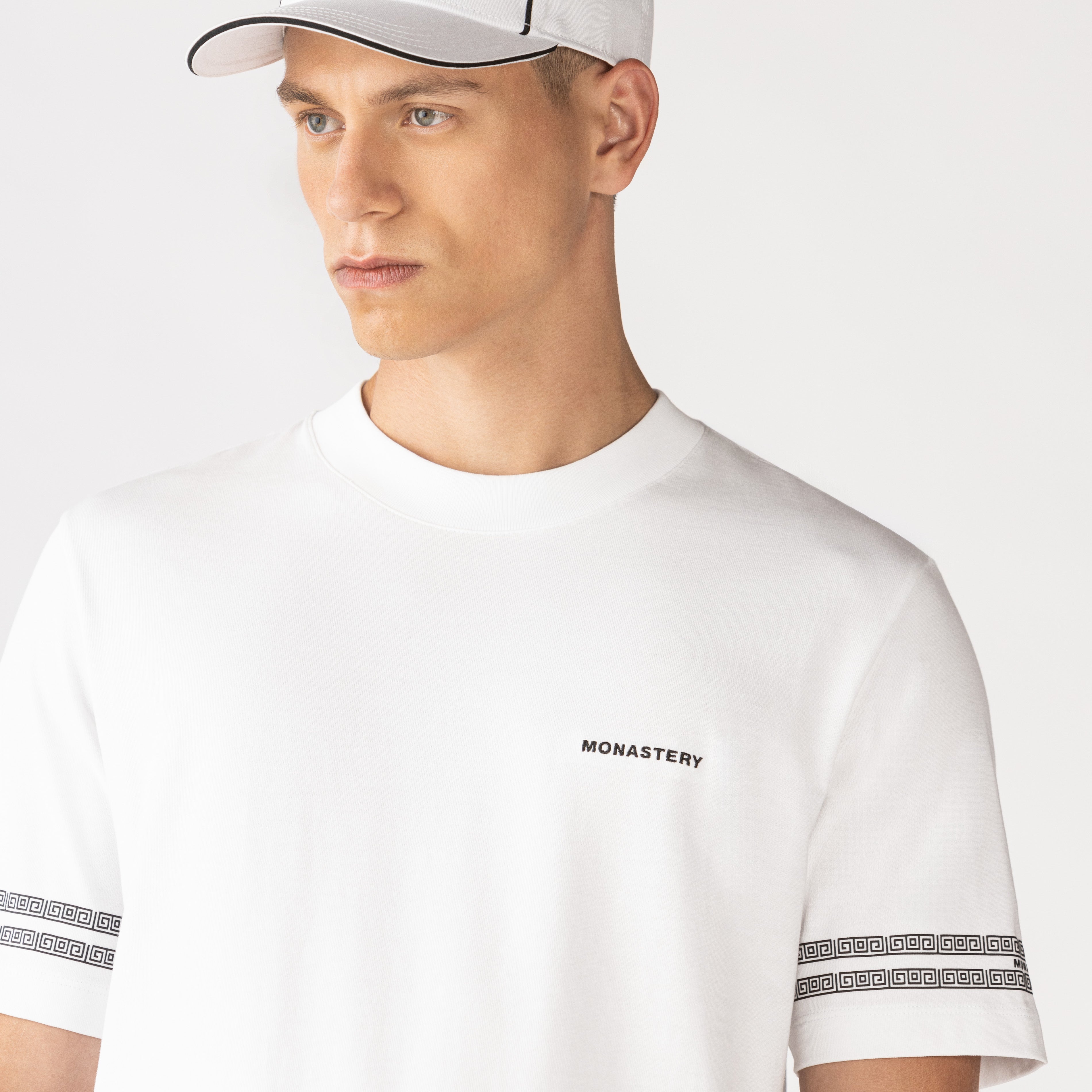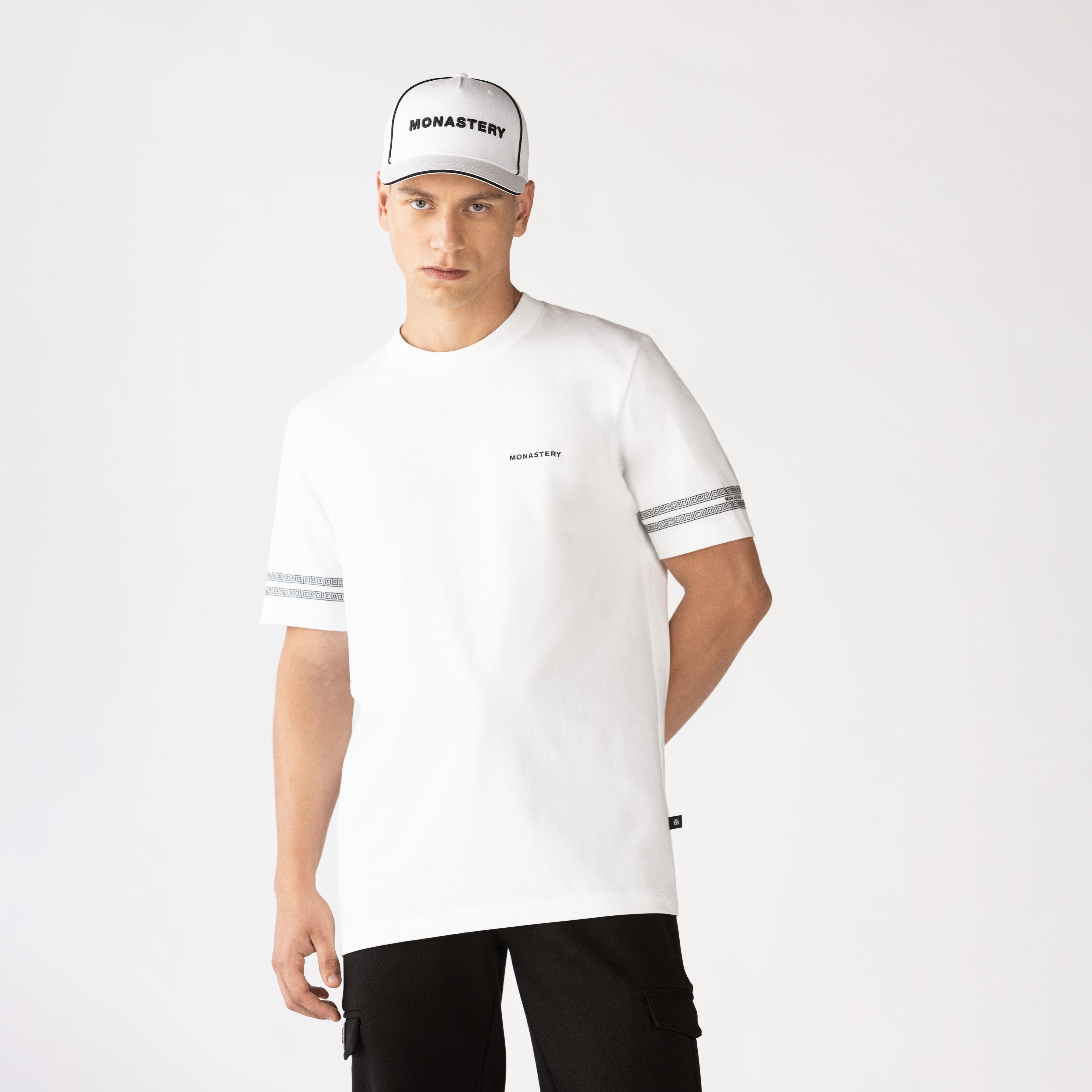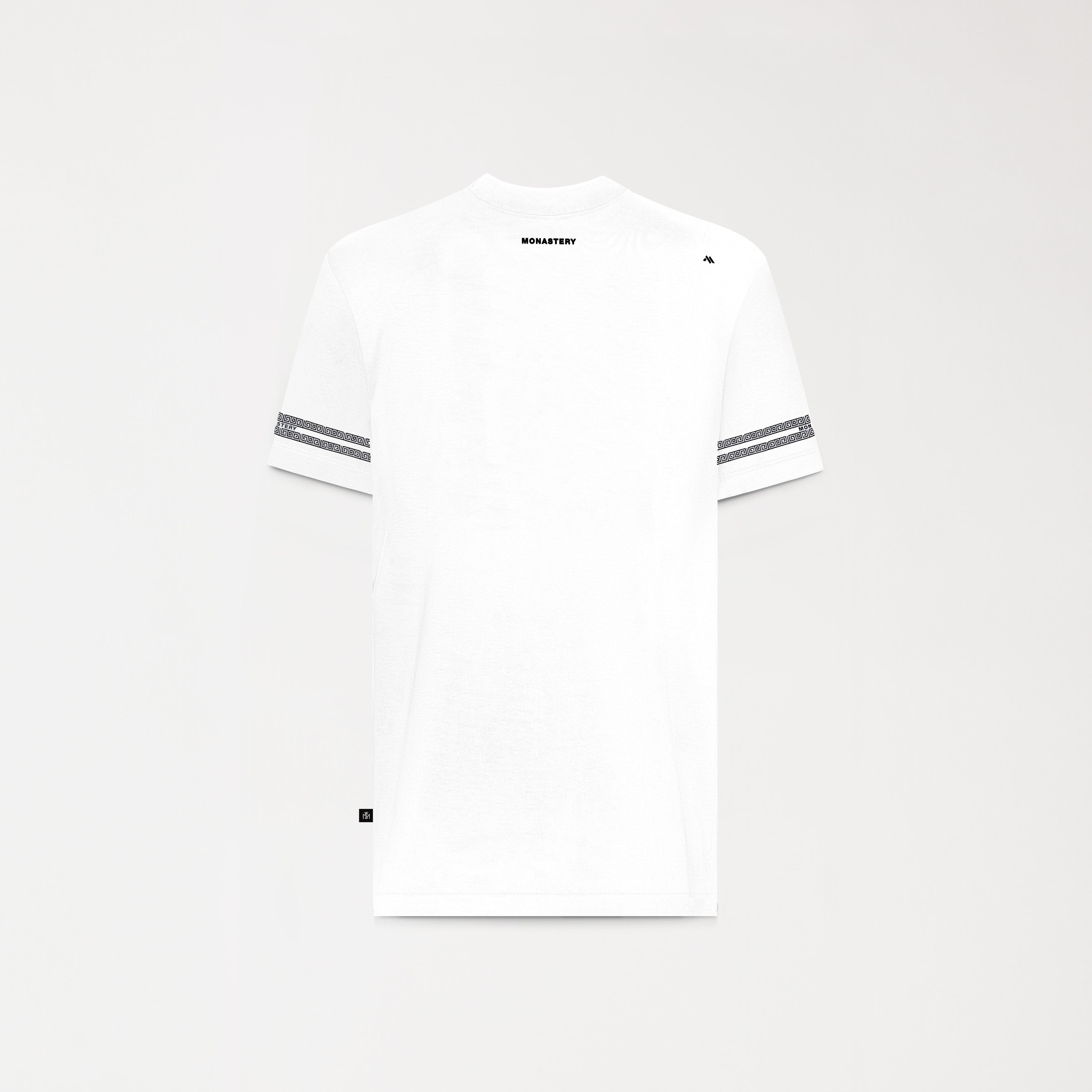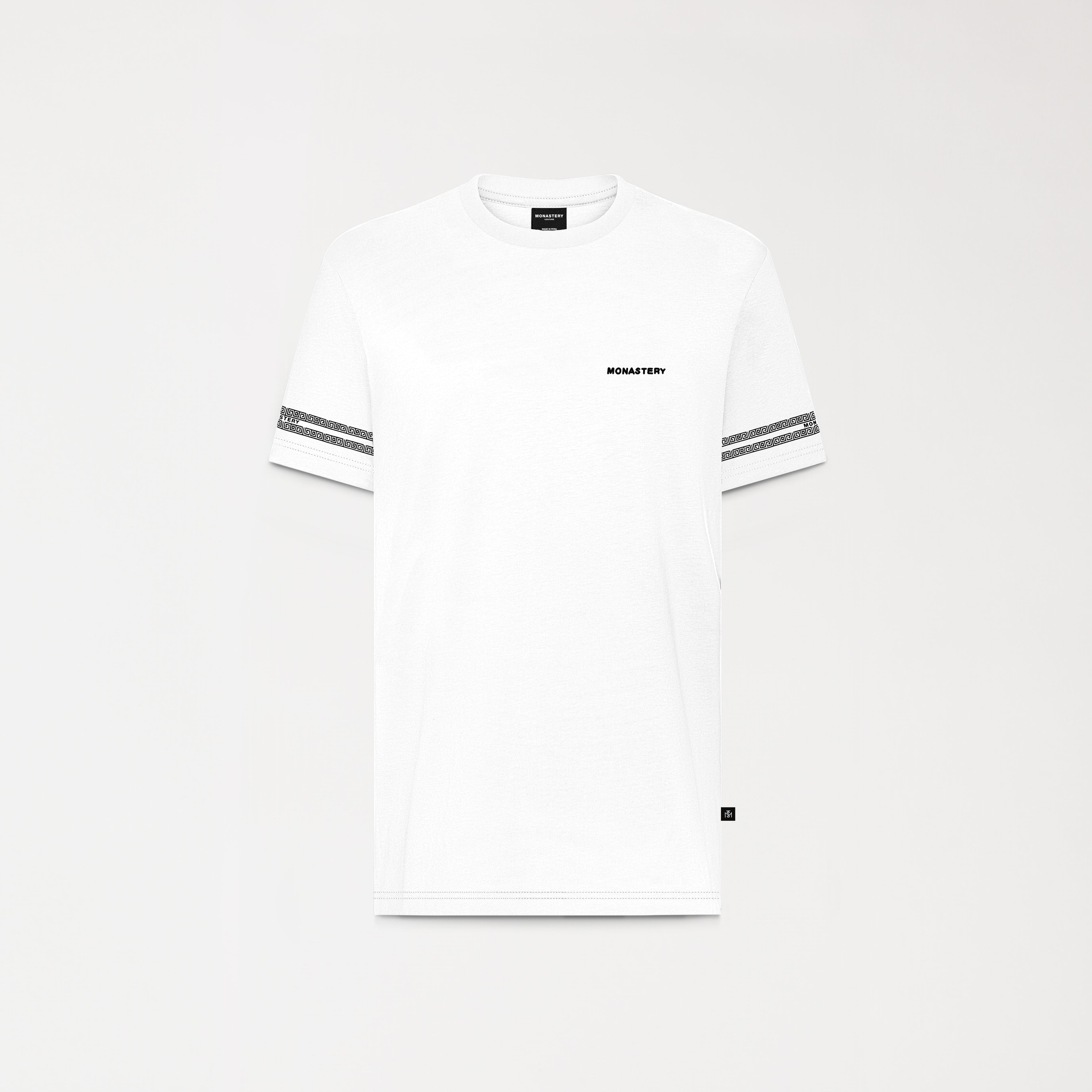 The Peynet white t-shirt made from high-quality Monastery cotton, this regular-fit t-shirt features a 3cm collar that ensures comfort and style. It stands out for its semi-high-density disc border art on the sleeves, providing a dynamic and modern touch. On the front, the text "MONASTERY" is embroidered in the heart stitch, while the back features a classic high-density insignia logo design. Ideal for those looking for a garment that combines originality and sophistication, the Peynet t-shirt is perfect for any occasion.