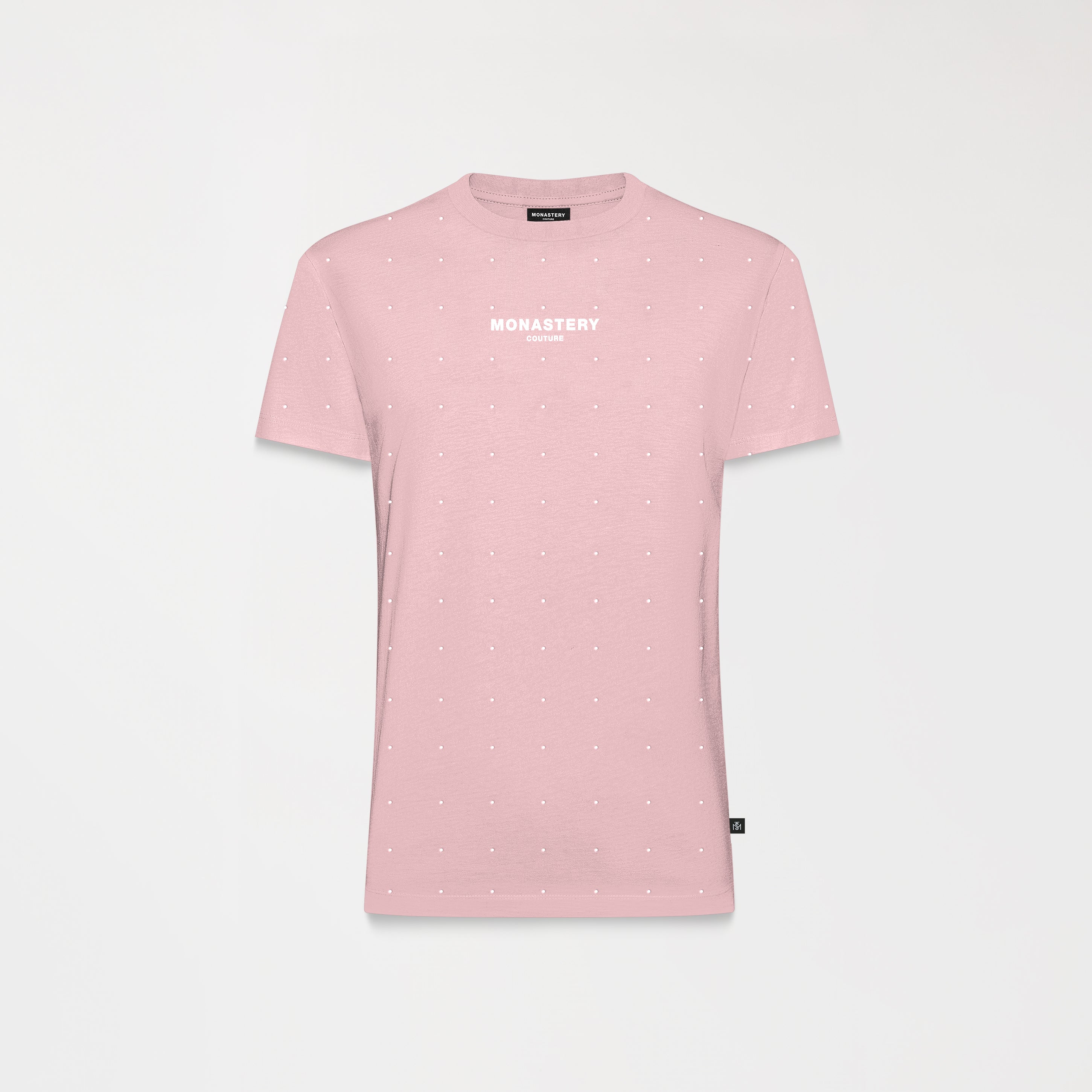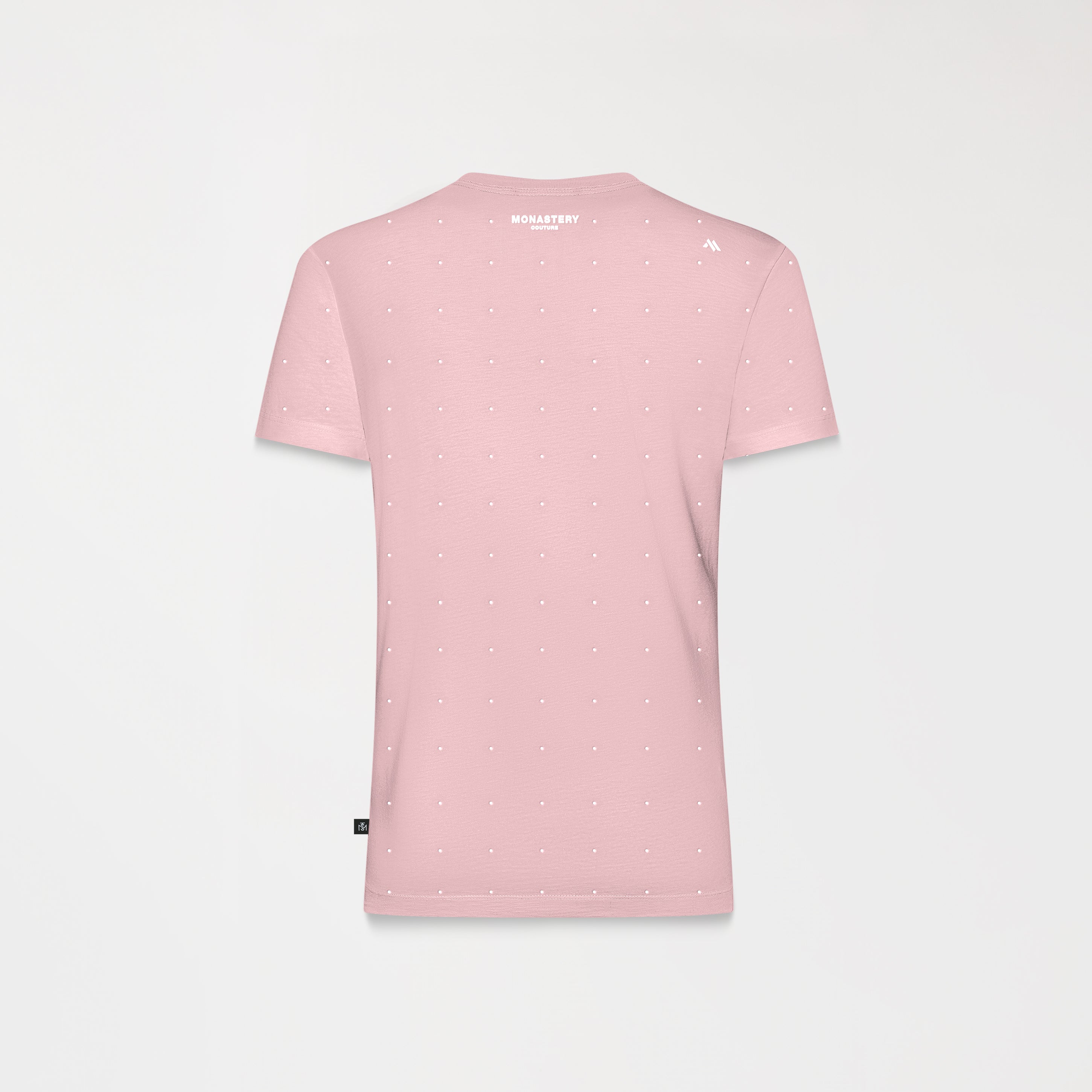 A feminine T-shirt crafted in a small silhouette designed to highlight the feminine figure through its fresh, fitted textile base. Qylla is a design featuring crystals continuously applied throughout the garment, precisely arranged to create a dynamic effect. It features the Monastery Couture logo in the center front using a transfer technique, which reinforces the visual contrast without detracting from the design. The back features signature artwork in a flat print, perfect for a striking elegance.