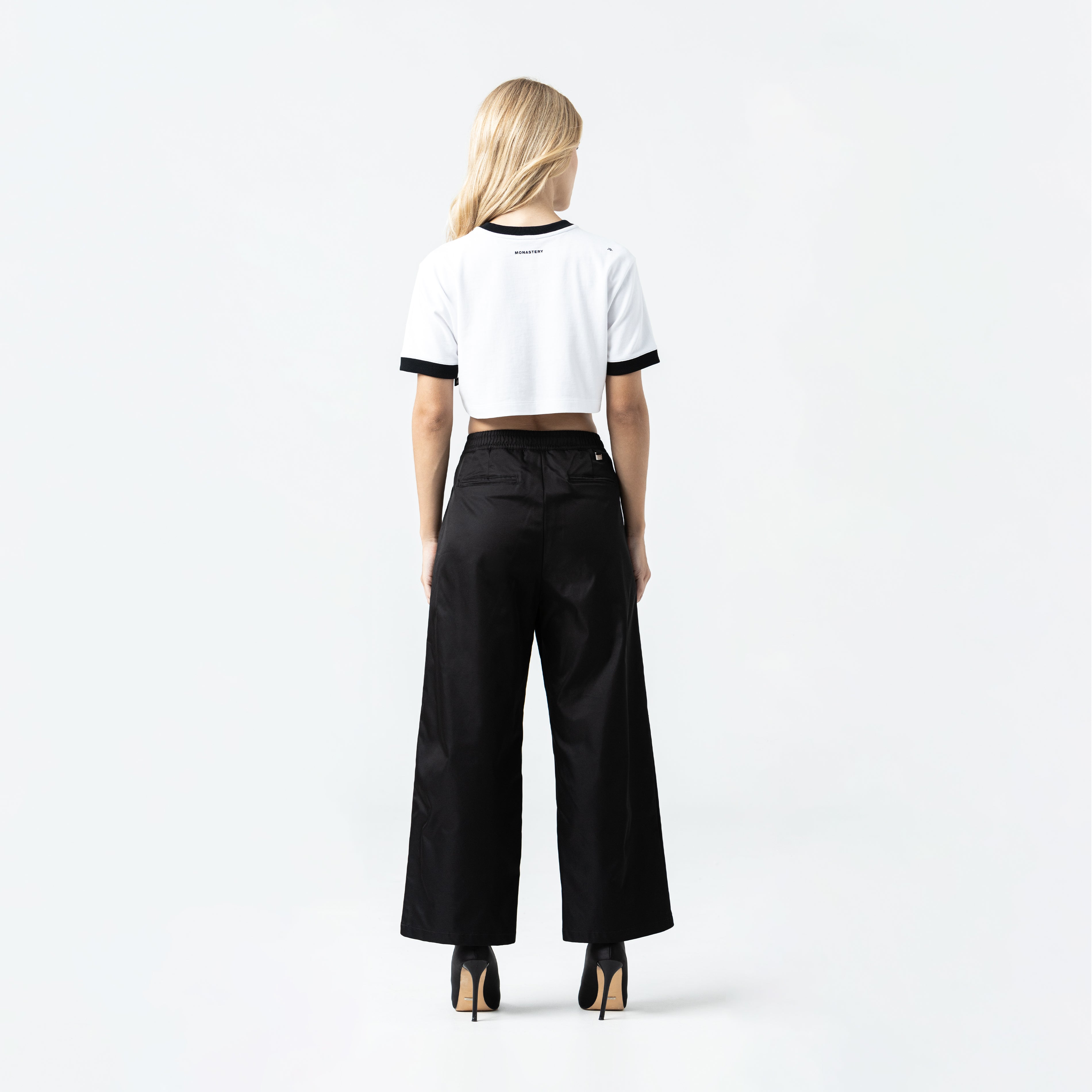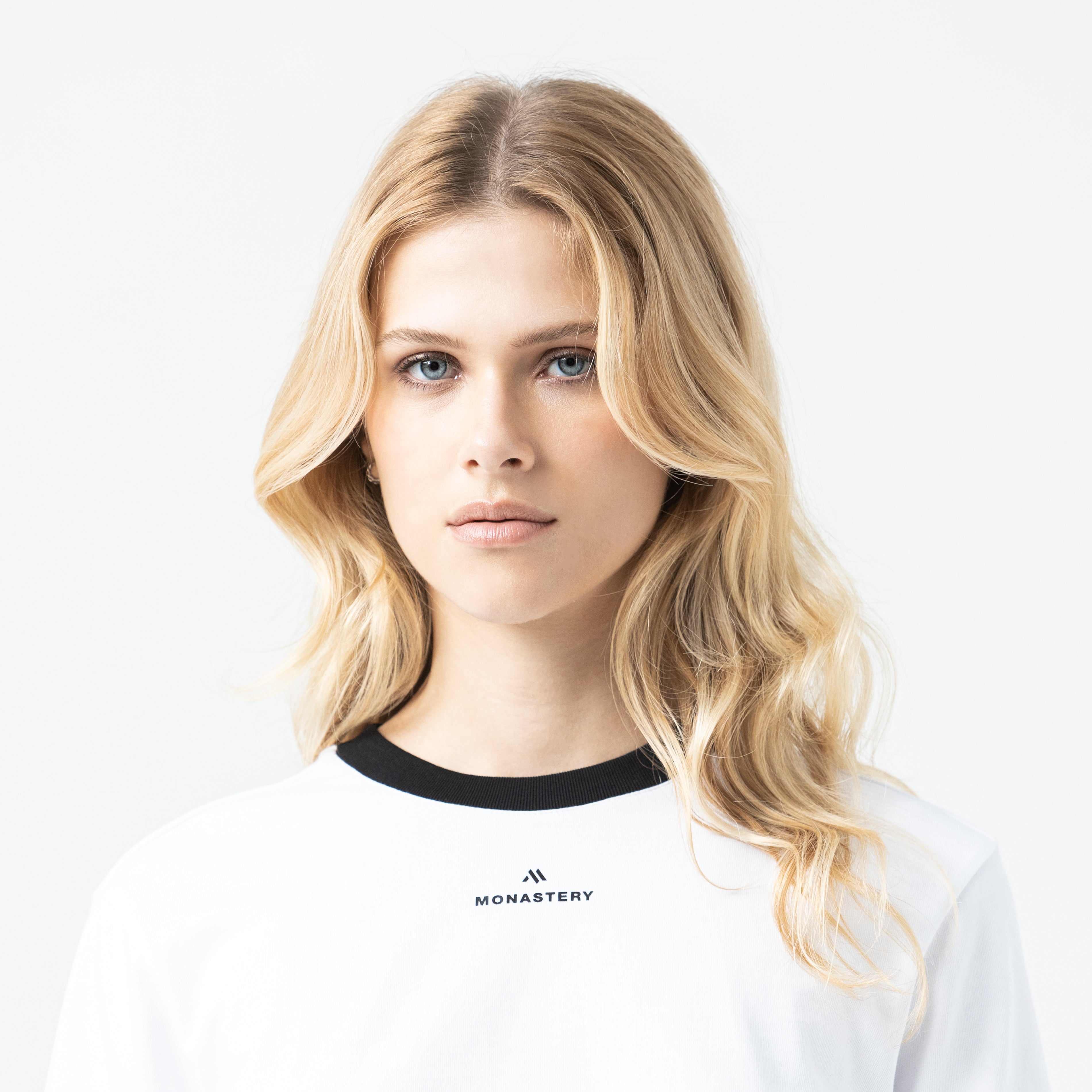 Women's crop top in Peruvian cotton exclusively for Monastery, crafted in a small silhouette, Senn features the Monastery logo and insignia in a plastisol + glossy transfer technique. This style features contrasting details that give it a distinctive and modern touch. This crop top is ideal for those seeking a comfortable and sophisticated look thanks to its large textile base.