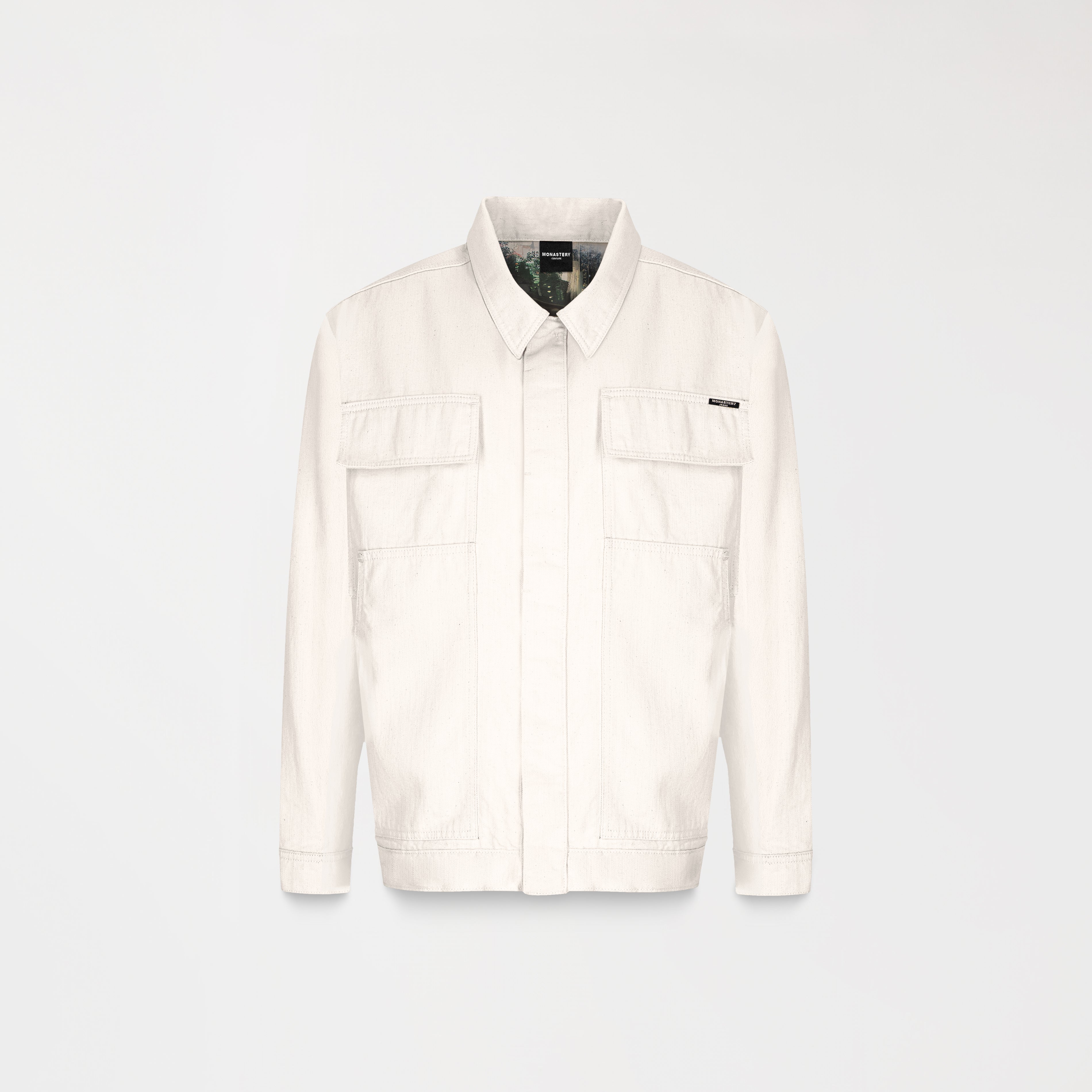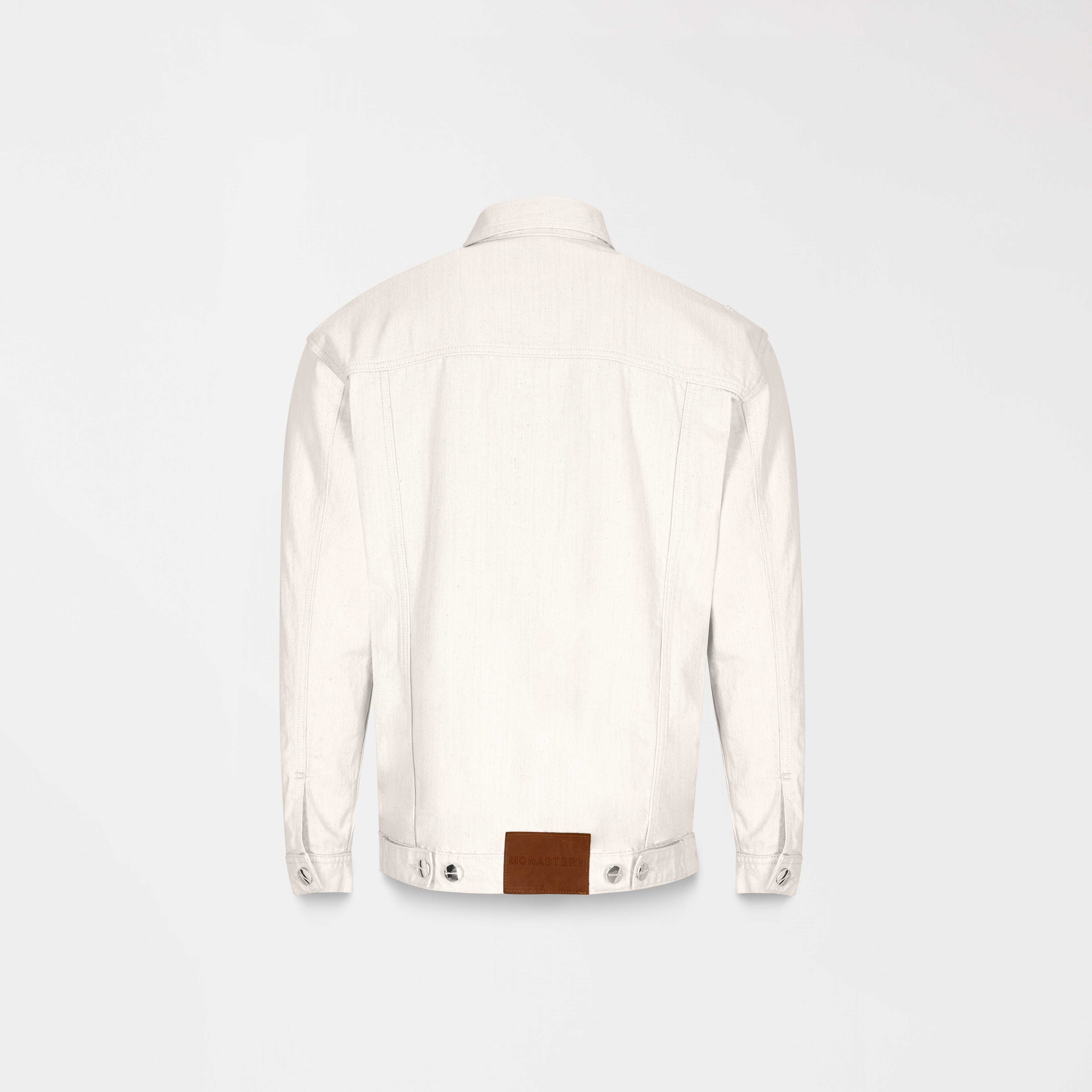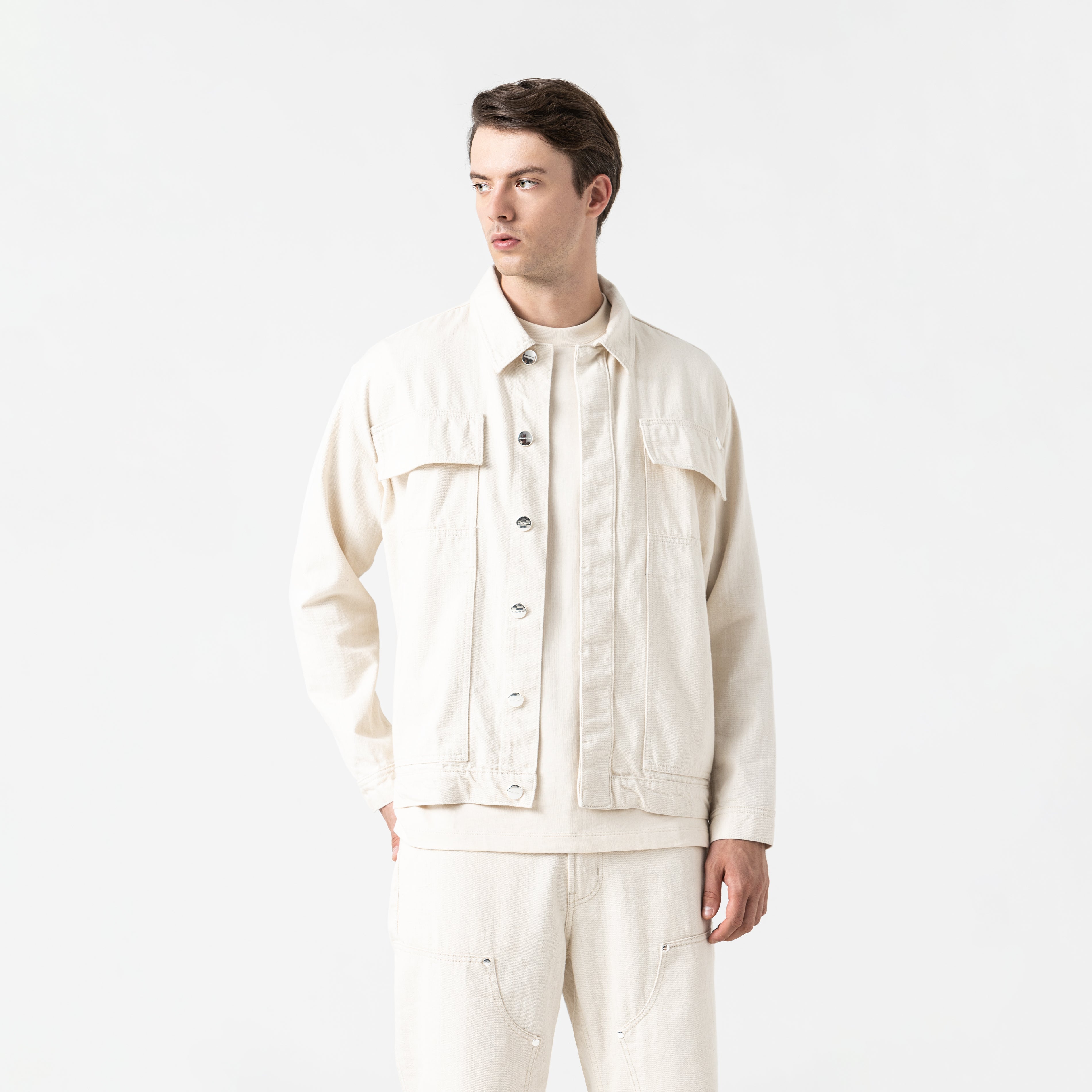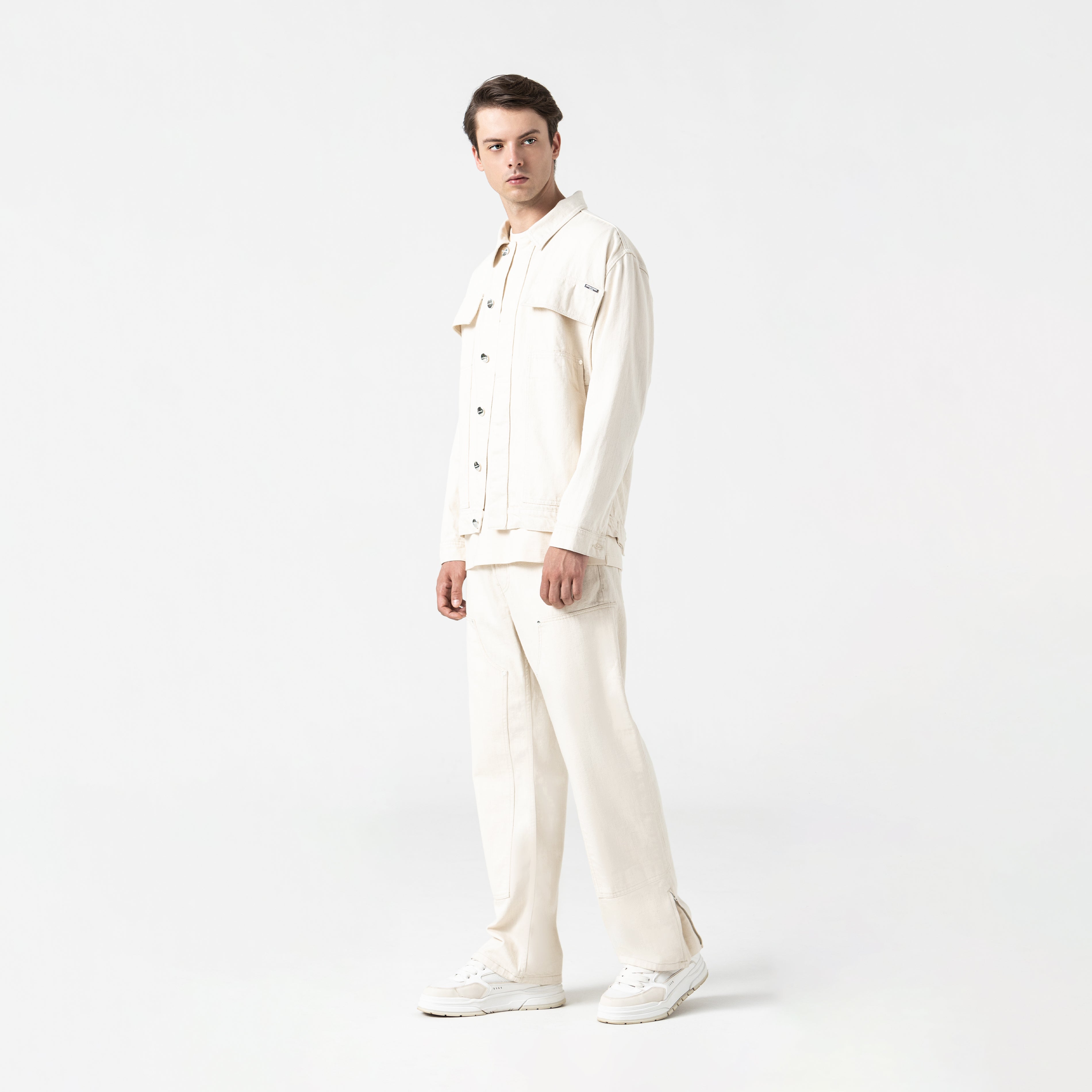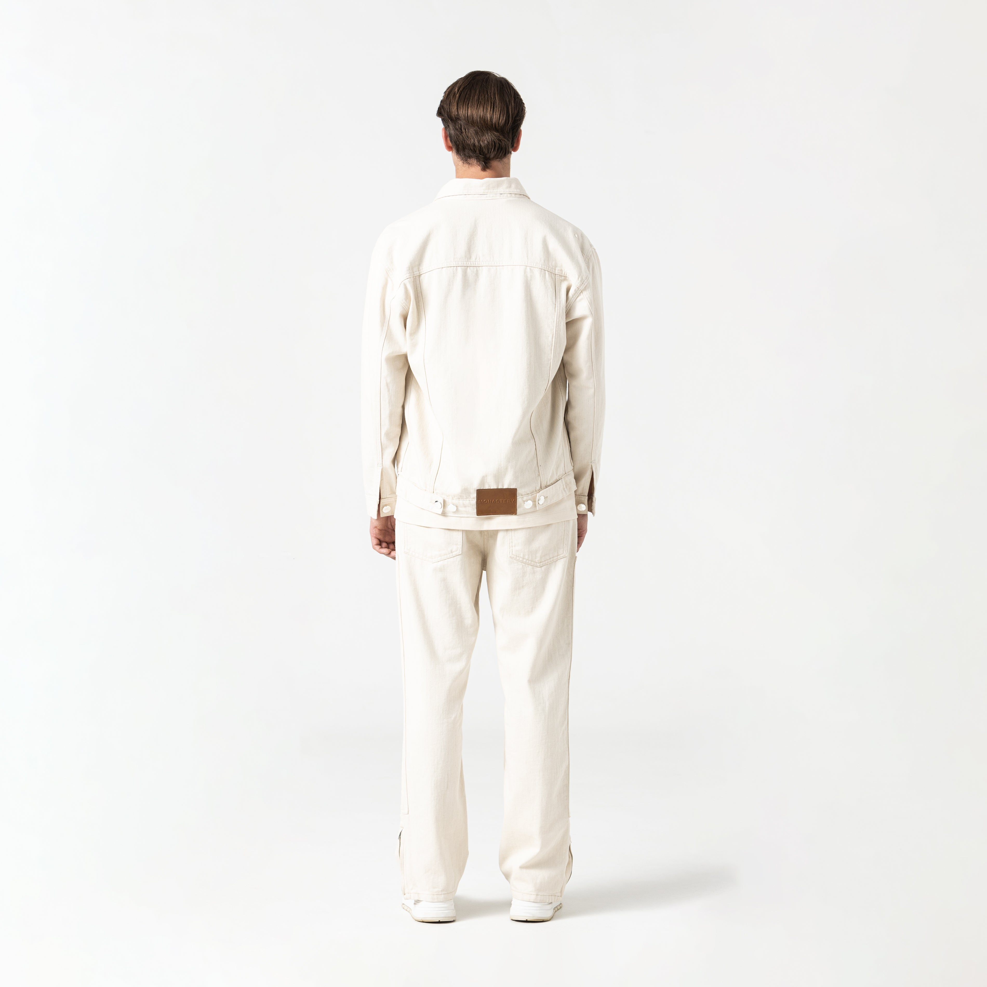 This denim set, featuring a pair of jeans and a jacket in ecru, stands out for its freshness and originality. The jeans have a modern cut, with a fitted yet comfortable silhouette, and their ecru tone provides a fresh and versatile look. Shiny silver metallic finishes stand out in key details, such as buttons, rivets, and visible seams, providing a touch of sophistication and modernity. The jacket, designed to perfectly complement the jeans, has a lightweight yet high-impact structure, with an urban feel, and features innovative details that provide an interesting contrast. The use of shiny silver elements not only highlights the look, but also provides a subtle shine that complements the ecru tone of the denim, giving the garment a contemporary twist. This set is ideal for those seeking a modern and avant-garde style, with a minimalist touch defined by the metallic details, offering a distinct and elegant offering for the brand.