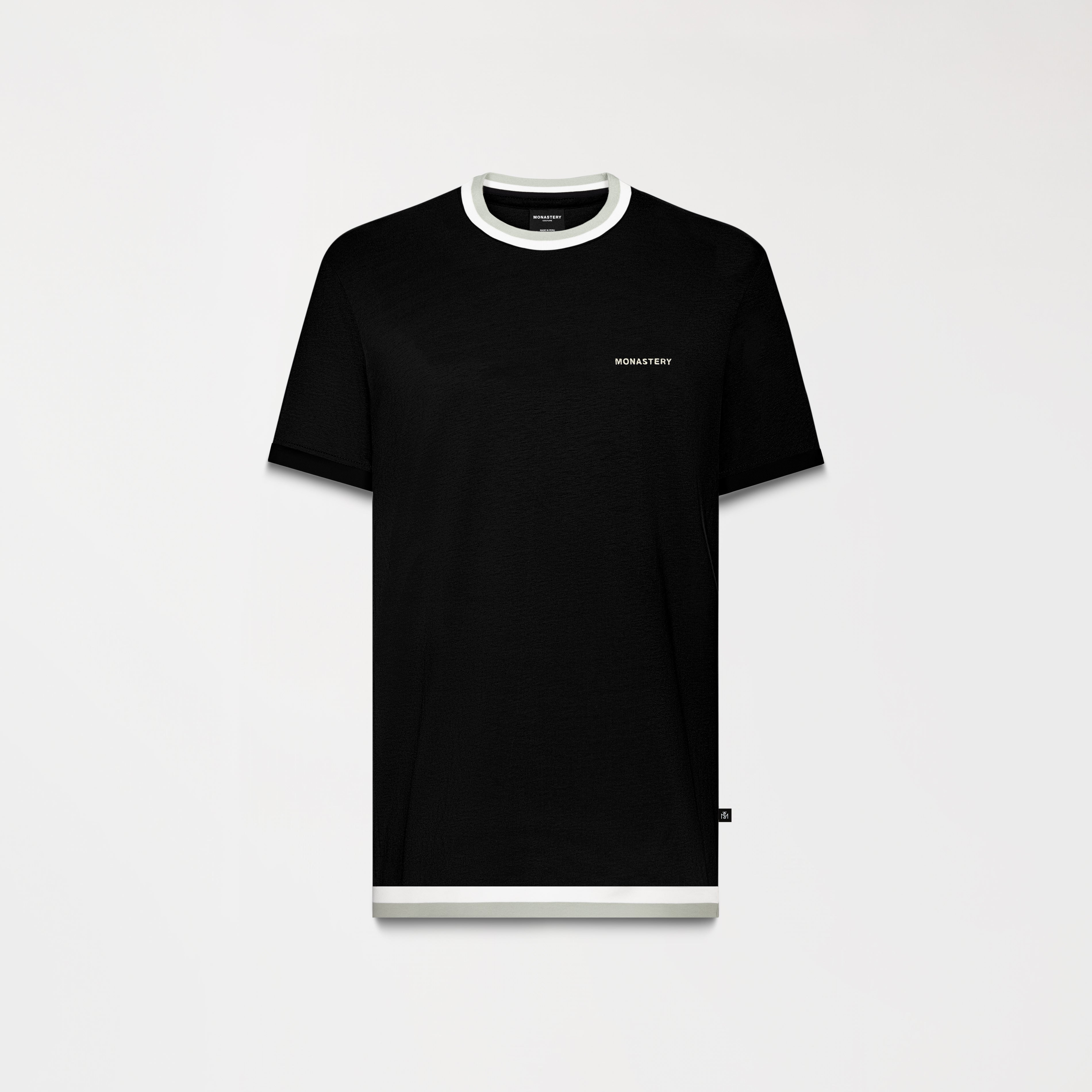 Tarlington black with a regular silhouette and crafted in Monastery cotton, this men's T-shirt offers comfort and style. Its 2.5 cm woven collar and 5 cm woven sash add a distinctive touch. On the front, a sleek heart stitch embroidery highlights, while the back features high-density artwork that creates an eye-catching visual effect. Ideal for a casual, modern look, this top makes a versatile choice for any occasion.