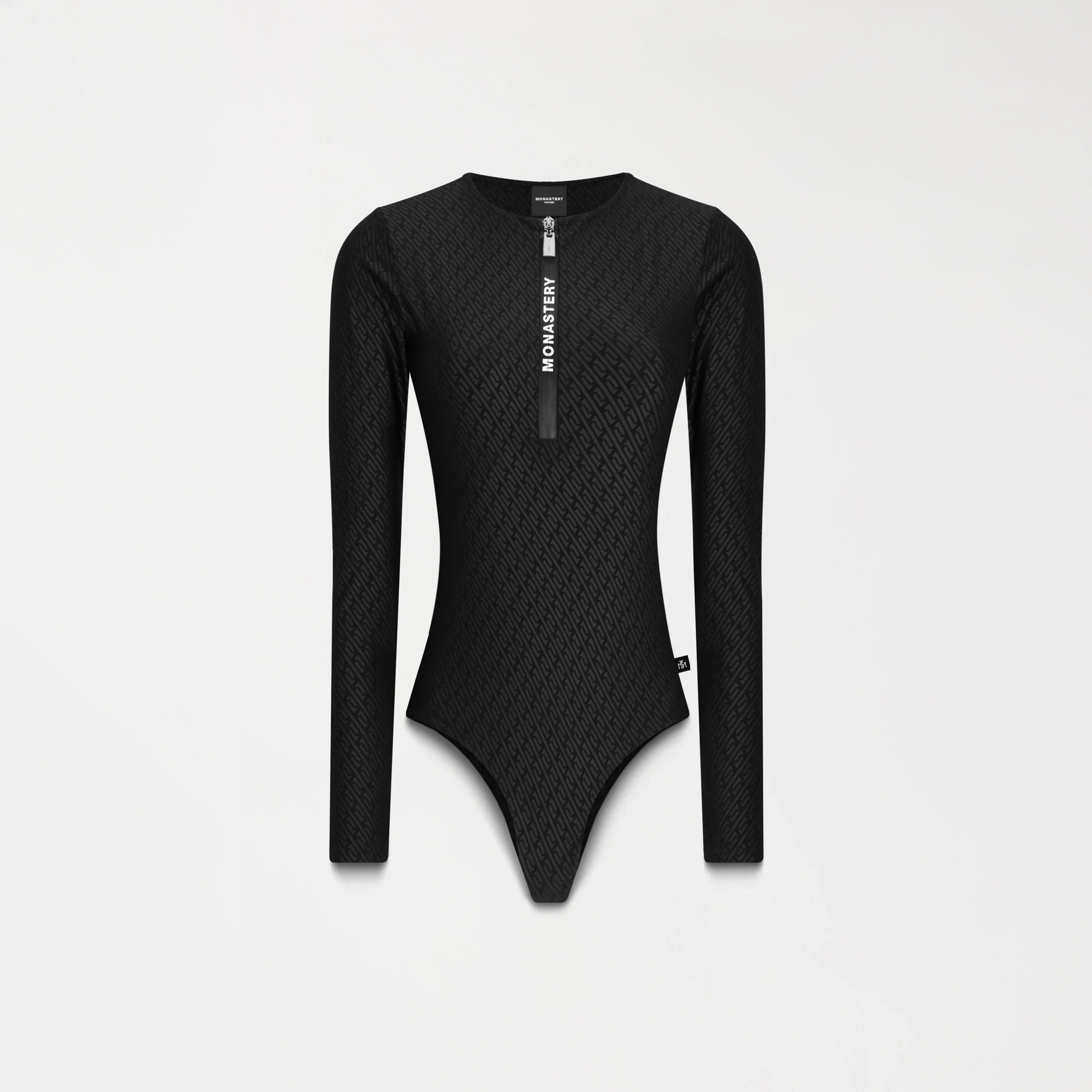 Crafted from exclusive Monastery textured fabric, this bodysuit offers visual depth and a recognizable tactile identity. It features a waterproof, branded front zipper closure, ensuring a functional fit without compromising the design. On the back, a flat print of the signature logo reinforces the garment's graphic presence. A piece designed for movement, style, and attention to detail.