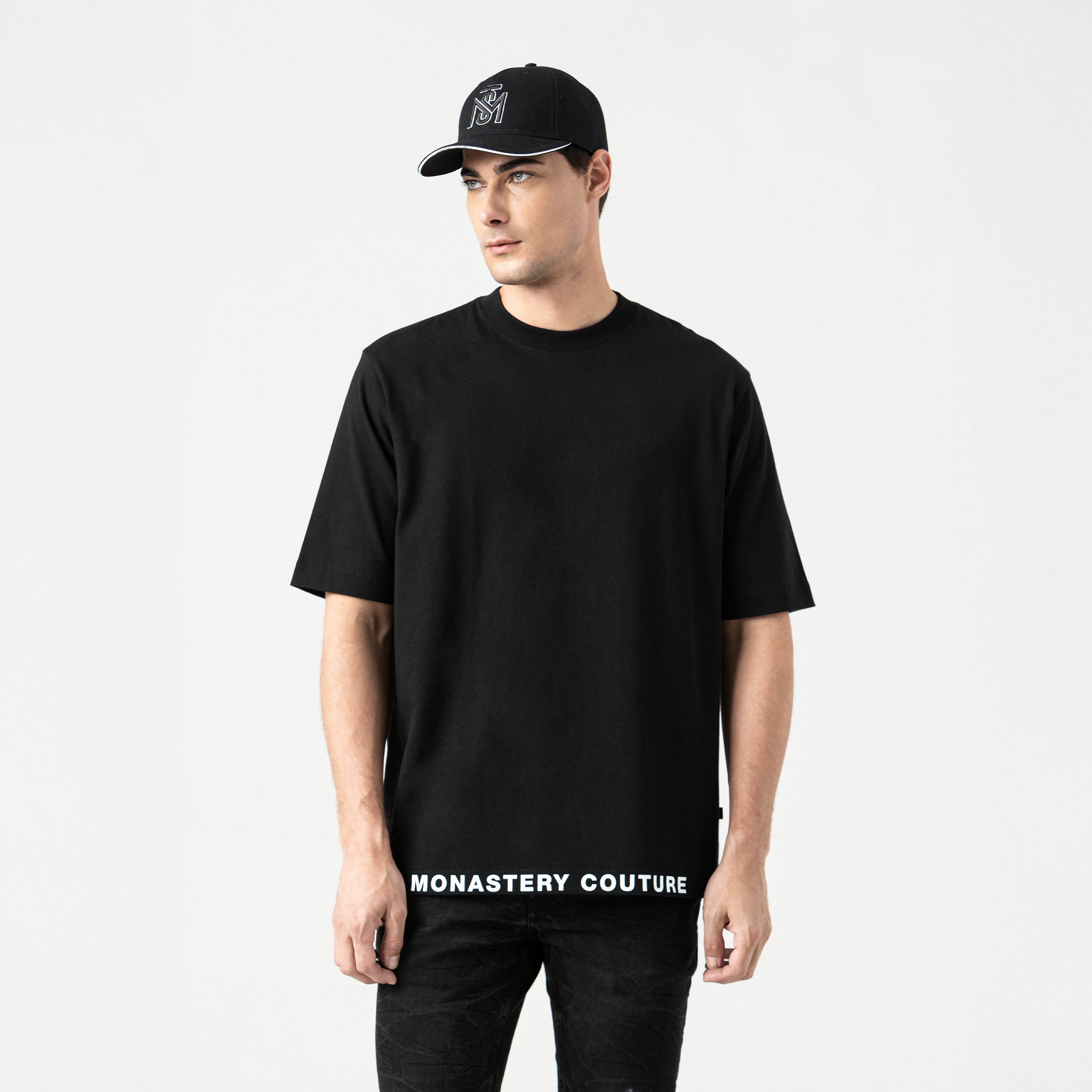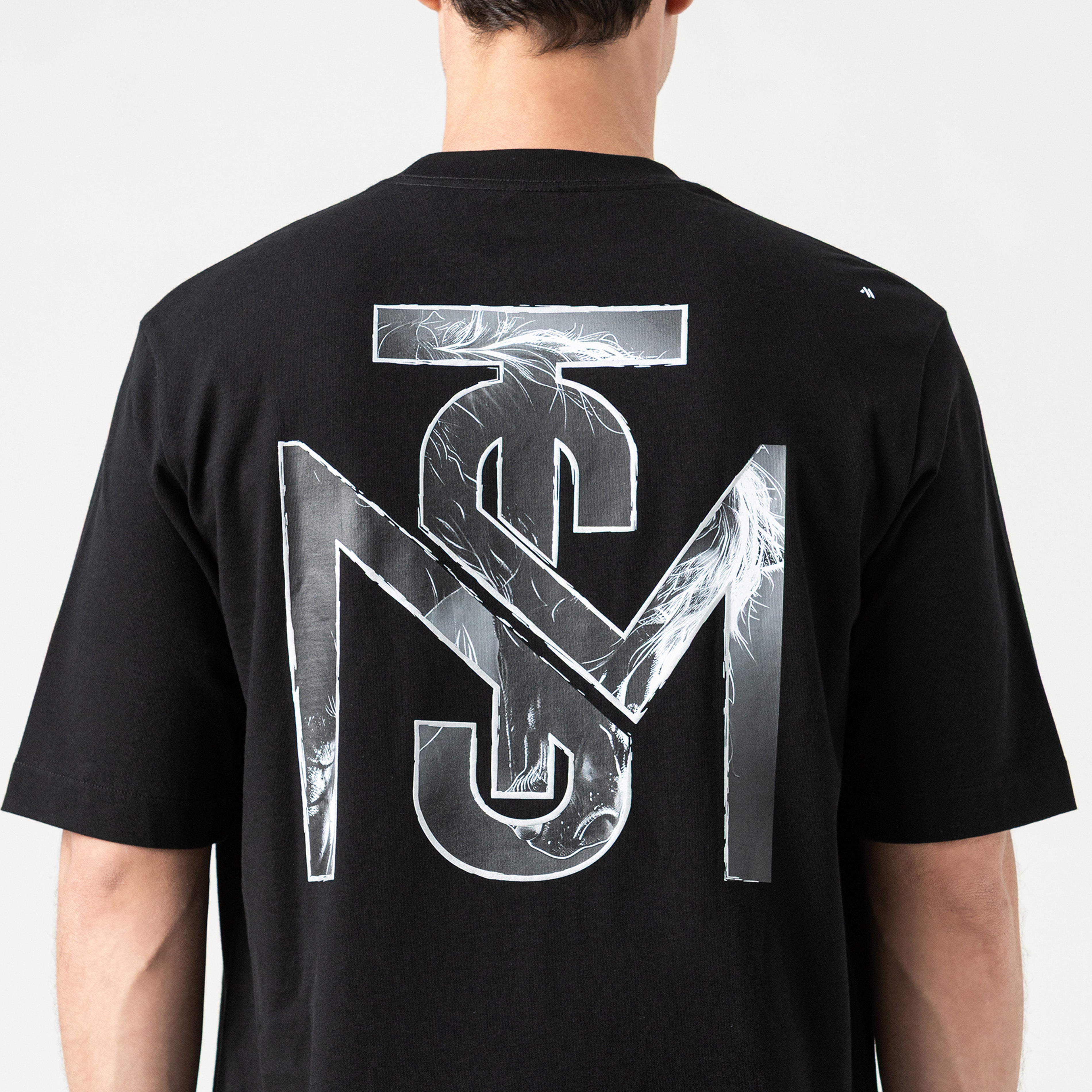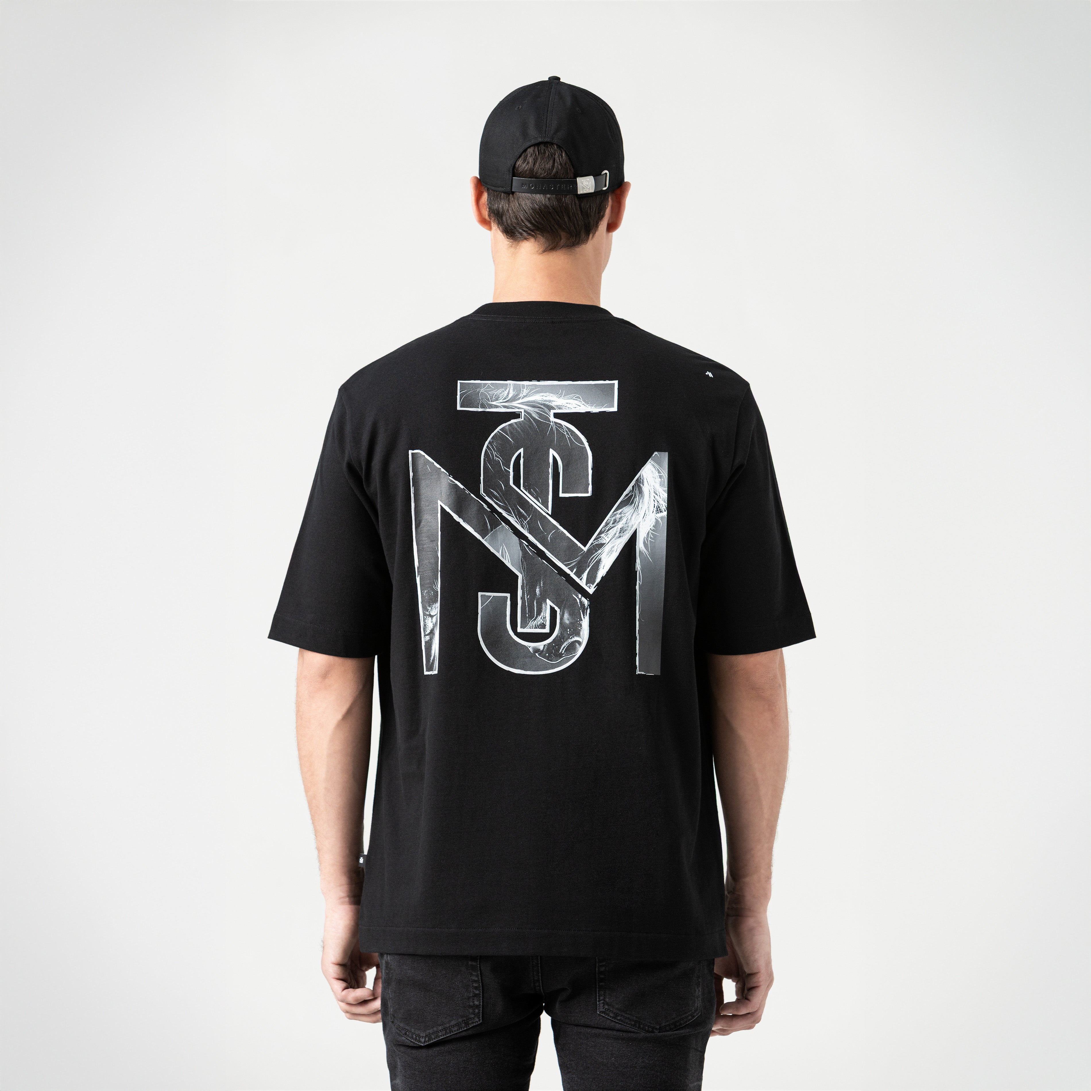 Tucker is a men's t-shirt. With an oversized silhouette, a 2.5 cm ribbed collar, and crafted from 100% Monastery 2 cotton, this t-shirt combines relaxed comfort with high-quality visual execution. On the front, a transfer-style print provides a clean and contemporary finish. The back becomes the focal point with a blend of techniques semi-high, shimmer, and high-density that create depth, shine, and texture in perfect harmony. A piece designed for those who understand that details make the difference, even in everyday life.