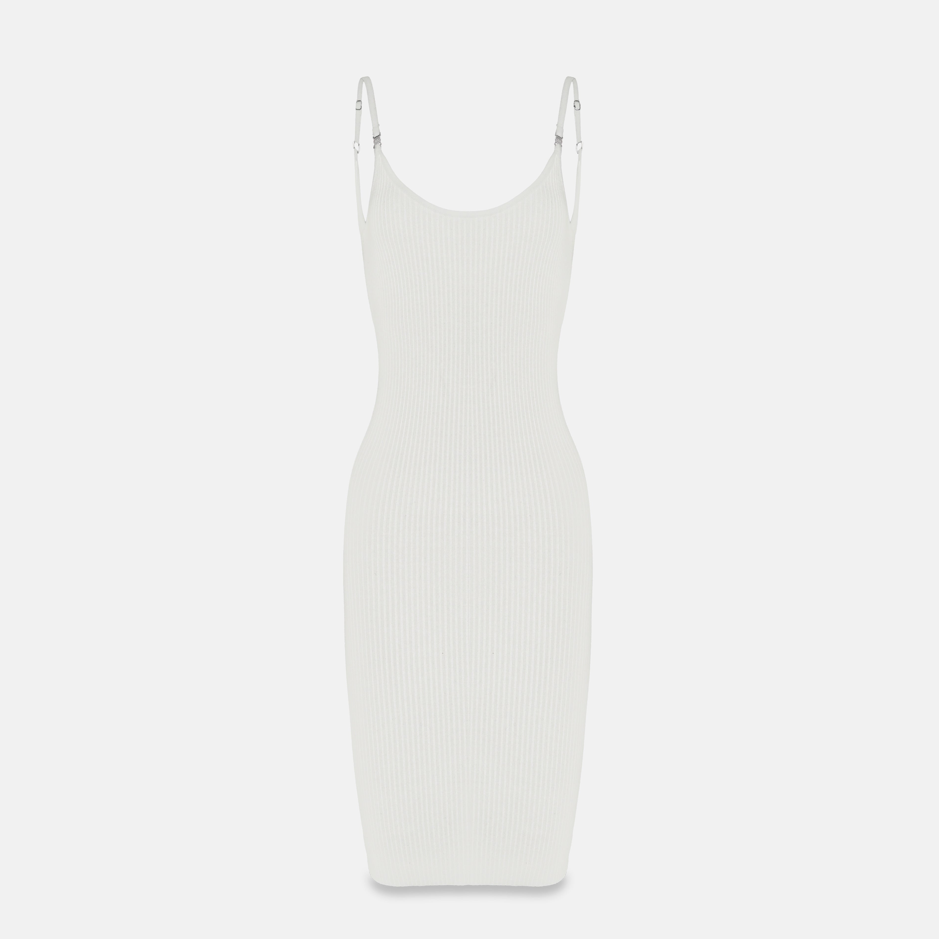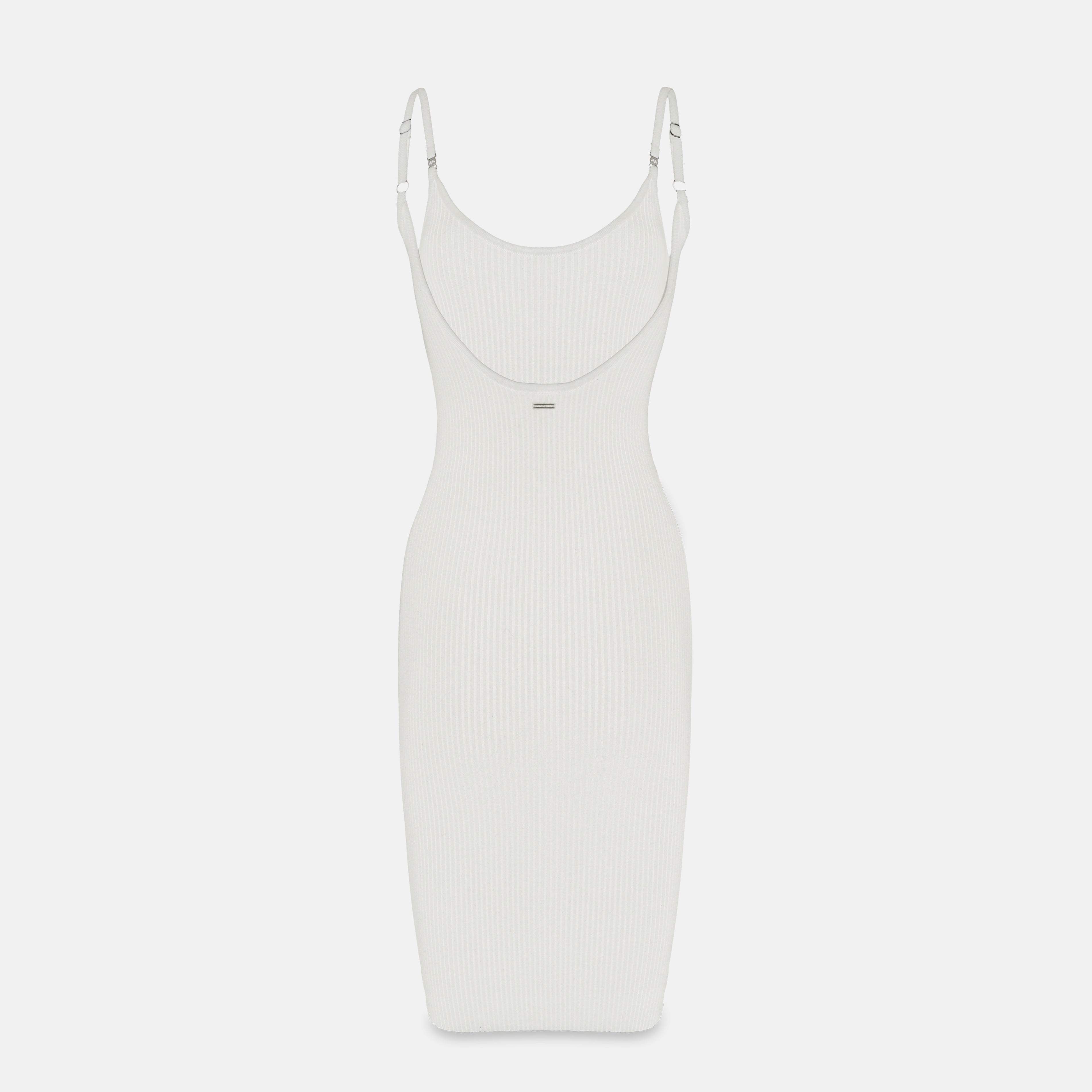 Feminine dress with a fitted silhouette, crafted from an exclusive Monastery fabric that provides structure and a subtle texture that stylizes the figure. Available in three shades—black, white, and Irish Cream, the collection's signature color. It features contrasting straps that reinforce the brand's identity and a deep back neckline, adorned with a metallic plaque that adds a sensual and contemporary touch. Its body-hugging fit makes it a versatile piece, ideal for casual looks with refined elegance.