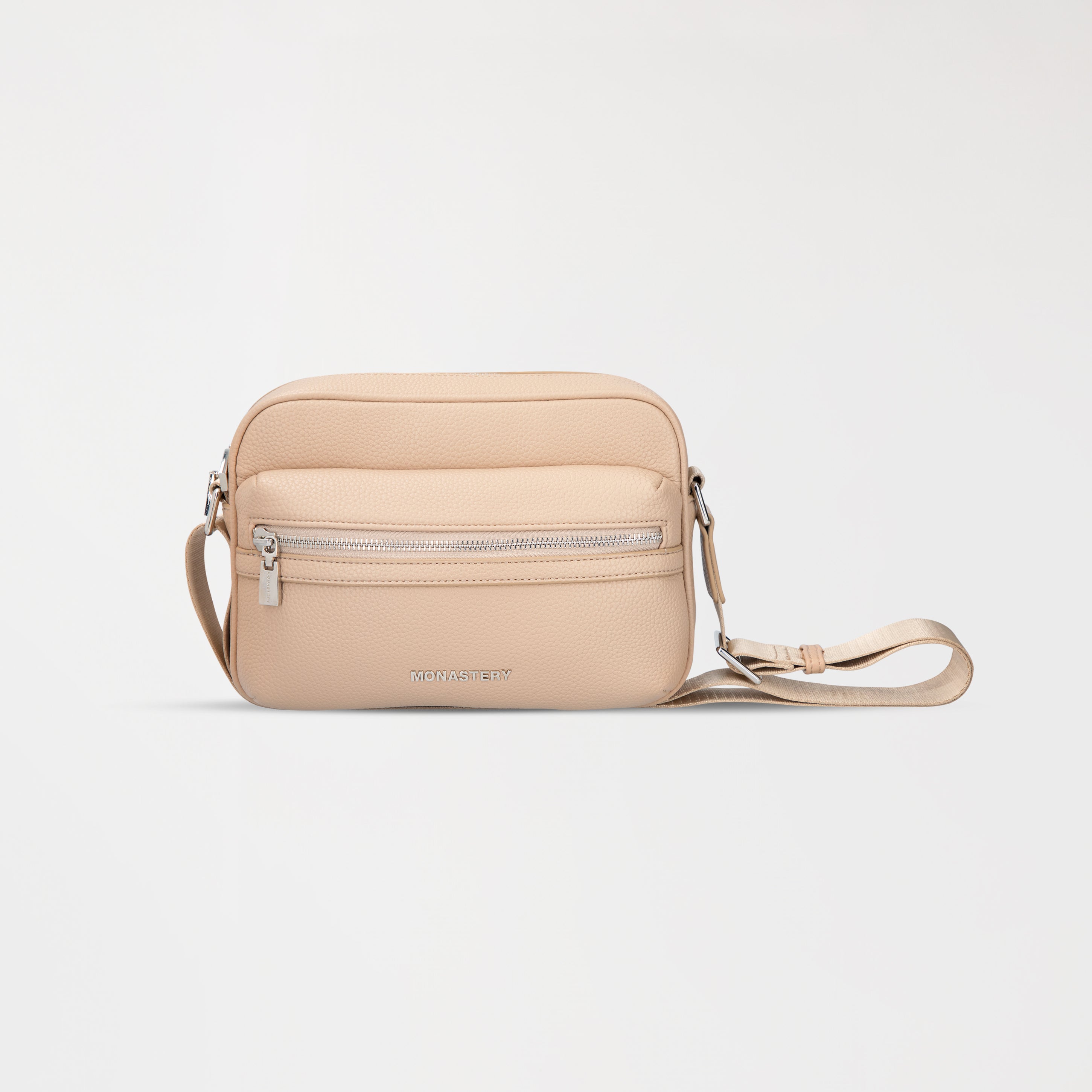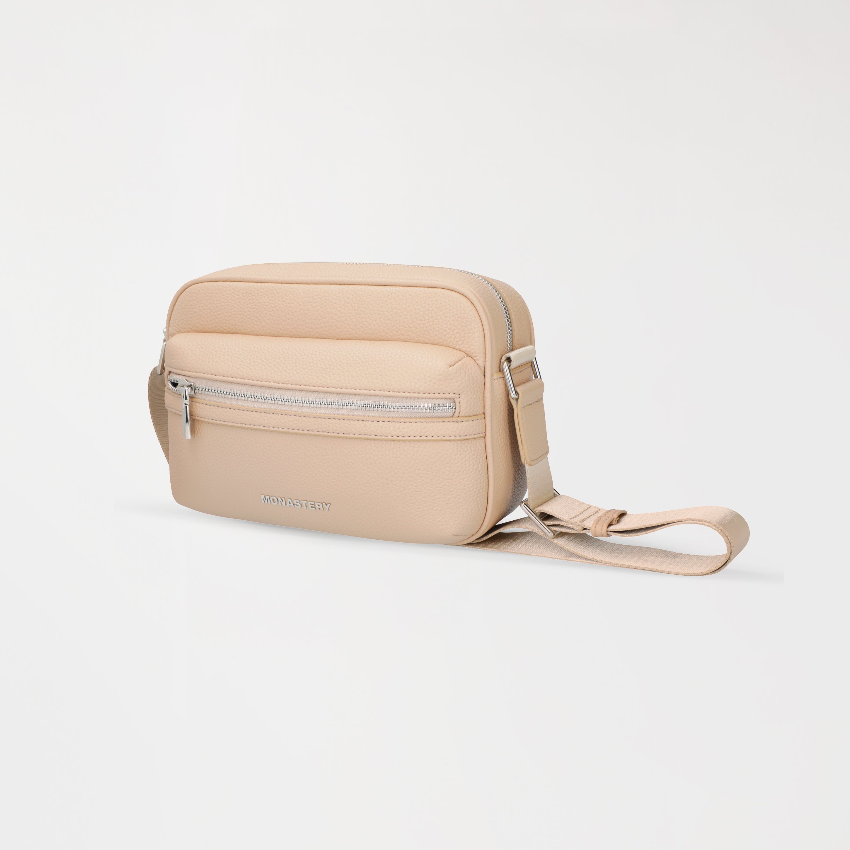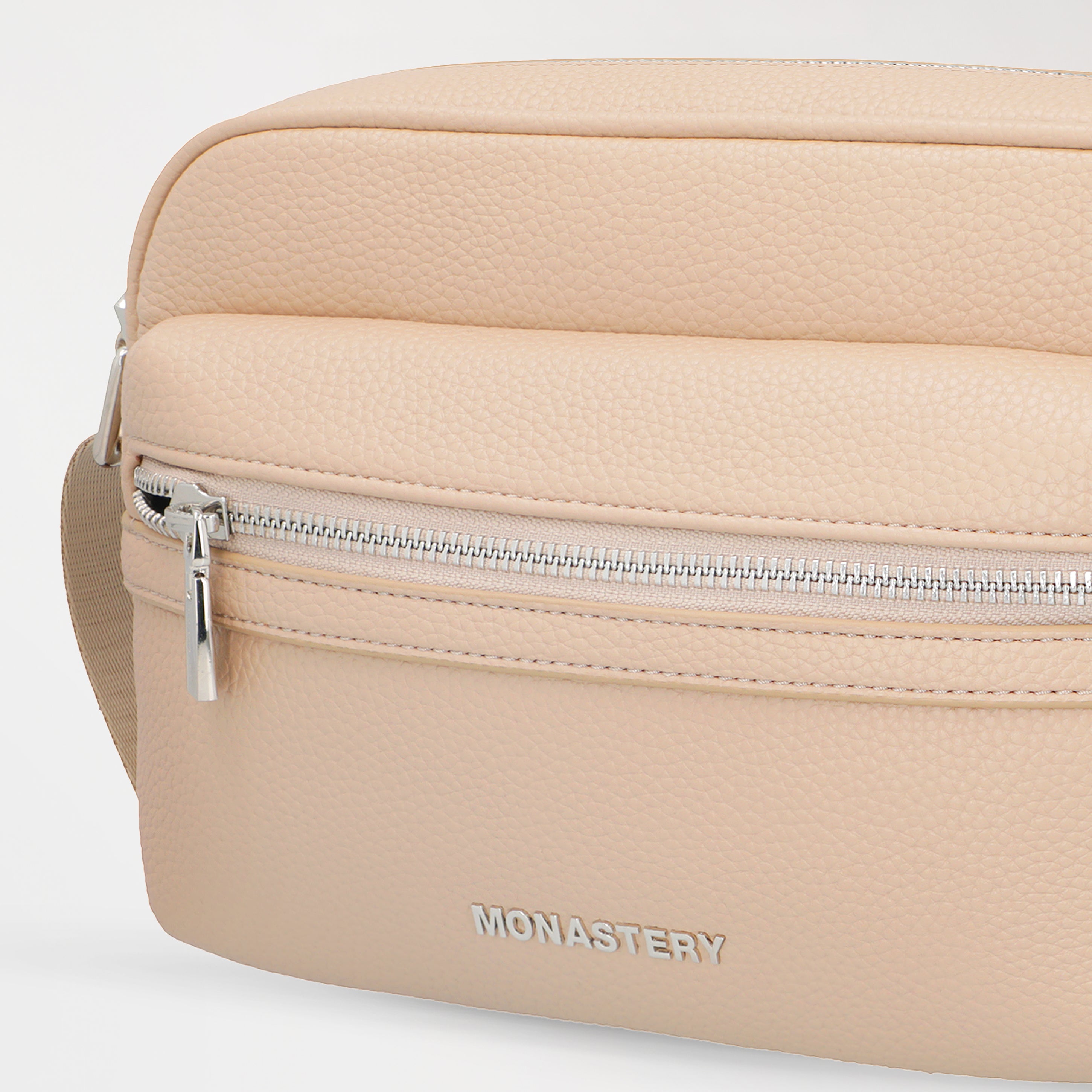 The contrasting straps allow for a comfortable fit, while the contrasting metallic hardware reinforces its exclusive character. On the front, the MONASTERY logo in metallic appliqué provides an elegant and distinctive visual signature that elevates the overall design of the piece.